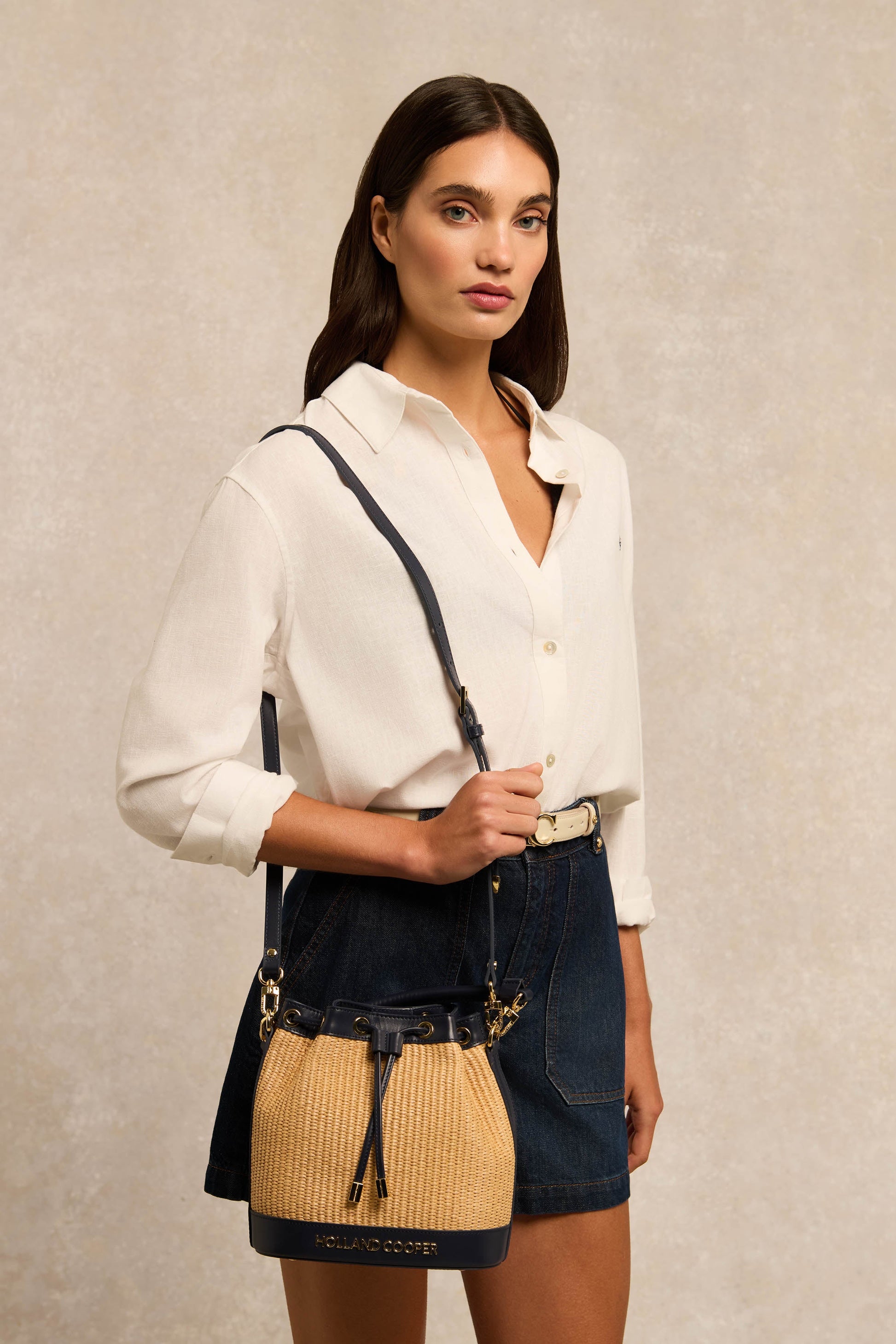 This exquisitely detailed accessory features a harmonious blend of navy leather trim and artisanal rattan weaving. creating a refined summer silhouette. The versatile design offers both an elegant top handle and a removable long strap for multiple styling options. Meticulously finished with polished branded rivets and signature hardware. The spacious interior. lined in pure cotton. provides ample room for daily essentials while maintaining its structured appeal.