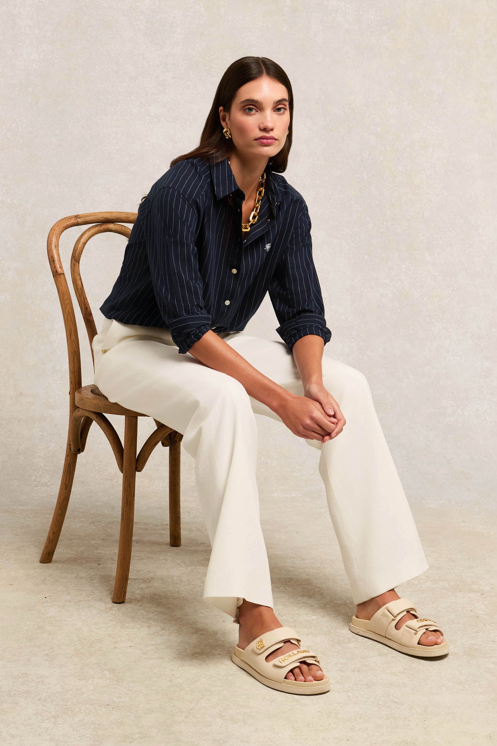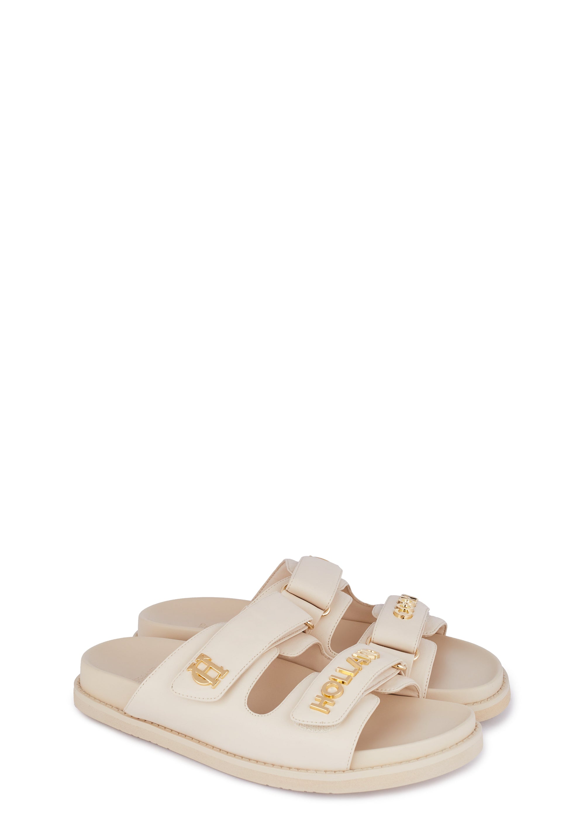 Effortlessly refined. the Abbot Slide embodies casual luxury. Crafted from premium PU materials. these sophisticated slides feature our signature gold lettering and distinguished HC pin detailing. The plush padded footbed ensures superior comfort. while the cream