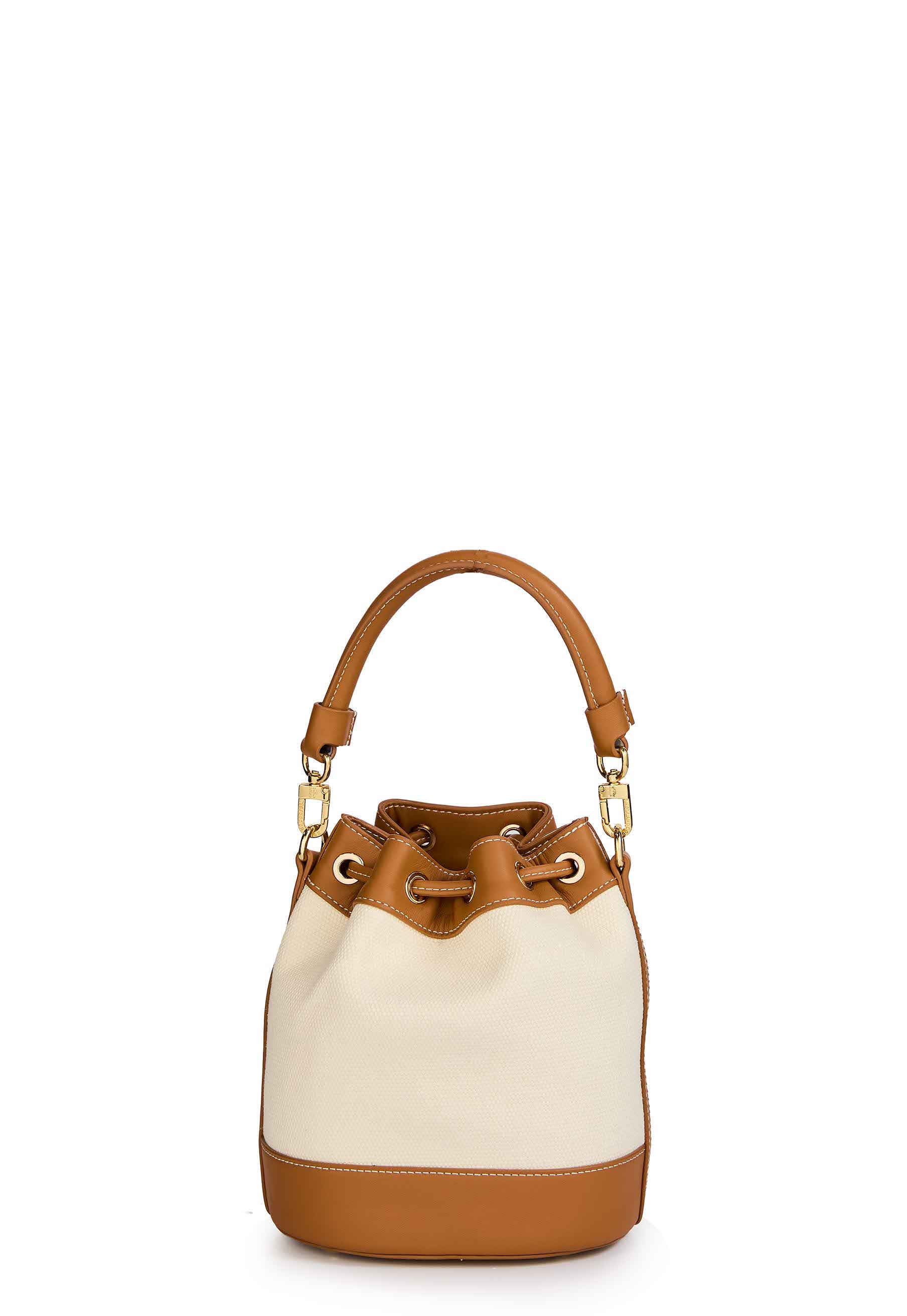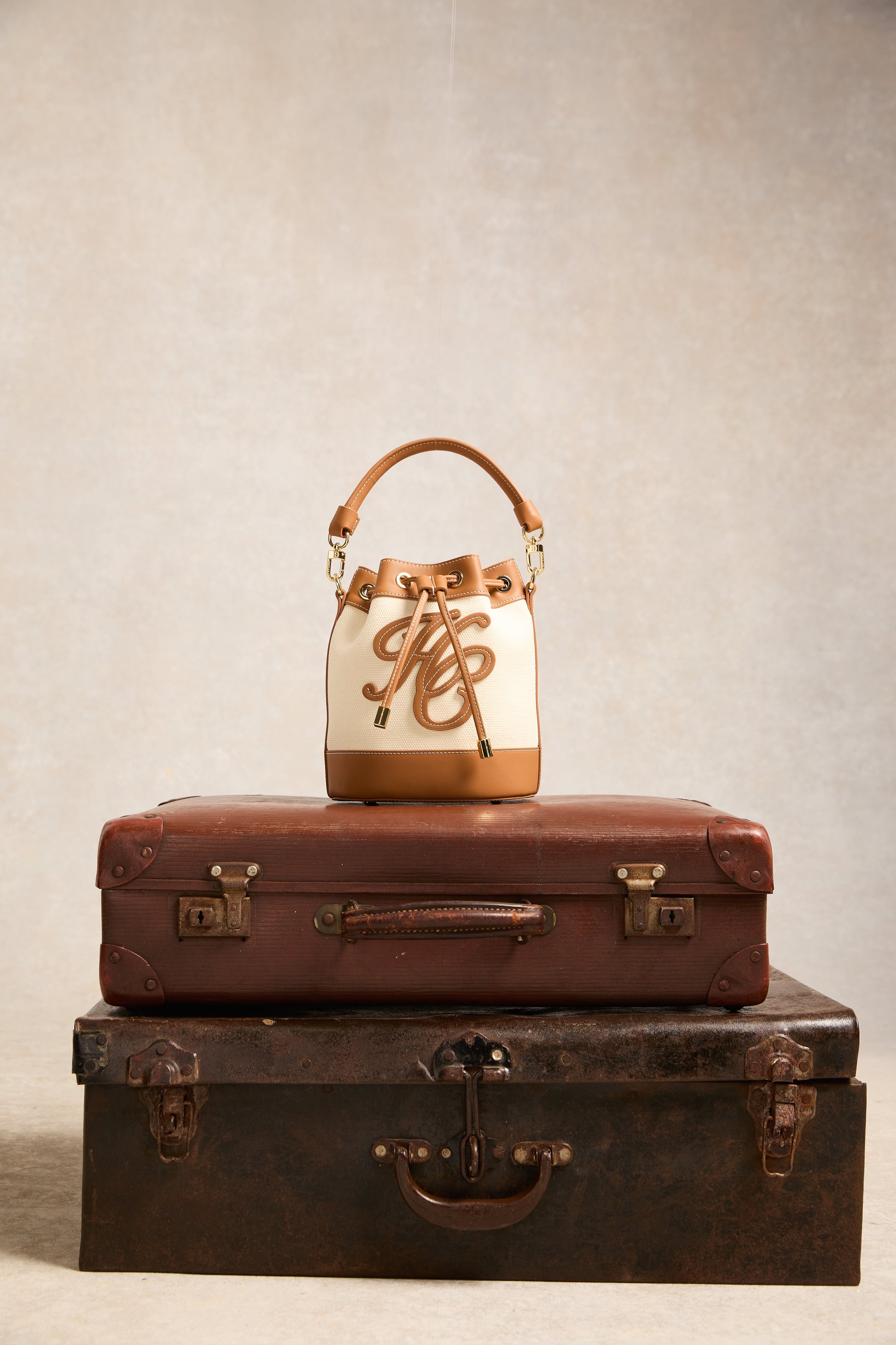 The Amalfi Bucket Bag embodies effortless sophistication. crafted from premium canvas with luxurious tan leather trim. This miniature masterpiece showcases our signature attention to detail with chunky contrast stitching and our distinctive leather patch. The fully adjustable strap features our iconic gold-toned hardware and aglets. elevating this everyday essential.