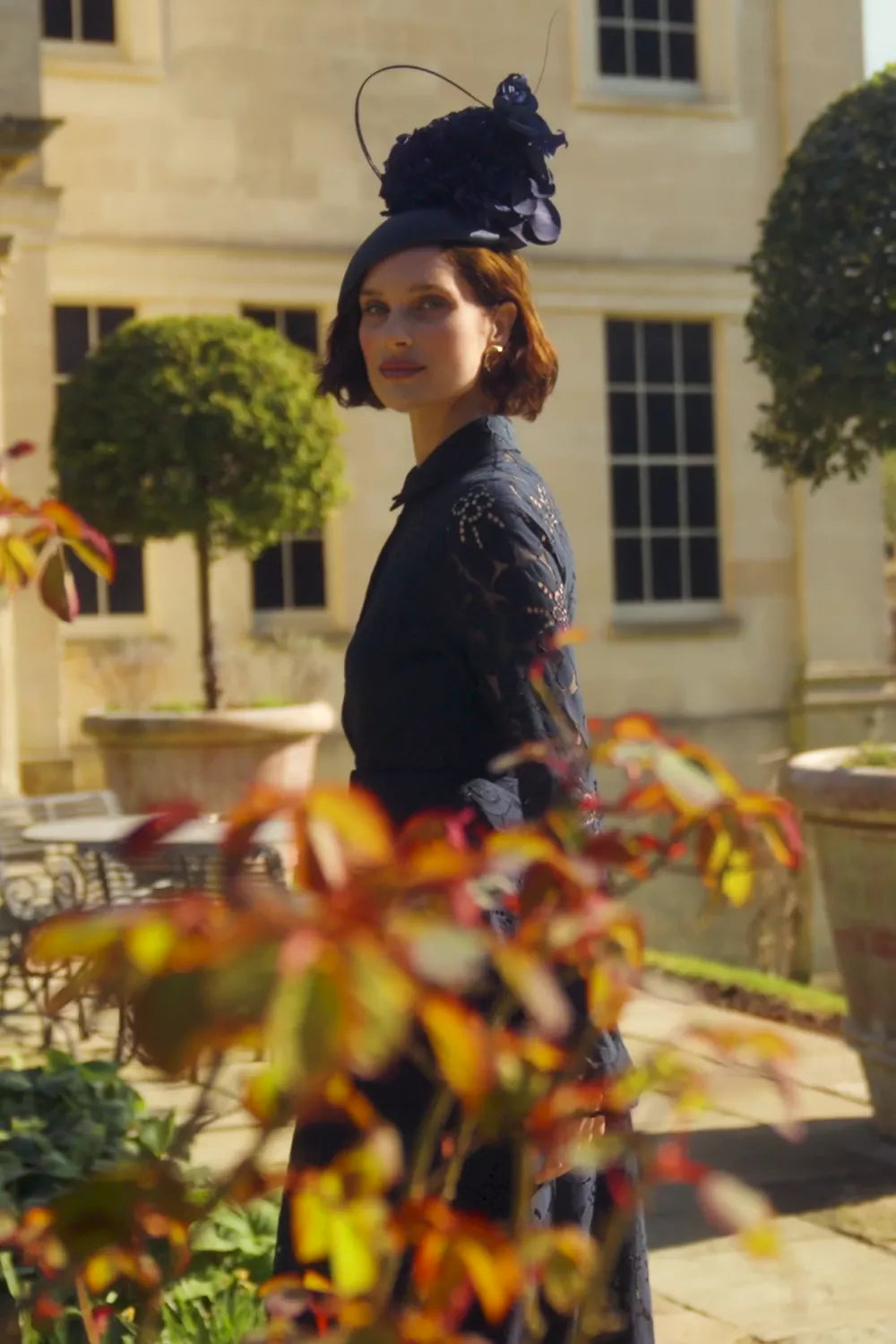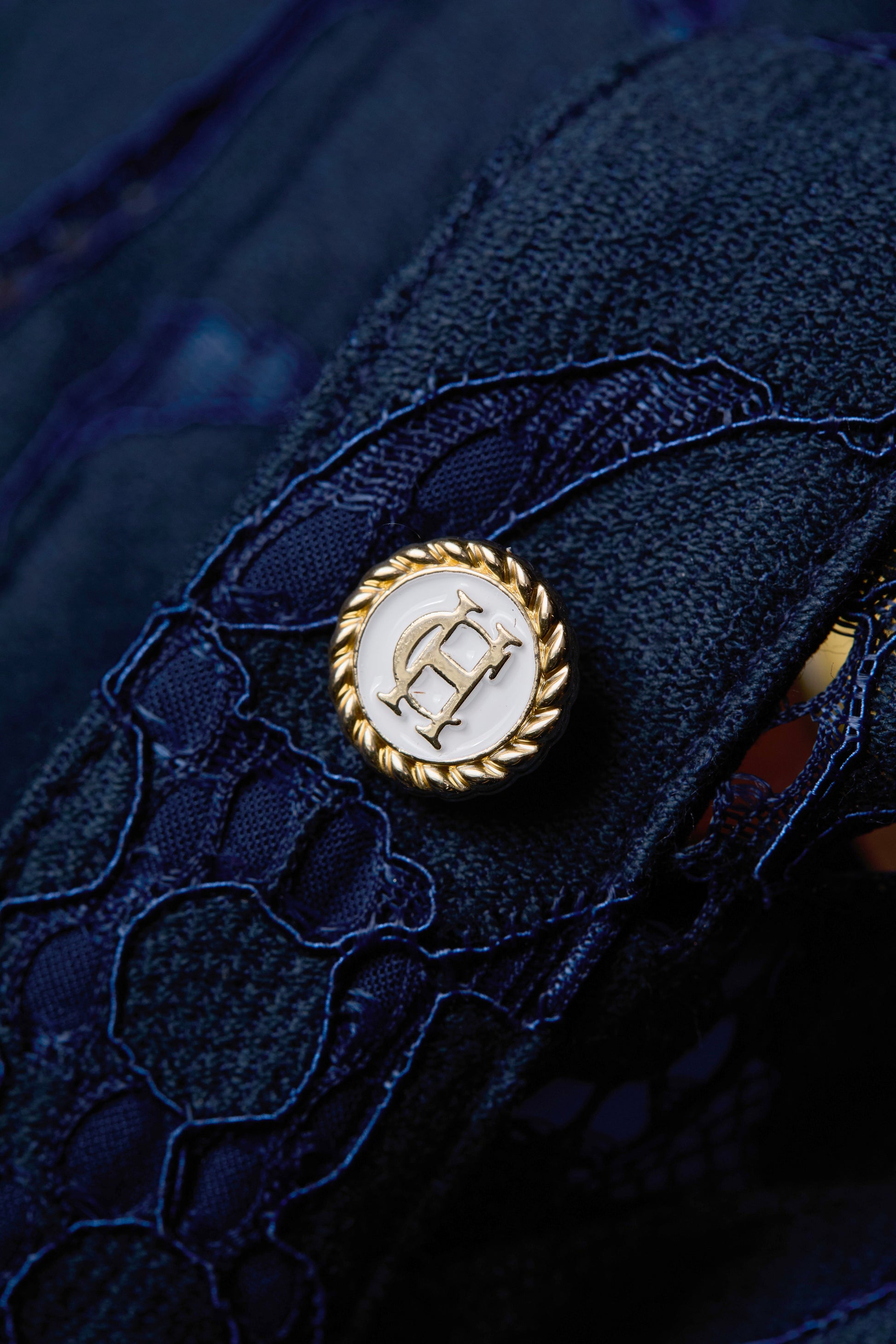 Crafted from a large-scale floral cotton blend lace. the dress is fully lined through the lower body and skirt for effortless wearability. Thoughtful details like princess seams. a self-fabric belt at the waistline. and a button-down placket with signature gold enamel buttons enhance its tailored finish.