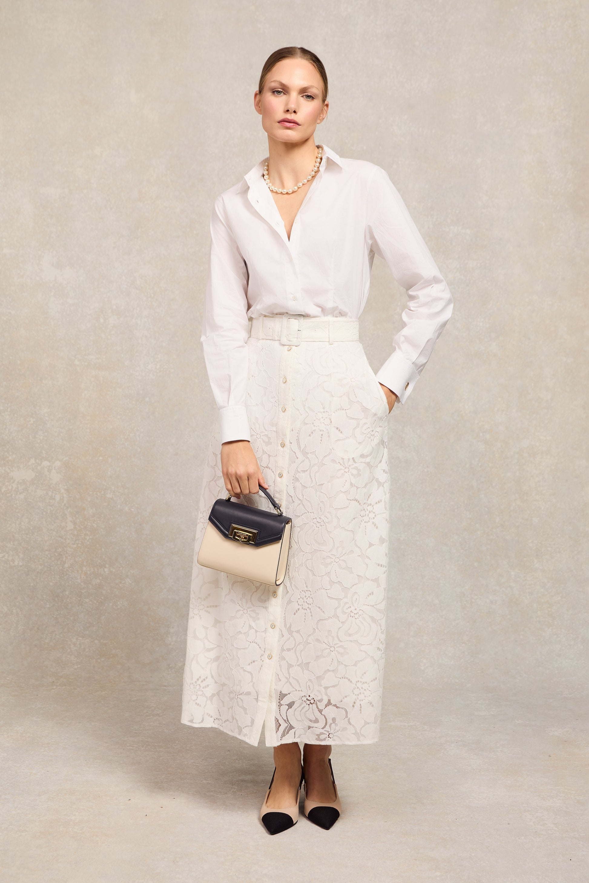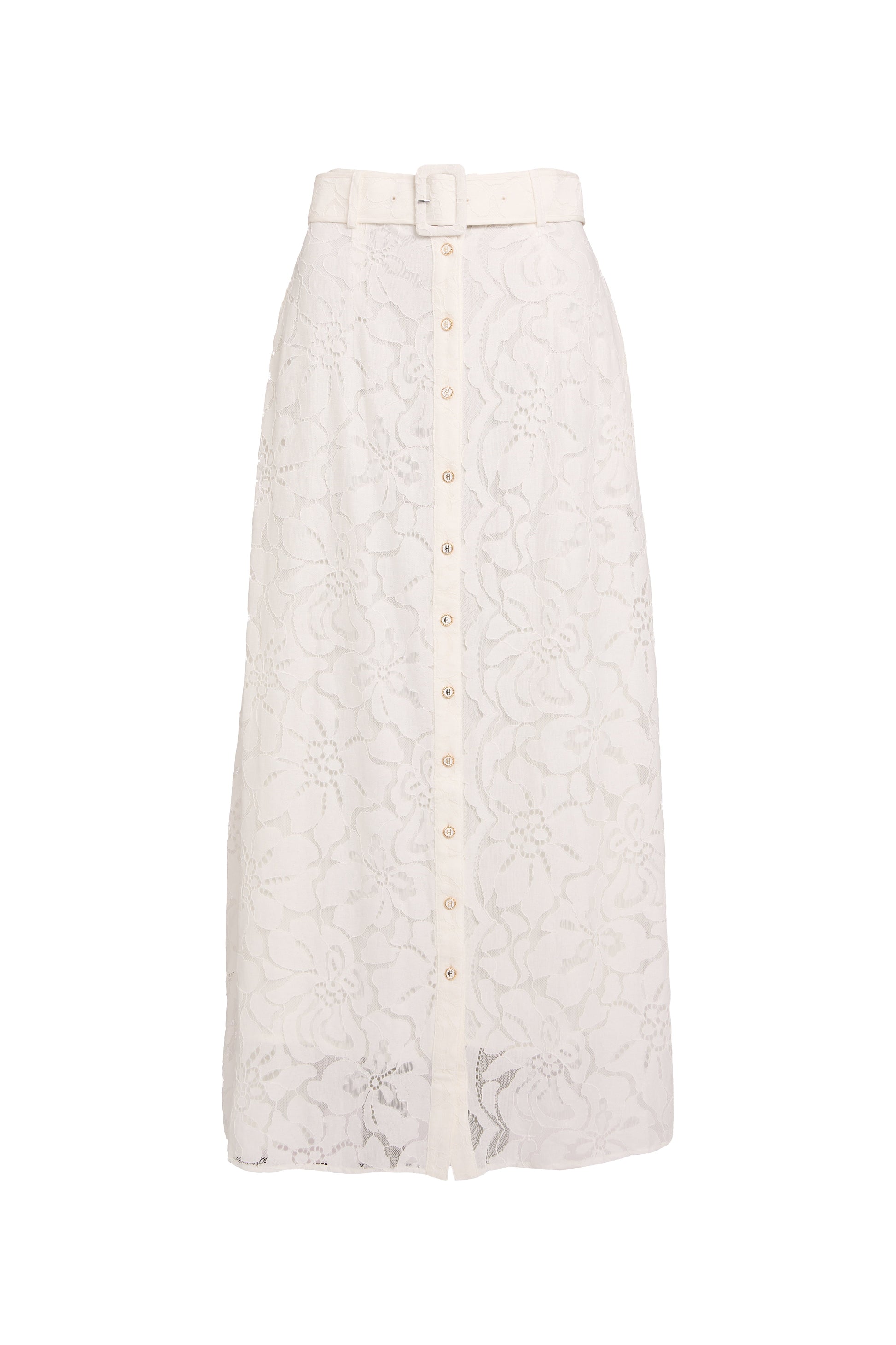 The self-fabric belt with piped edges and a lace-covered buckle accentuates the waist. adding a tailored touch to this romantic piece. Finished with a central placket closure adorned with lace-covered buttons. the Annabelle Lace Skirt is the epitome of refined craftsmanship and effortless sophistication.