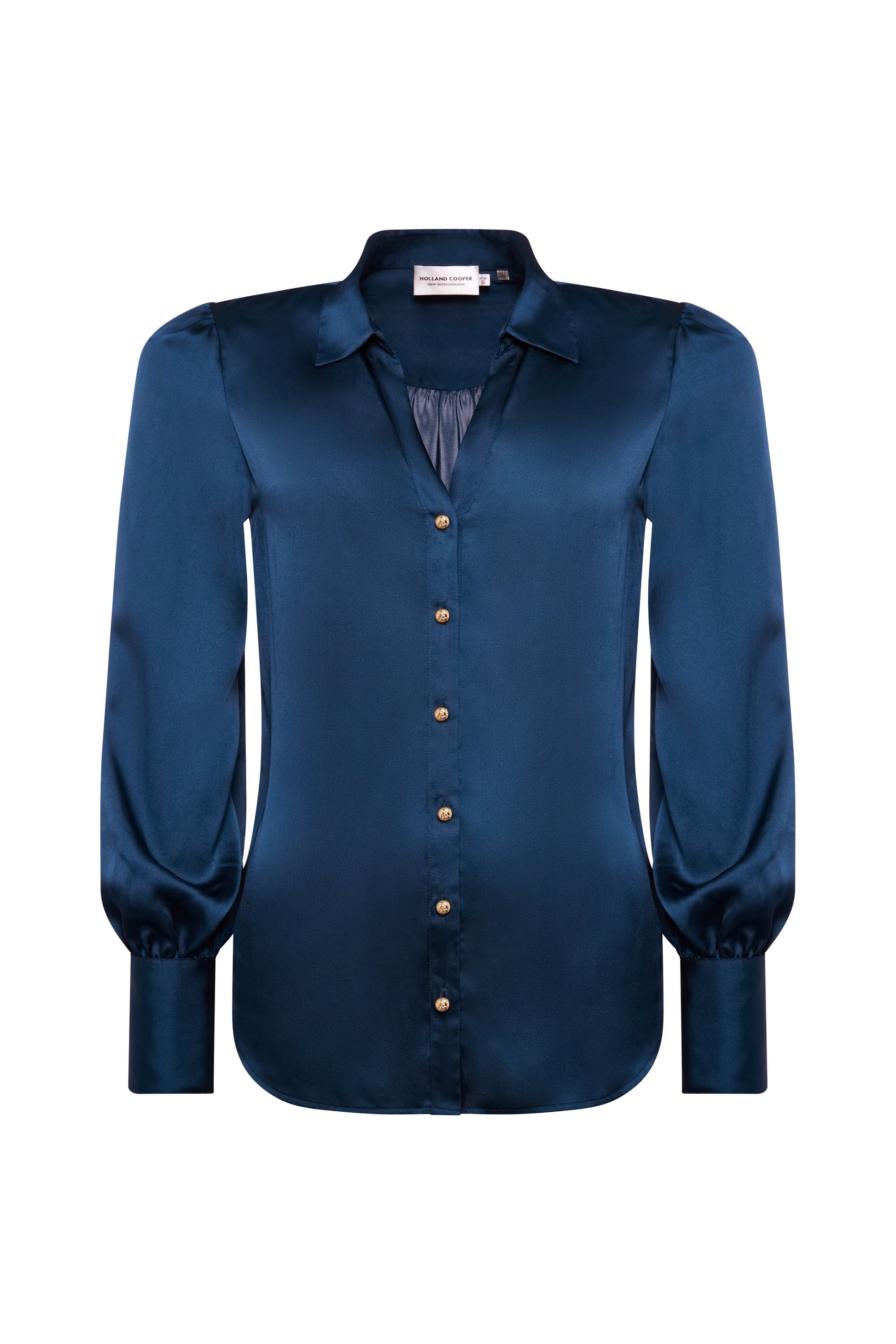 A timeless style reimagined with feminine detailing. the Annie V-Neck Shirt is crafted with a fluid satin finish for a refined. polished look. Designed with a classic collar and v-neckline that flows into a button-down placket. it features full gathered sleeves for an elegant silhouette. A V-shaped back yoke with delicate gathering enhances the fit. while monogram HC embroidery at the cuff and a signature gold HC pin complete the piece with subtle luxury.