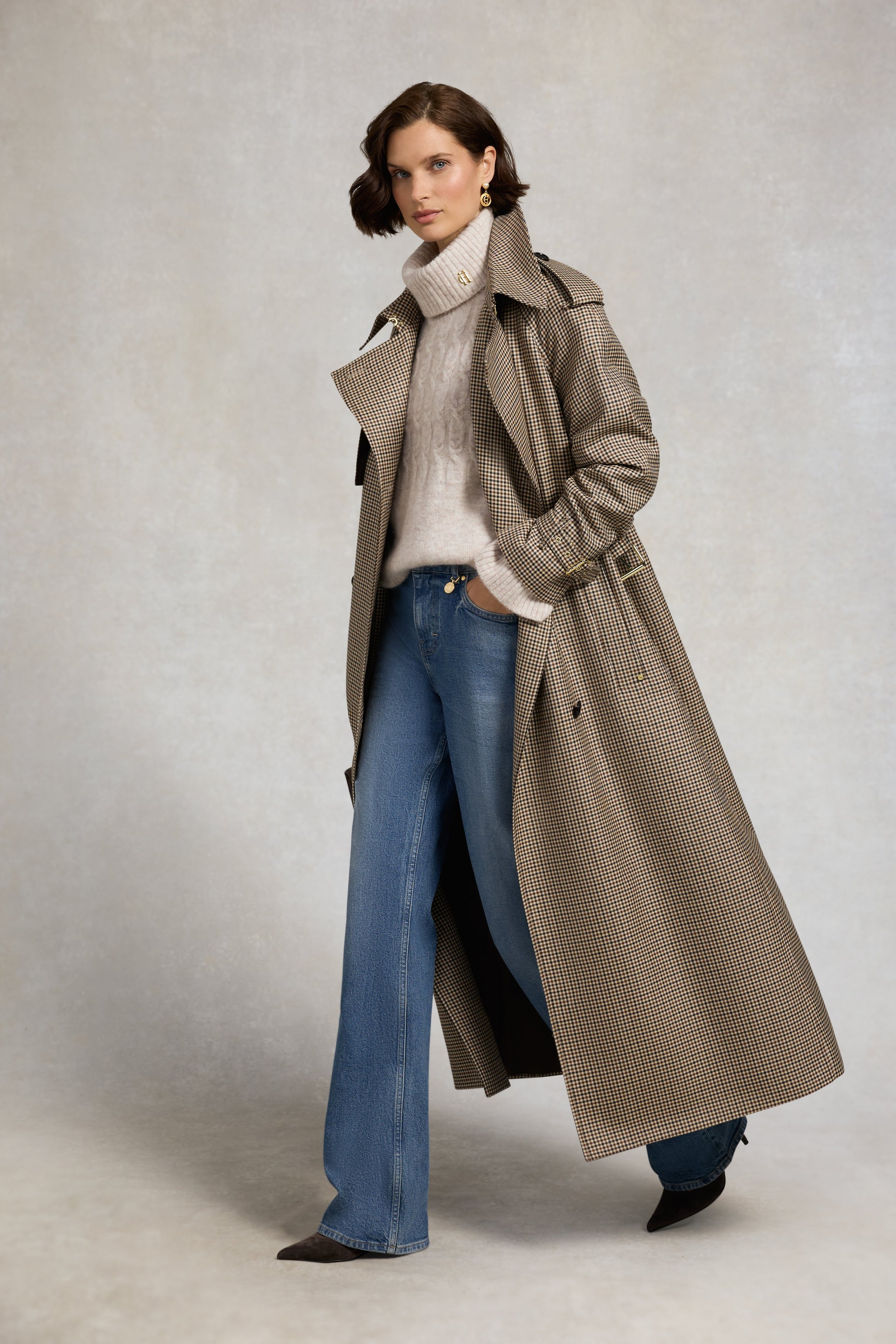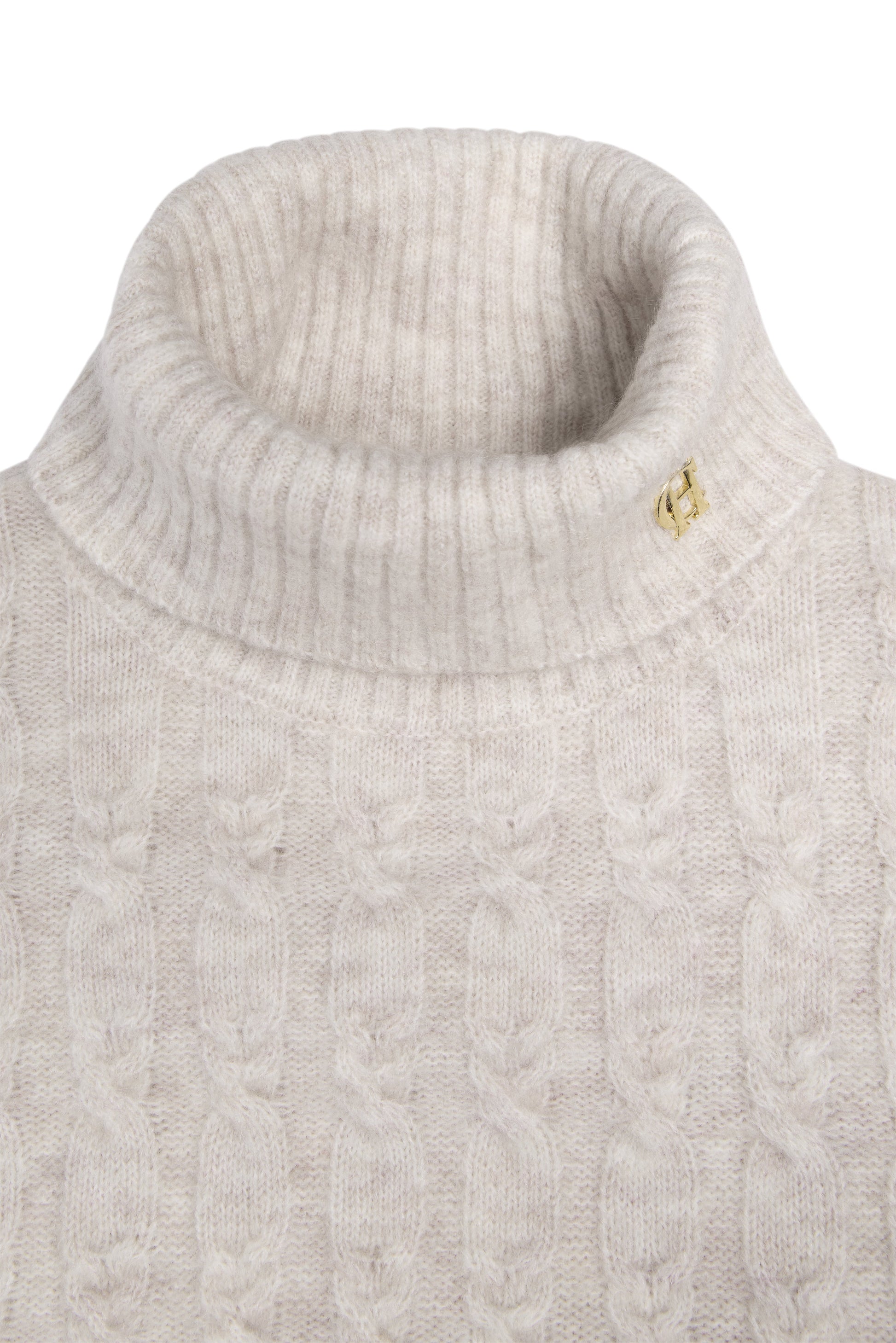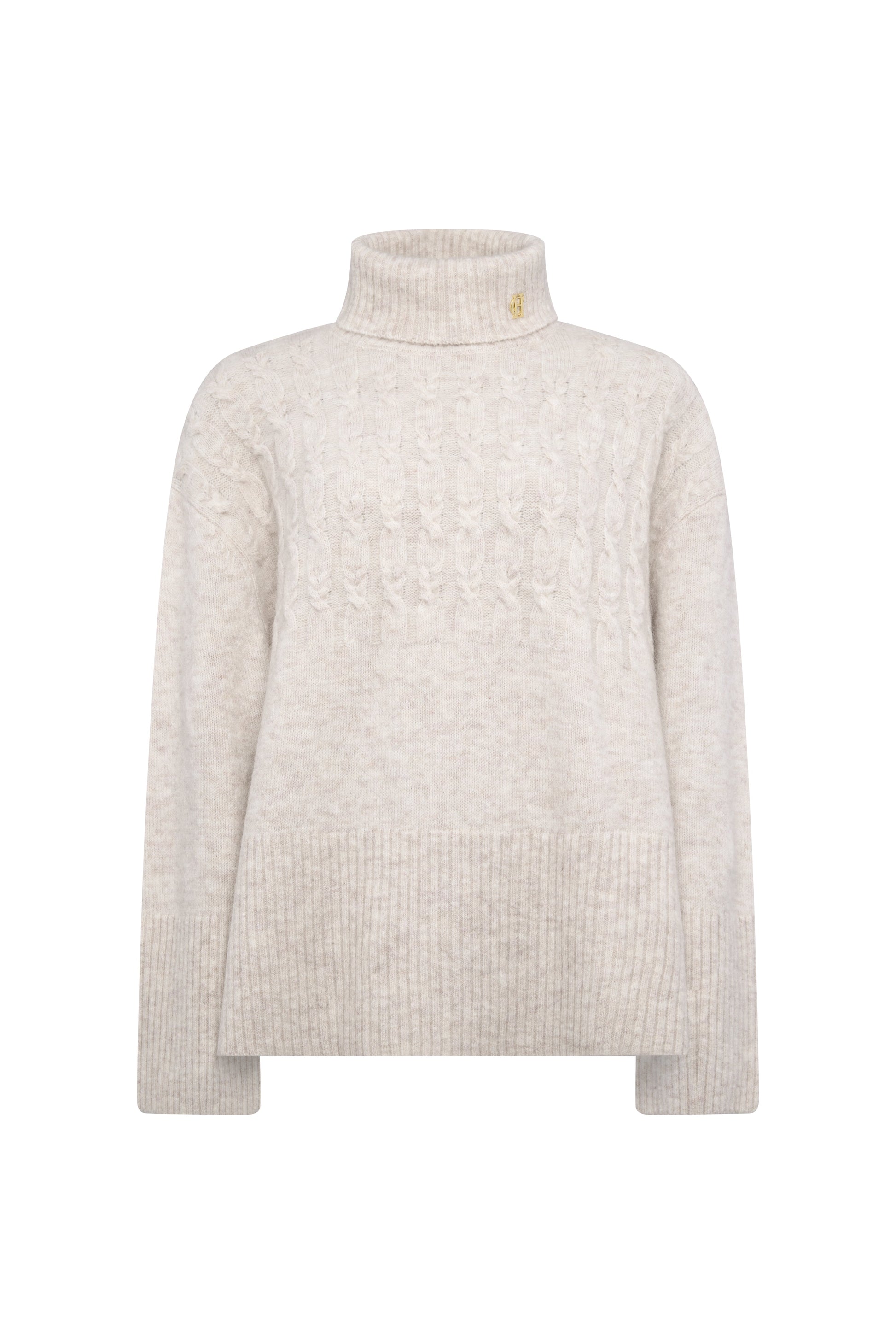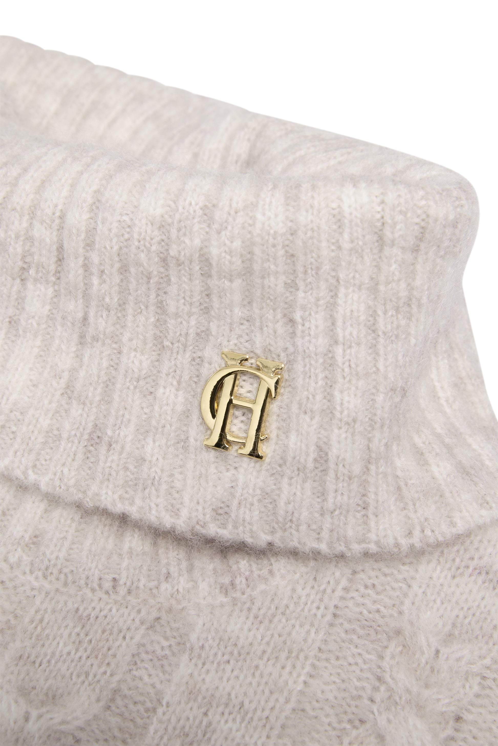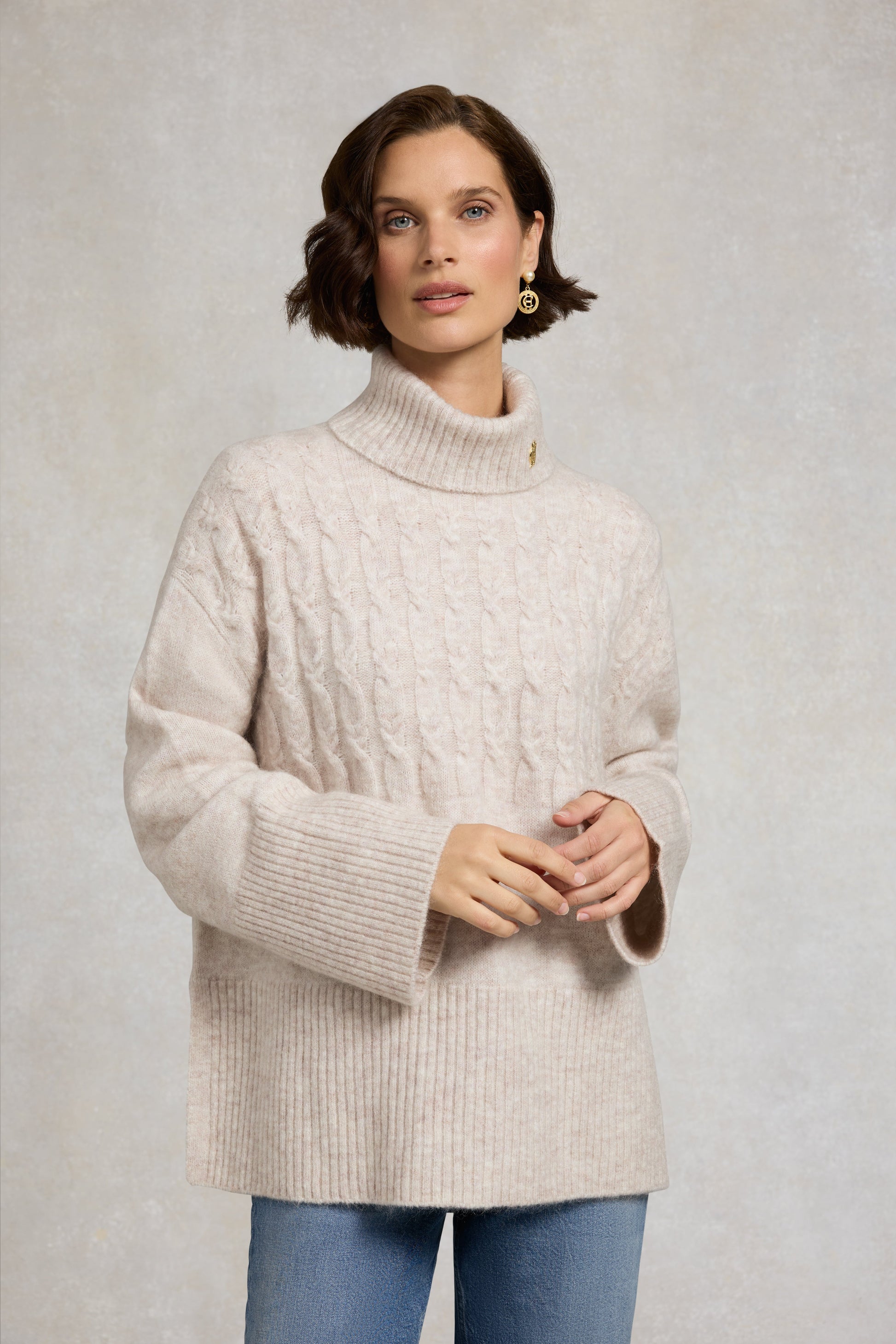 The Antonia Cable Roll Neck combines relaxed luxury with effortless style. Crafted from a soft mohair blend. it features an oversized fit. drop shoulder sleeves. and ribbed detailing at the neck. cuffs. and hem. Subtle cabling across the upper body adds texture. while a signature HC plaque at the roll neck completes the elevated design. Easy-care and versatile. this knit is perfect for layering or wearing as a standalone statement piece throughout the season.