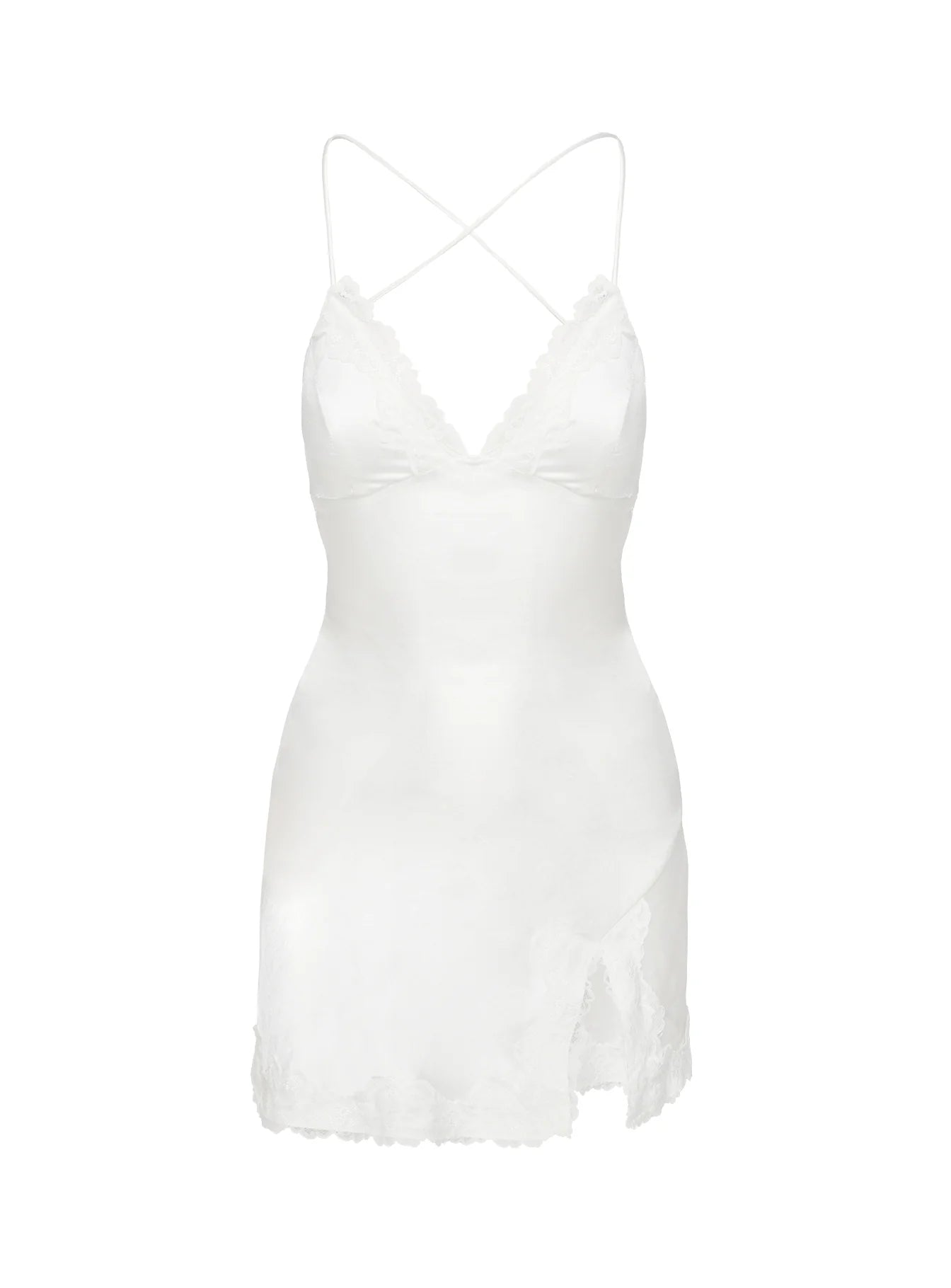 - Silky material. v neckline. adjustable straps with tie fastening at back. lace trim detail. split hem. invisible zip fastening