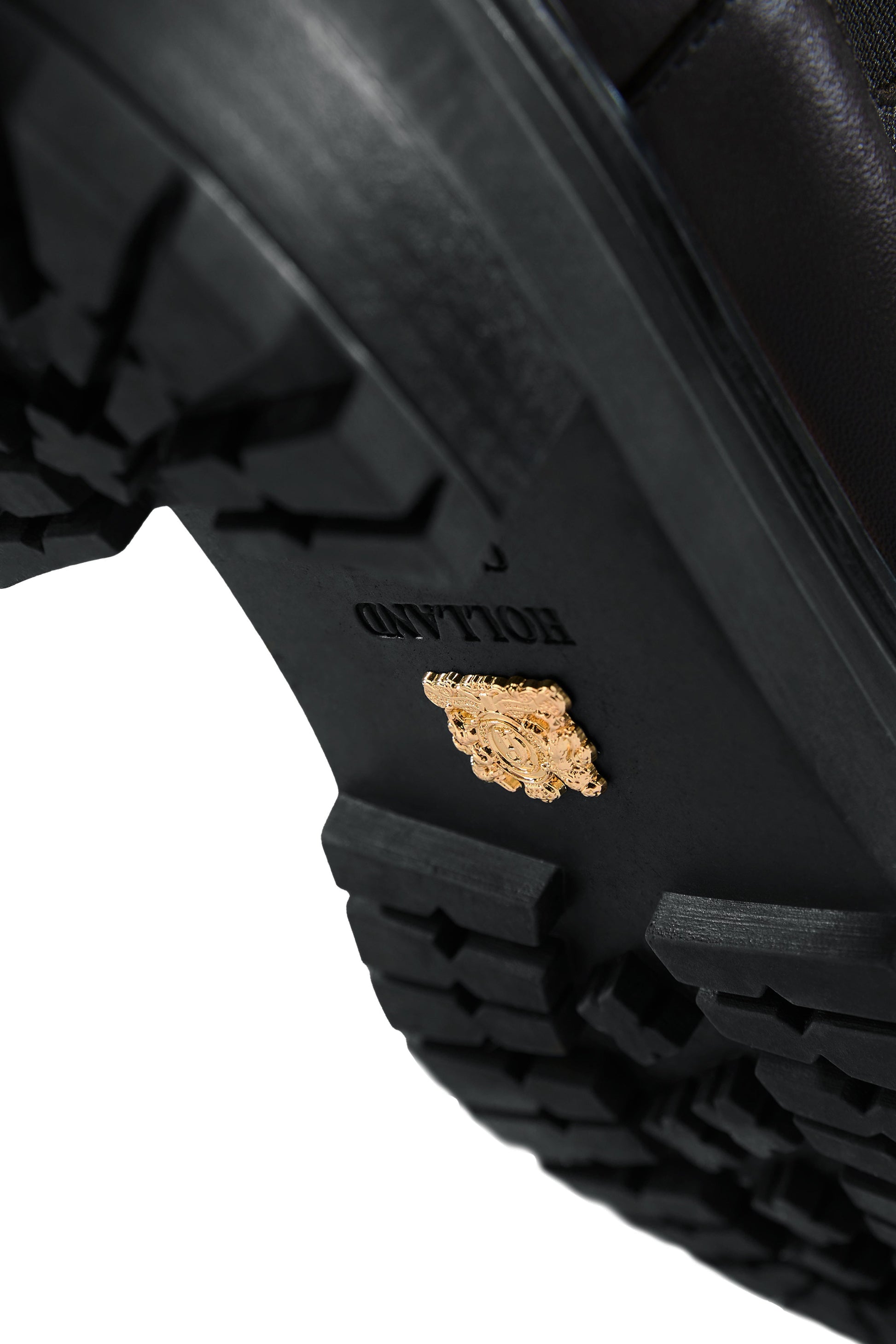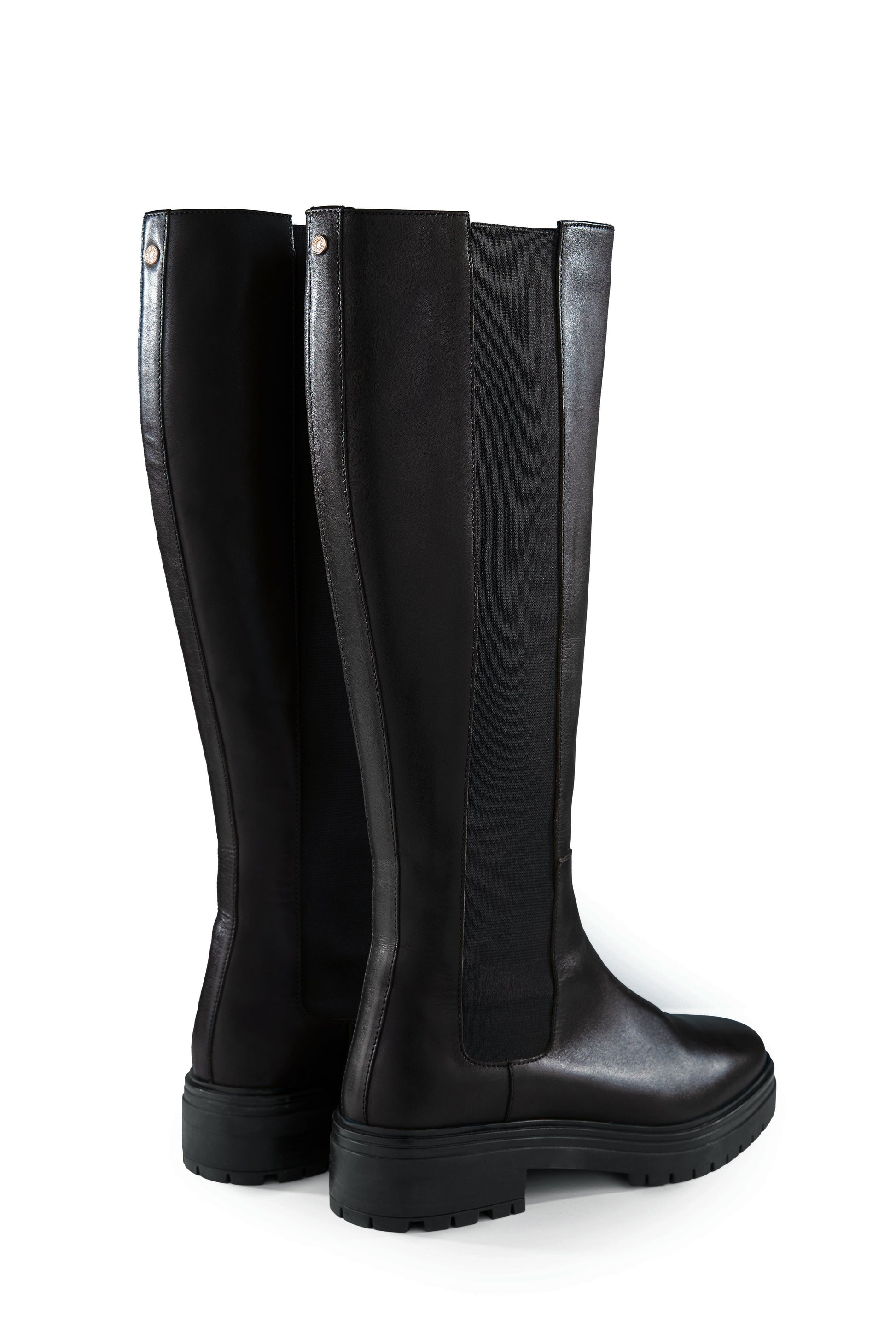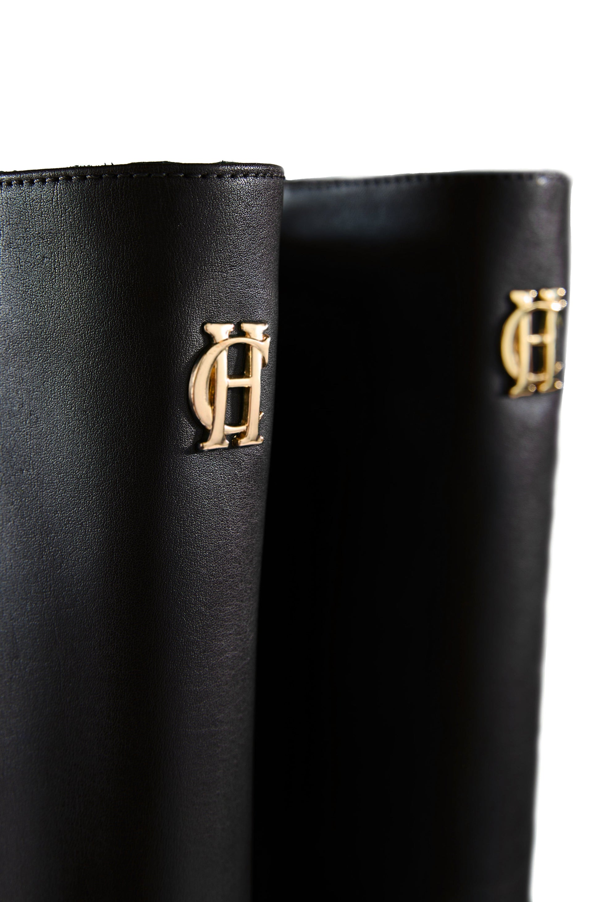 The epitome of minimalist chic. this classic knee boot has been inspired with a subtle touch of our equestrian heritage. Created from a premium leather with matching lining. Designed with a classic almond toe with a chunky tracked sole. this boot ensures a comfortable & stylish wear. Subtly detailed with a delicate HC pin.
