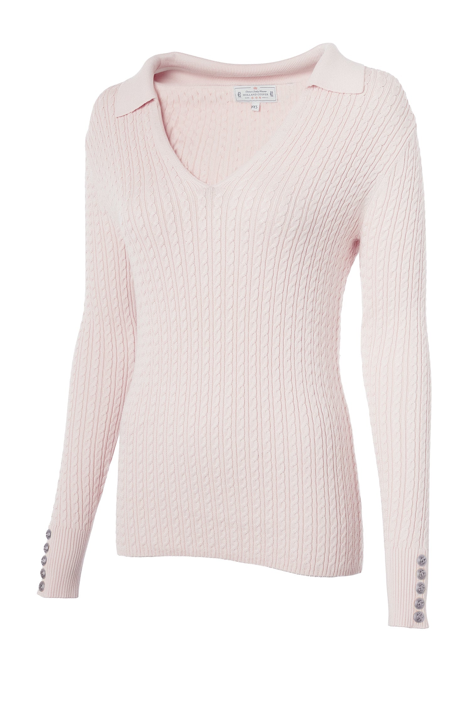 Crafted from a luxurious super soft yarn. this jumper ensures a sumptuously cosy feel against your skin. With an intricate cable design with a slim silhouette and deep v collar neckline. Beautifully elevated with silver hardware on the cuffs.