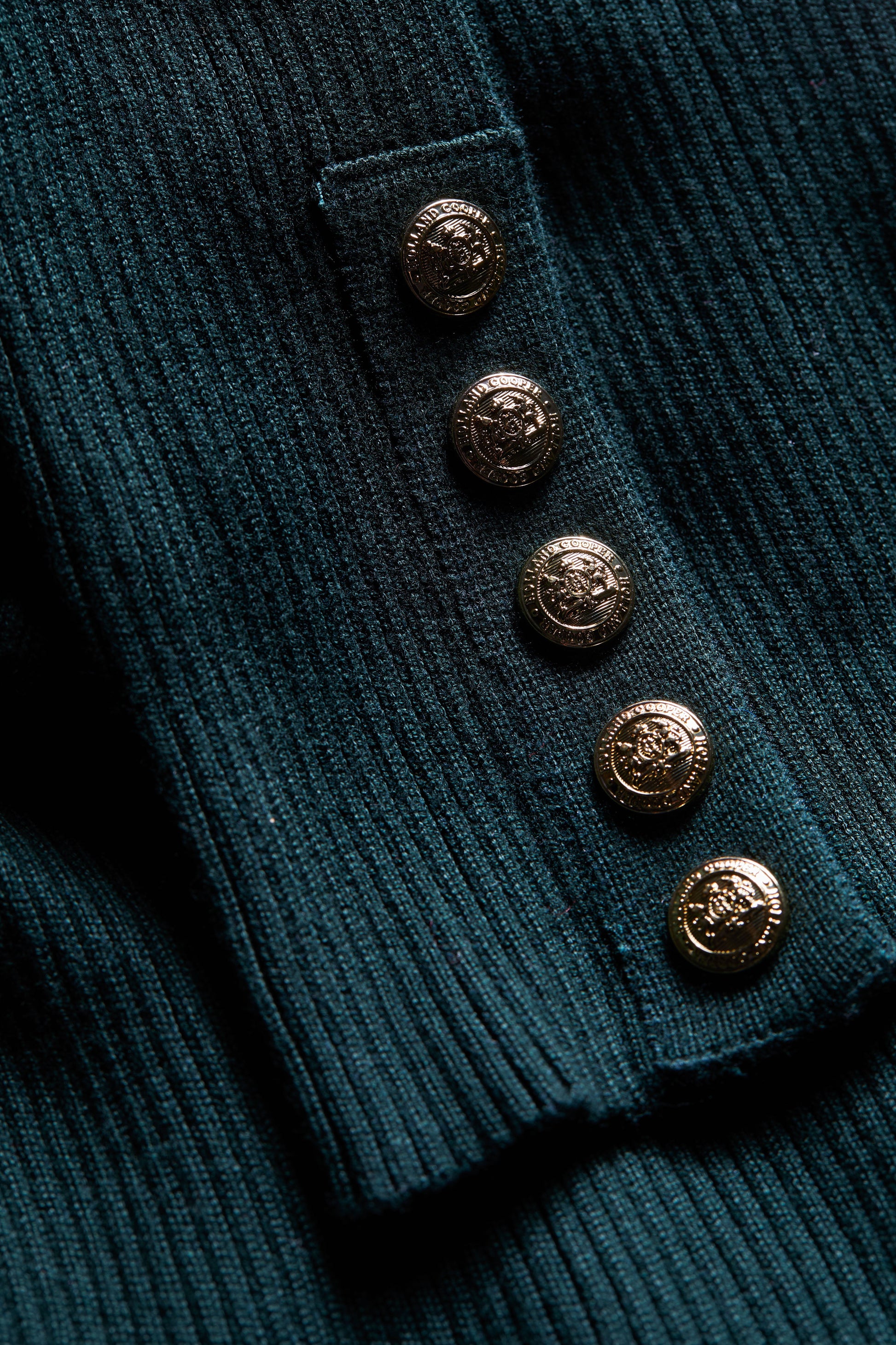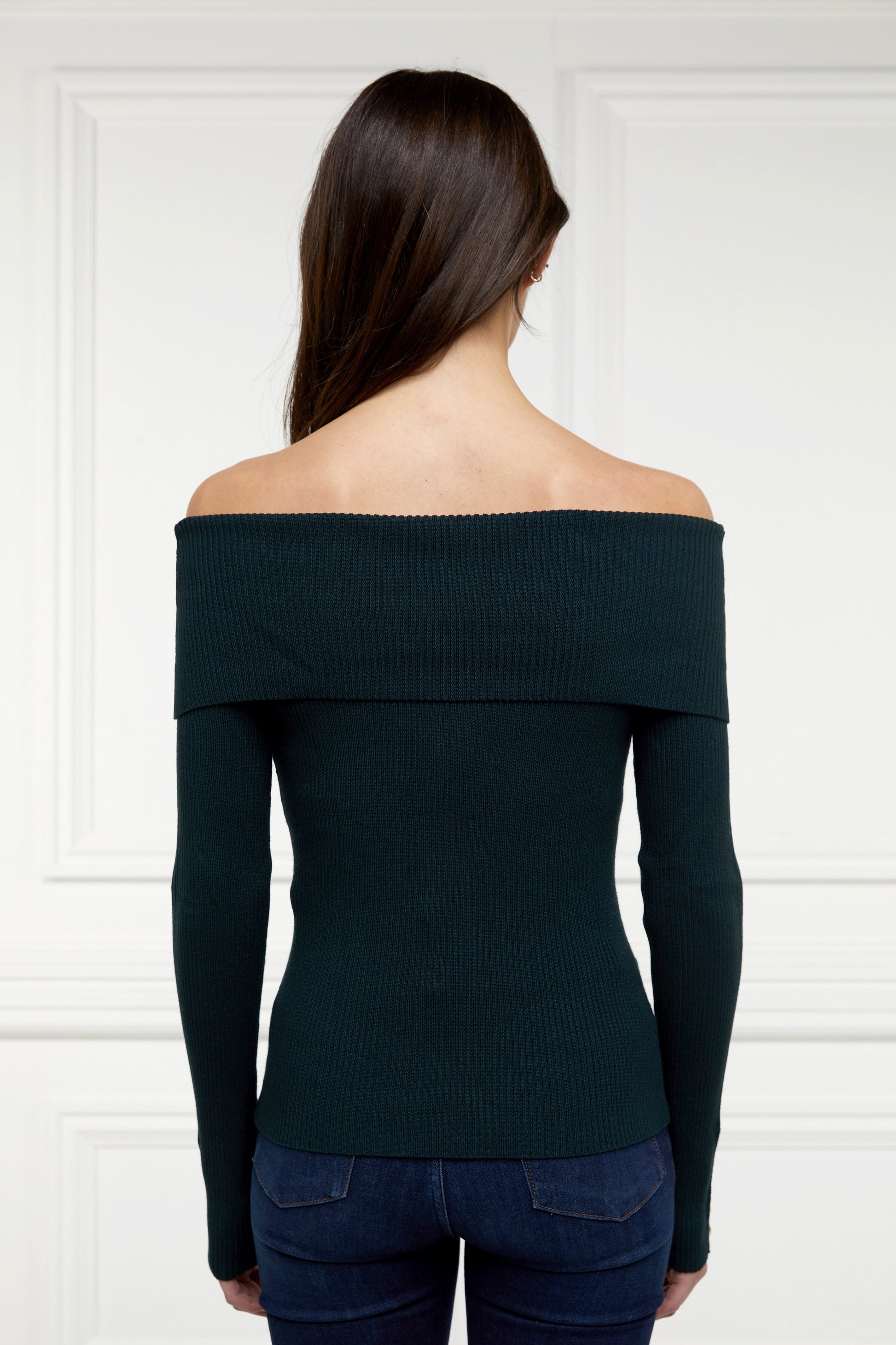 Designed in a timeless Bardot silhouette that offers endless styling opportunities. This elegant top features a relaxed open neckline and long sleeves. perfectly framed for a chic look. The slim fit ribbed body ensures a flattering fit. while signature hardware on the cuffs adds a touch of sophistication. Versatile and stylish. the Bardot Knit is a must-have for any fashion-forward wardrobe.