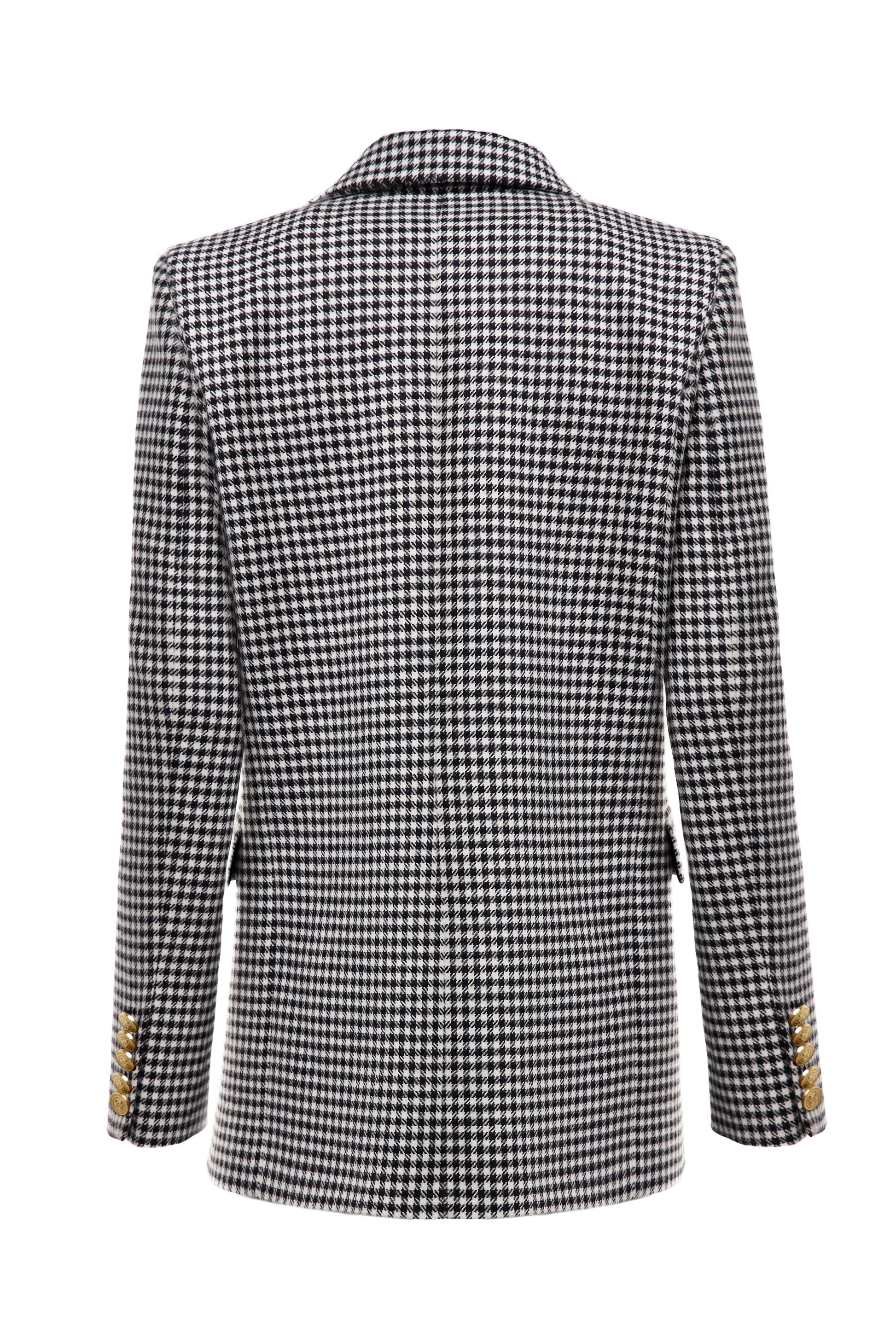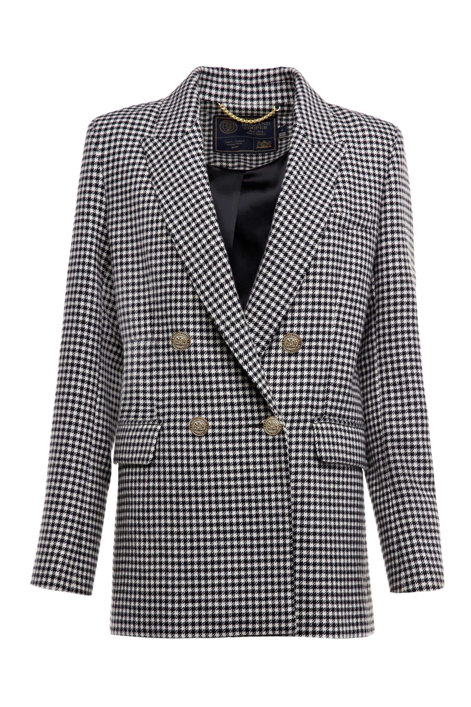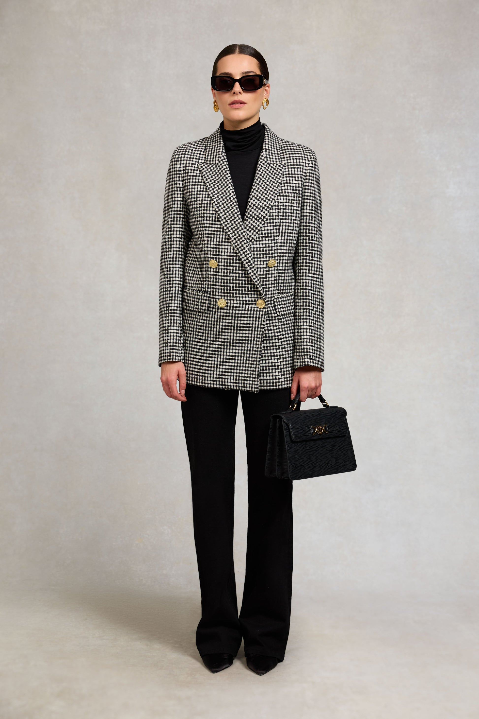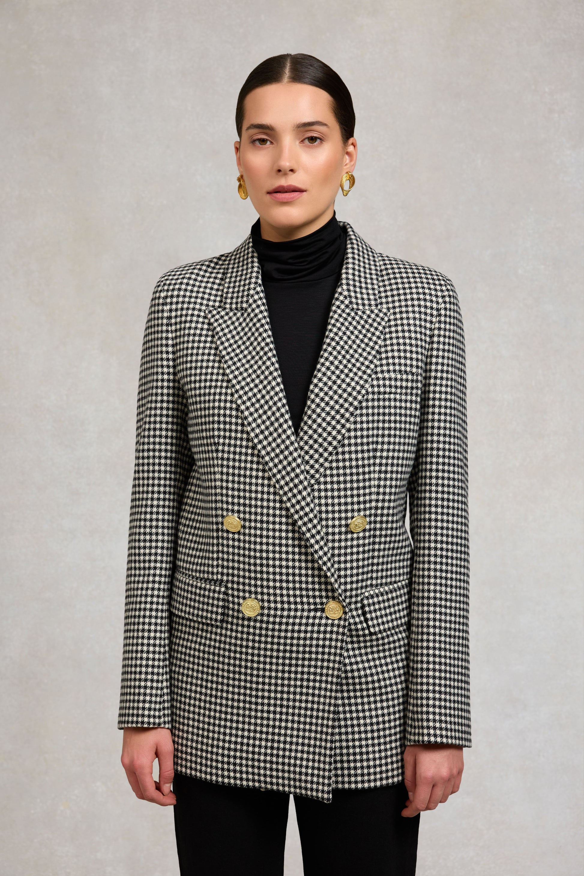 Hand-cut and made entirely in the UK. this blazer has been designed with a longline. double-breasted silhouette. Elegantly crafted to create a sharp tailored fit worn open or closed. it has peak lapels. subtle padded shoulders and is fully lined in satin for easy layering. Detailed with signature HC gold buttons on the front and cuffs.