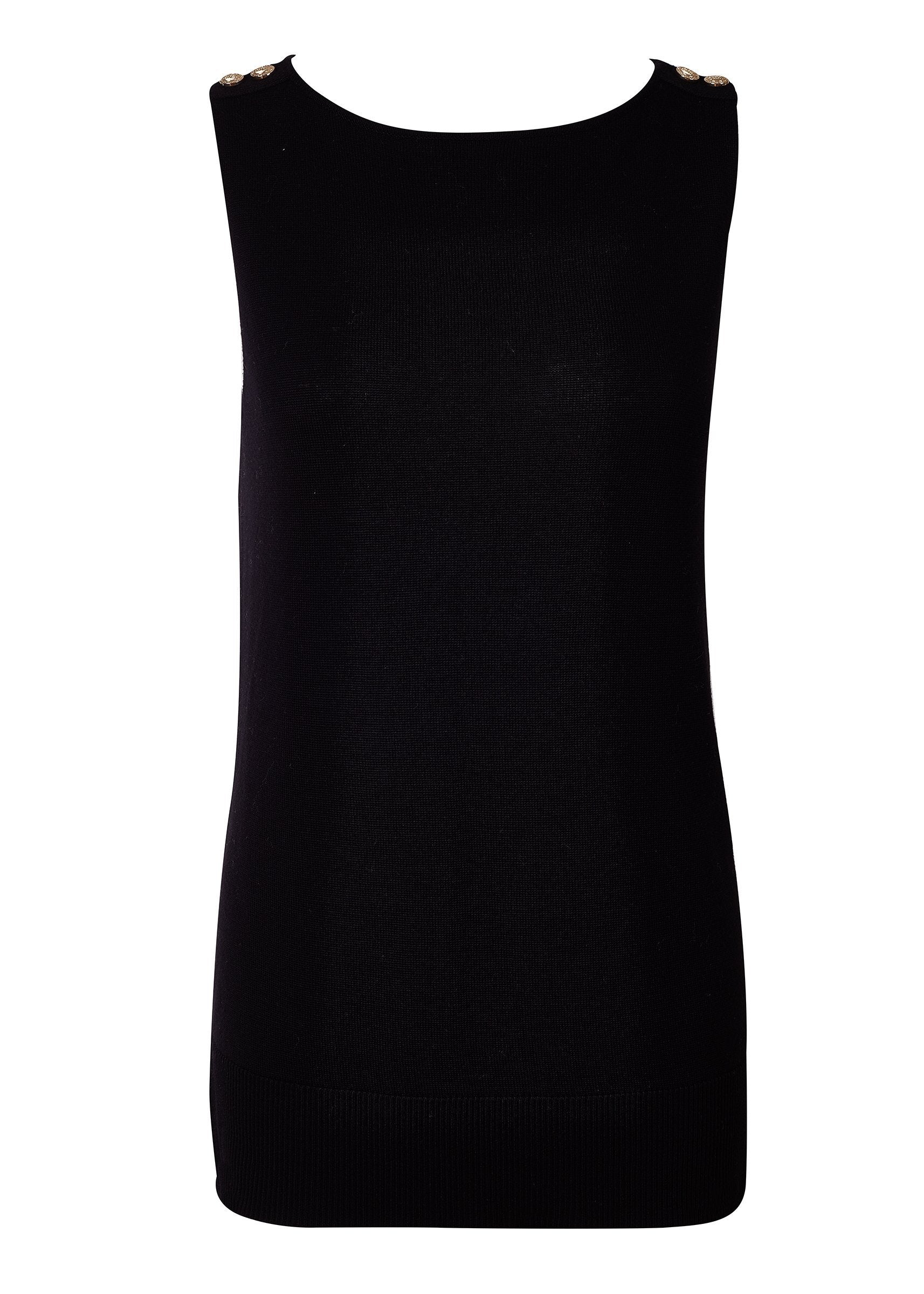 This luxury sleeveless. fine knit boat neck vest is a staple piece for your everyday wardrobe. Designed with a sleek slash neck and a deep ribbed hem with side splits for a relaxed. easy-to-wear basic. Pair with our Jodhpur Jeans or our Amoria Tailored Shorts for a piece that you will find yourself reaching for over and over again. Detailed with our signature branded hardware.
