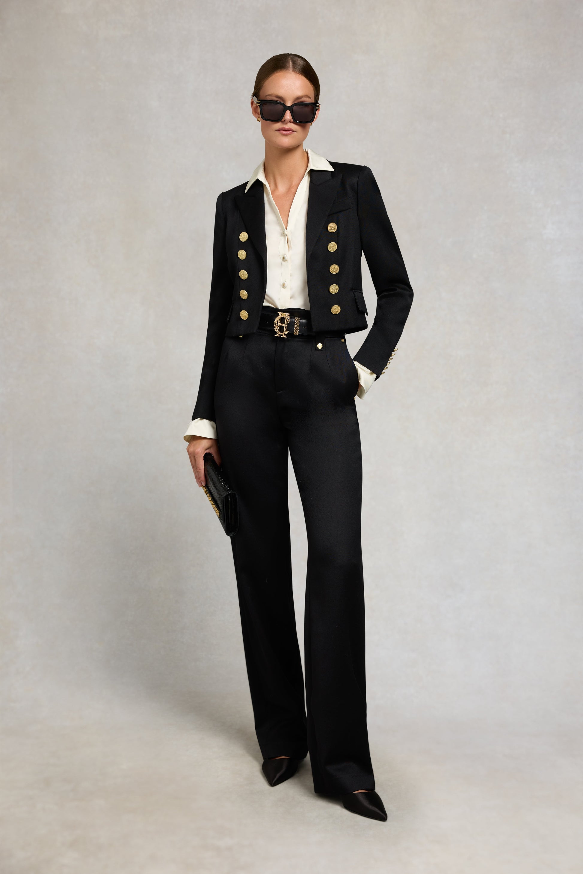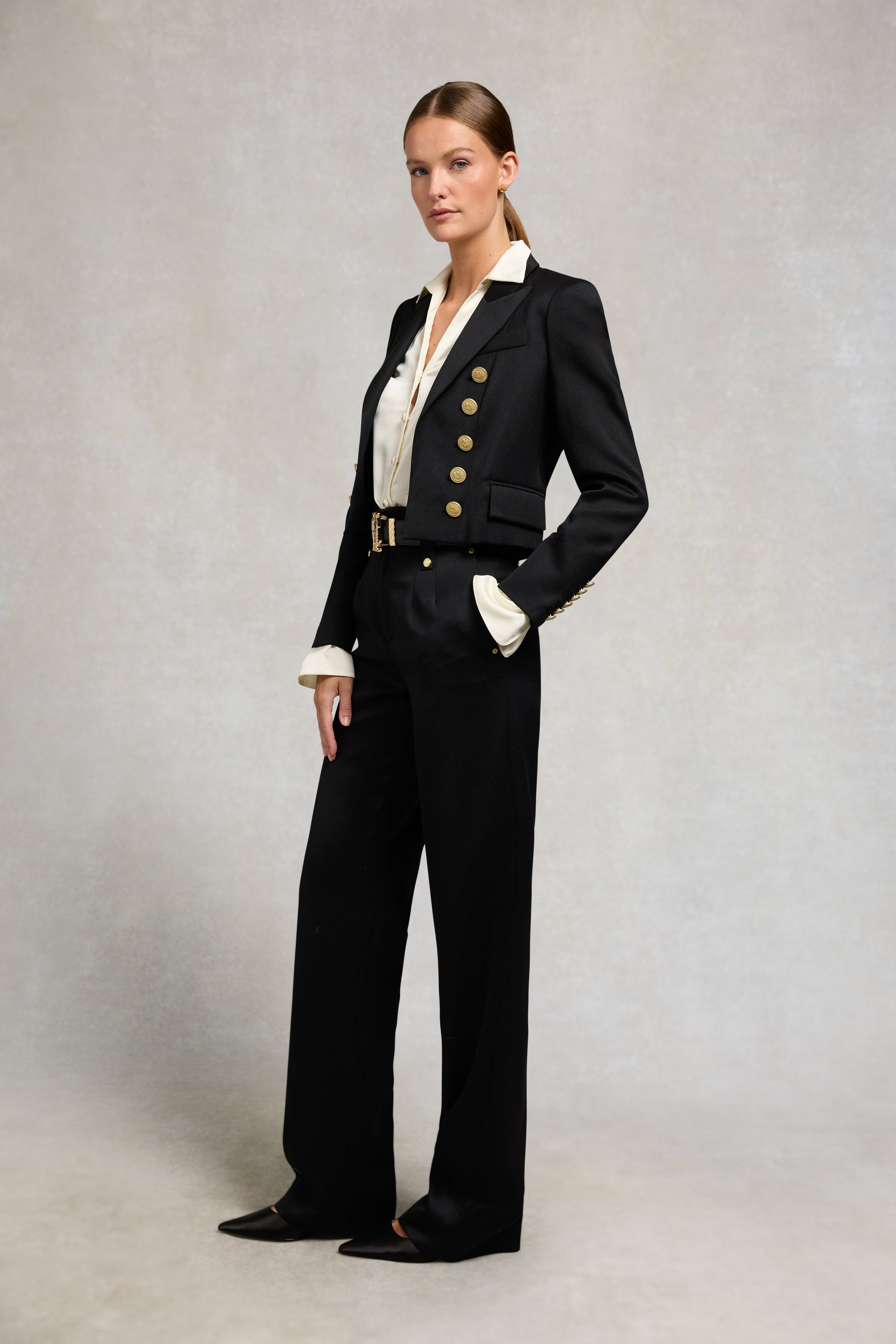 In a contemporary cropped cut. our beautifully tailored Brompton Jacket is the ideal wardrobe staple. Elevated by its statement golden buttons. it is the ultimate trans-seasonal piece. Pair with a lightweight top or an evening dress for instant sophistication.