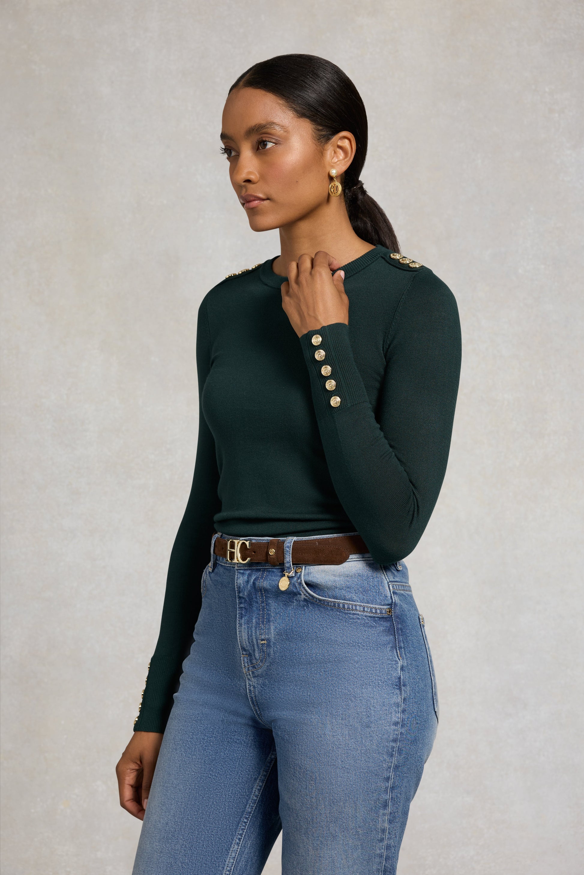 Introducing HC's update to the buttoned knit crew neck. now with our signature hardware on both shoulders. to form part of your signature look. Complete every outfit with this stylish. classic and easy to wear wardrobe staple.