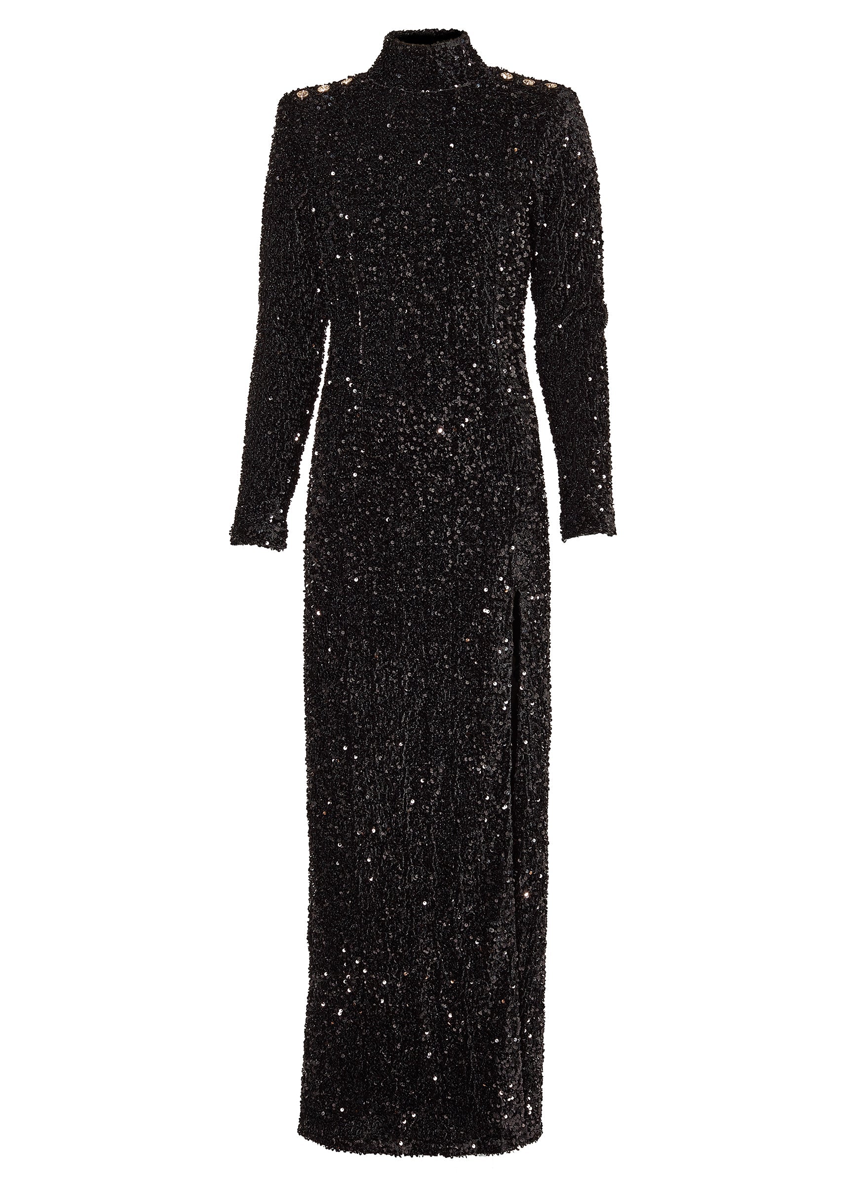A stunning choice for your evening wardrobe. This dress features a sleek and powerful high neckline. complimented by a zip opening at the centre back for easy wear. Designed with shoulder pads for an exaggerated silhouette. this dress ensures you stand out in style. The long. super slim sleeves at a touch of elegance. while the beautiful sequin stretch fabric provides both comfort and glamour. Perfect for any special occasion. this dress is your go-to for making a memorable entrance.