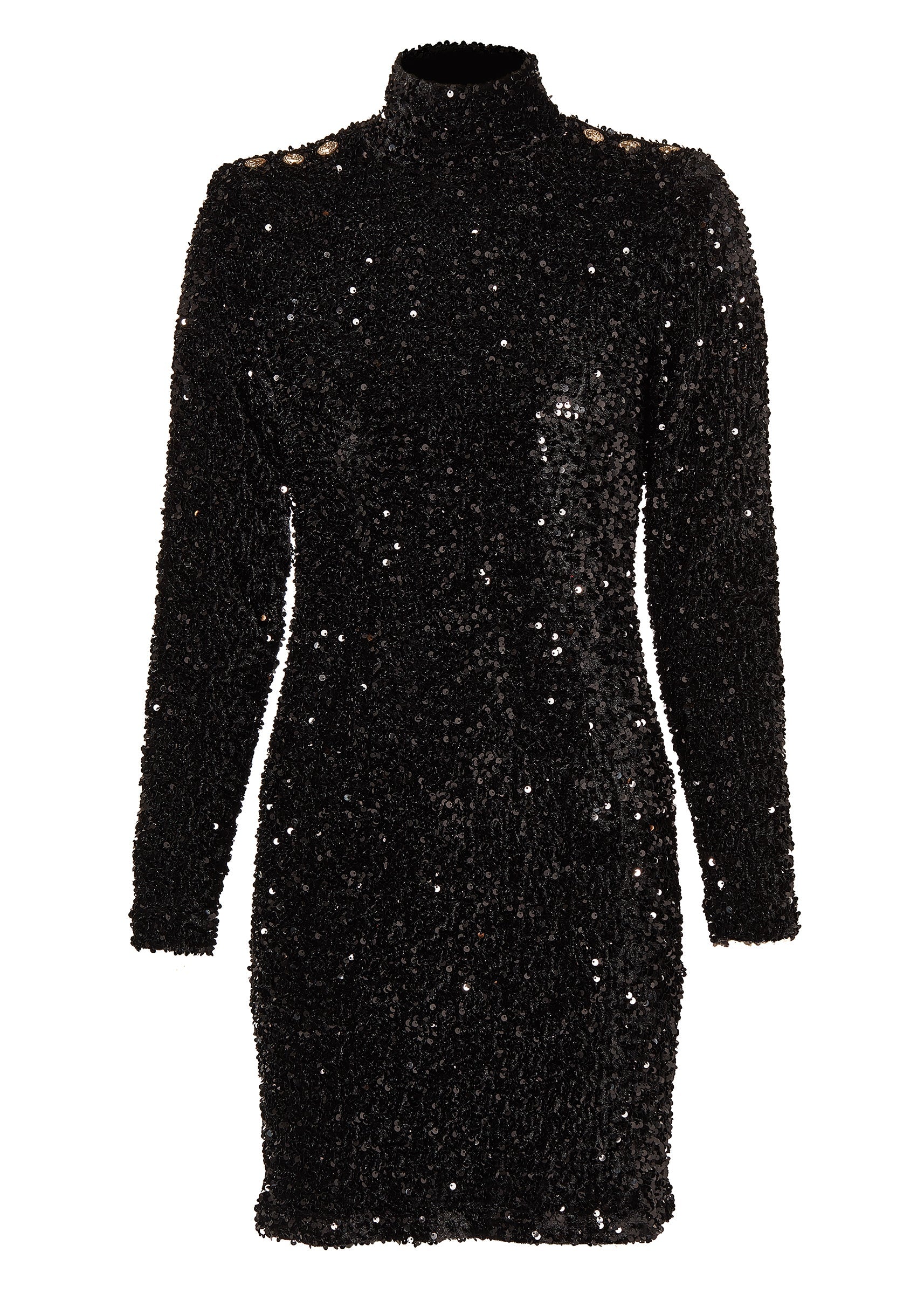 A stunning choice for your evening wardrobe. This dress features a sleek and powerful high neckline. complimented by a zip opening at the centre back for easy wear. Designed with shoulder pads for an exaggerated silhouette. this dress ensures you stand out in style. The long. luper slim sleeves at a touch of elegance. while the beautiful sequin stretch fabric provides both comfort and glamour. Perfect for any special occasion. this dress is your go-to for making a memorable entrance.