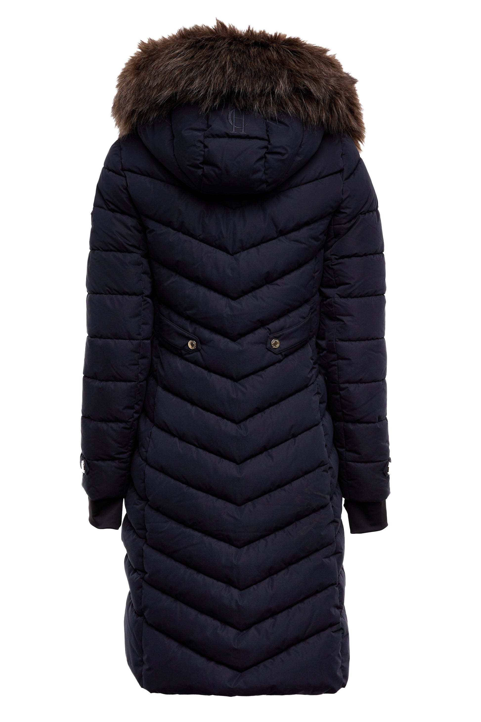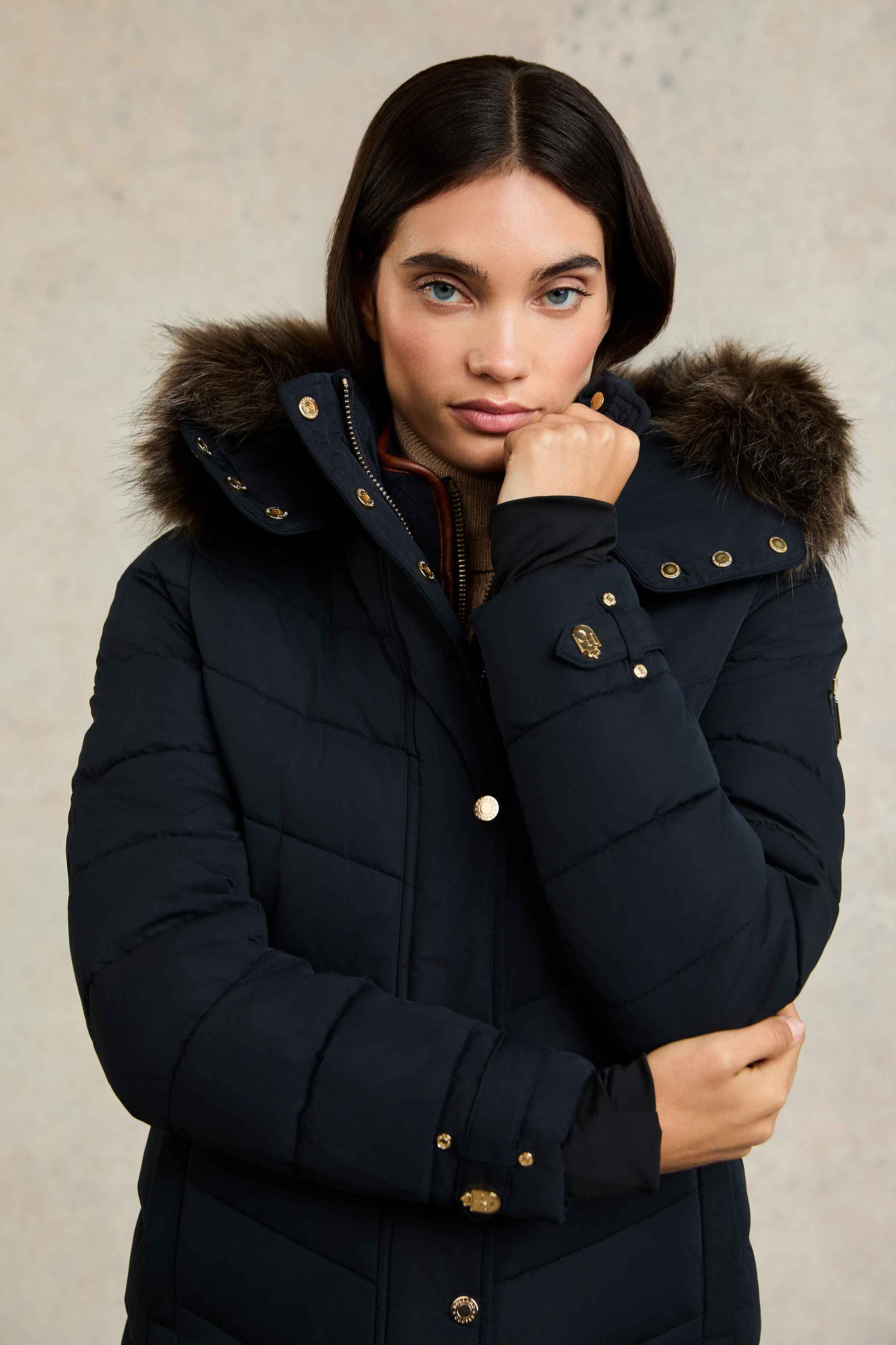 This durable coat has been filled with a premium eco fill to ensure ultimate warmth during those colder months. With detachable faux fur and detailed with our iconic gold hardware. this coat will elevate your winter wardrobe. Finished with two pockets to the hip and a two-way zip with a storm guard.