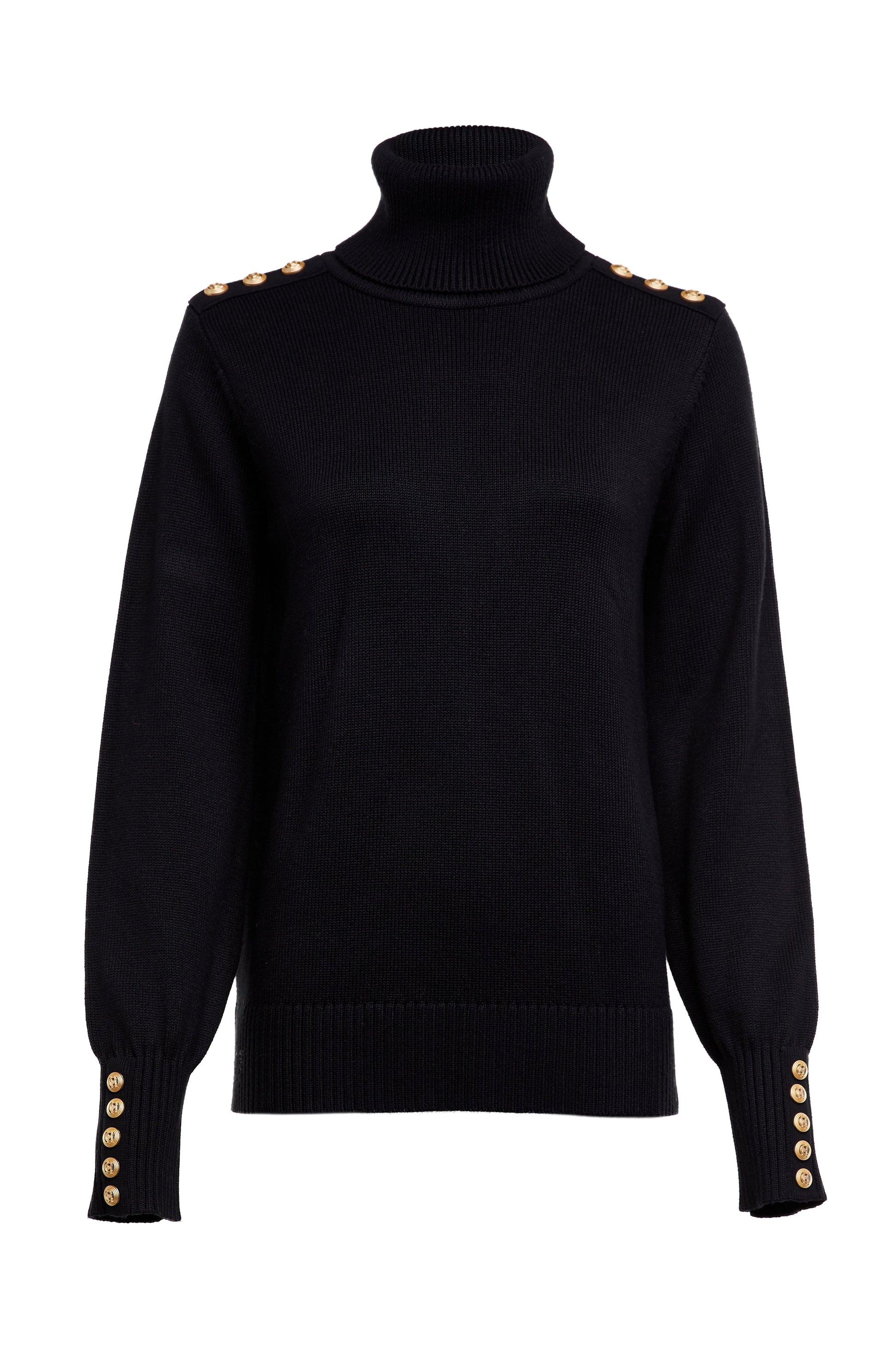 This classic roll-neck knit has been beautifully elevated with subtly fluted sleeves for a soft and elegant look. Made from a luxuriously soft yarn. this knit has been designed with a longer body which is perfect for tucking into jeans. Detailed with our iconic gold HC rivets on the shoulder and cuff.