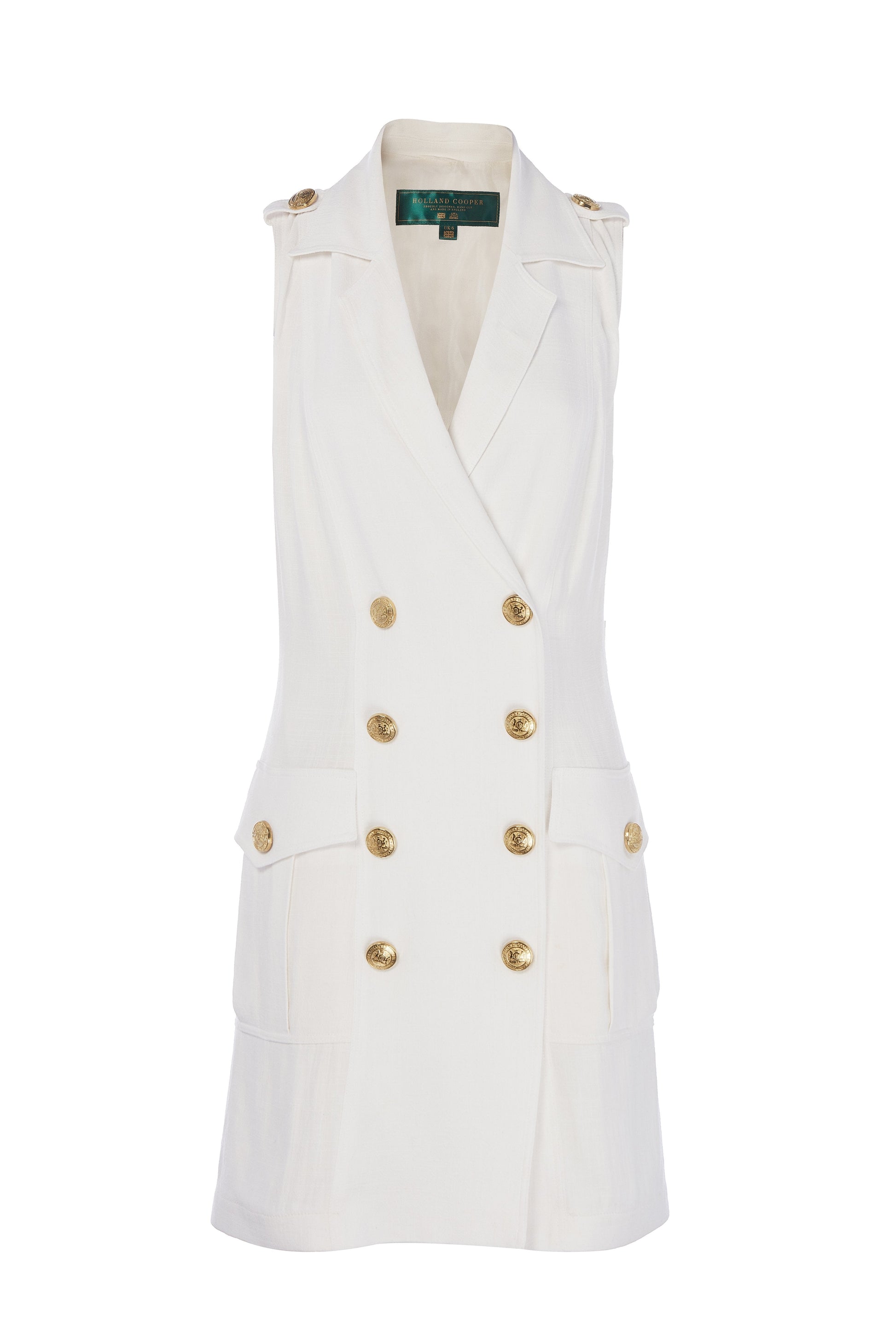 This product has been hand cut and made in the UK. Effortless and elegant. the Chelsea Dress evokes warm weather inspirations. The lightweight linen composition and tailored fit makes for the perfect understated piece. Its sleek sleeveless silhouette. double breasted construction and signature HC snaps adds to its flattering definition. Pair with a matching Panama Hat for a poolside companion. This product is fastened at the front by our premium popper fastening and fits true to size.