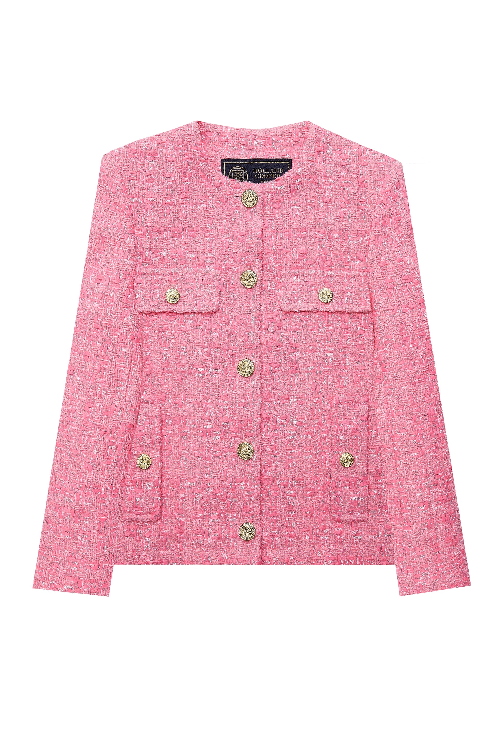 Perfectly blending a modern and vintage aesthetic. this jacket has been crafted with a slightly cropped. easy fit with articulated sleeves. The collarless feature adds a touch of versatility. making it the perfect pairing for shirts. dresses and high-neck tops. Bluff pockets on the chest with fictional pocket flaps. alongside lower side entry welt pockets. enhance its chic aesthetic. Finished with our signature Holland Cooper gold hardware. this jacket seamlessly blends timeless elegance with contemporary flair.