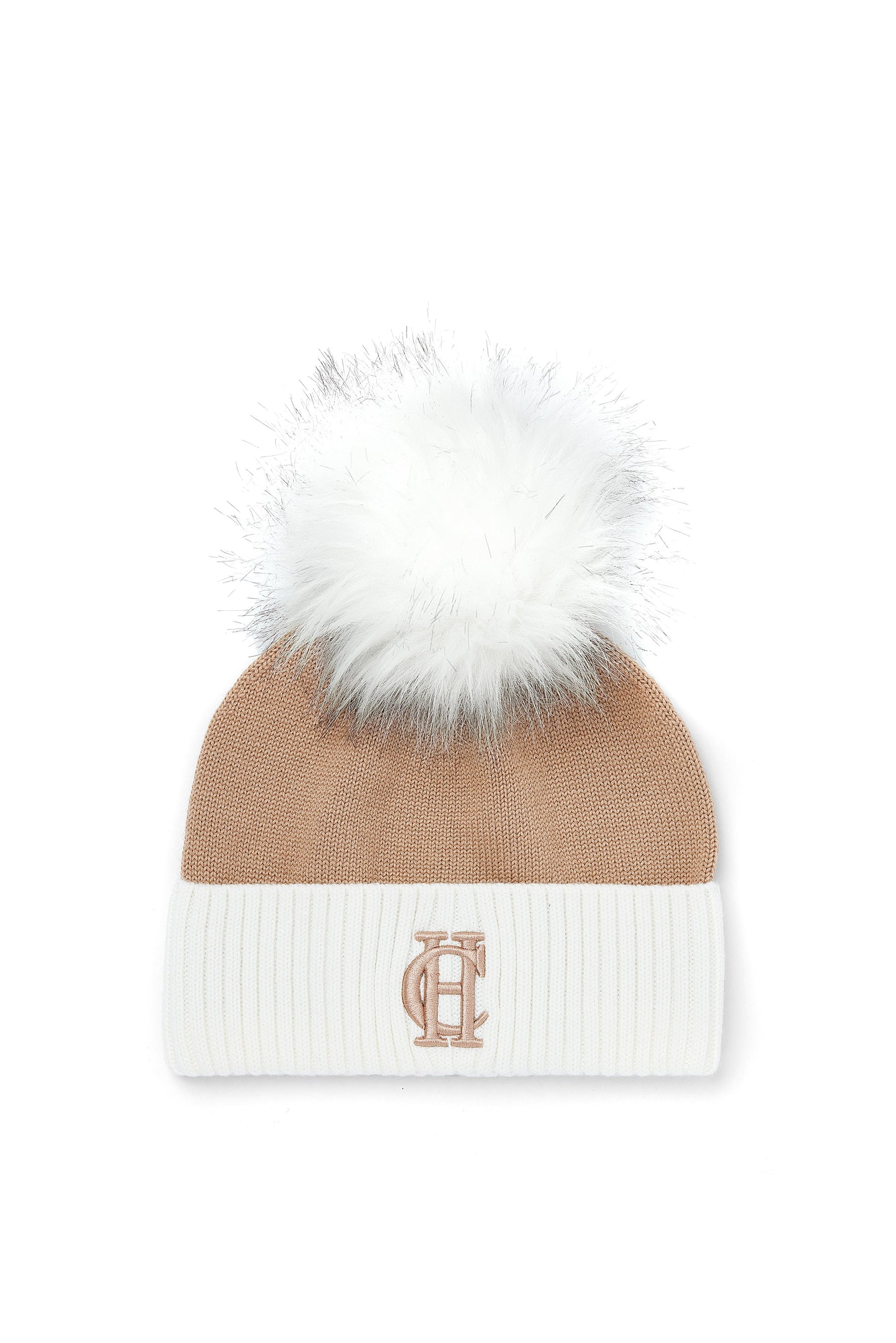 A new addition designed to perfectly complement our Lightweight Monogram Scarf Collection. Crafted in classic camel and black. this hat features high build embroidery for a refined touch. The chunky ribbed cuff adds both style and warmth. making the Chelsea Marino Bobble Hat a versatile and elegant accessory for your winter wardrobe.