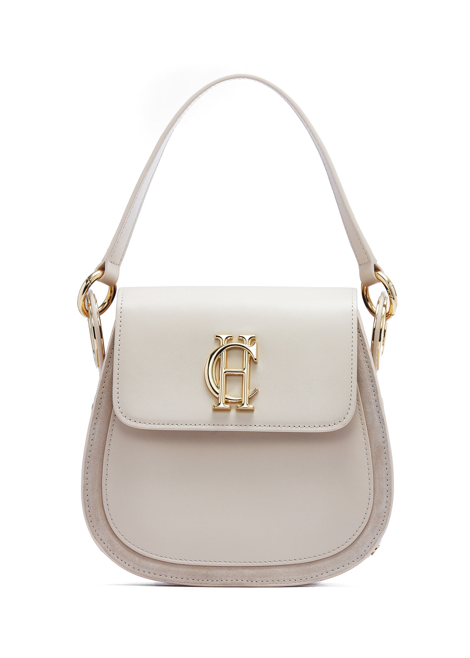 Crafted from an elegant combination of suede and leather. this bag has been designed with a feminine. curved structure. With a spacious interior. ideal for your everyday essentials. the sleek front flap is secured with a magnetic closure to keep your valuables safe. With a chunky top handle and adjustable shoulder strap. this bag has been designed to be worn in multiple ways. Elevated with our iconic gold hardware. HC plaque and gold embellishment.