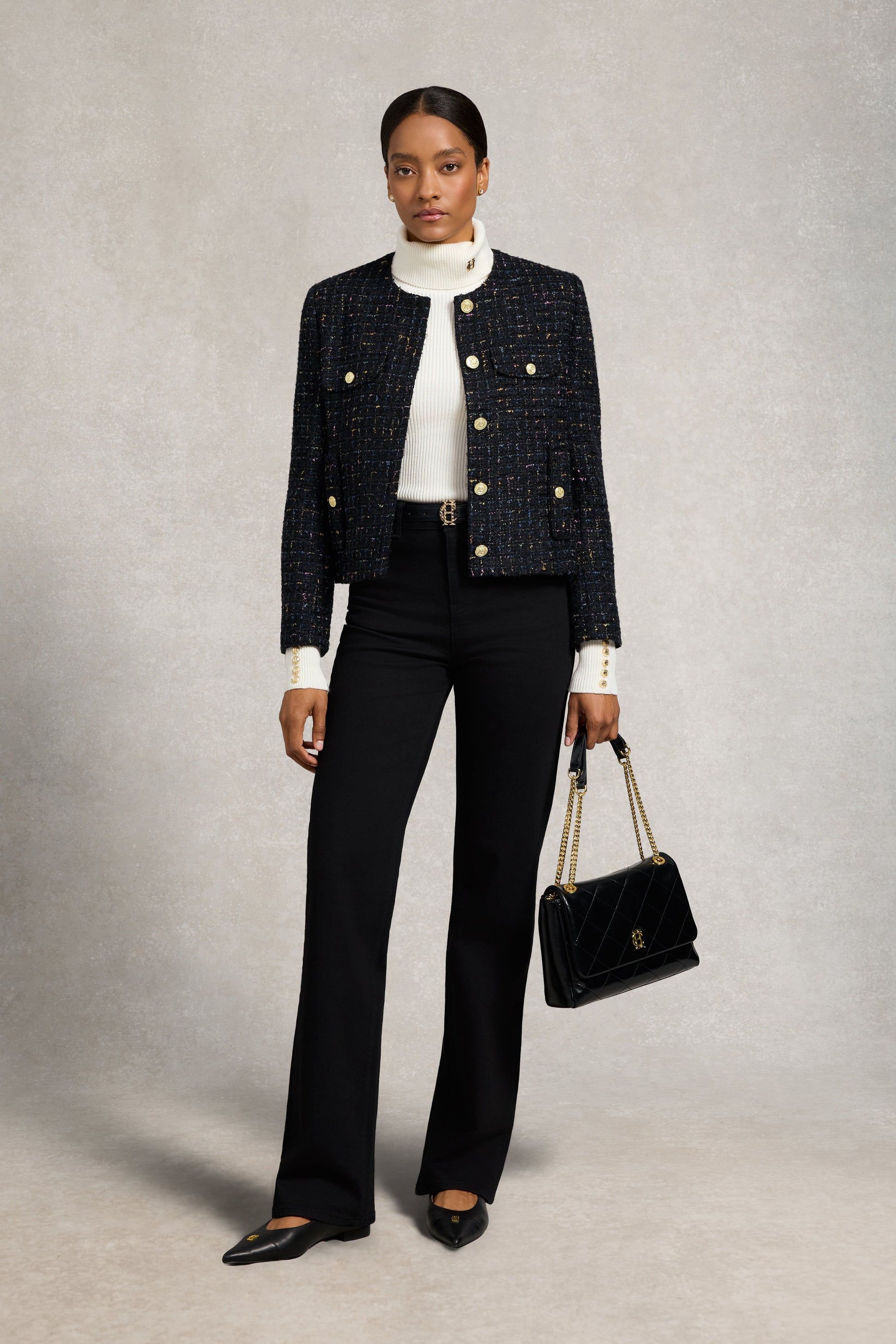 These jeans feature classic five-pocket styling and a single-shank waistband closure. ensuring a secure and comfortable fit. Adorned with signature gold hardware. they boast a high-rise design that accentuates them beautifully. Crafted for elegance. the jeans offer a long. straight leg with an outward seam for a retro-inspired silhouette. The leg width strikes the perfect balance - not too wide. not too slim - delivering a vintage feel with modern comfort. Whether you dress them up or down. these jeans are a versatile staple that exudes effortless style.