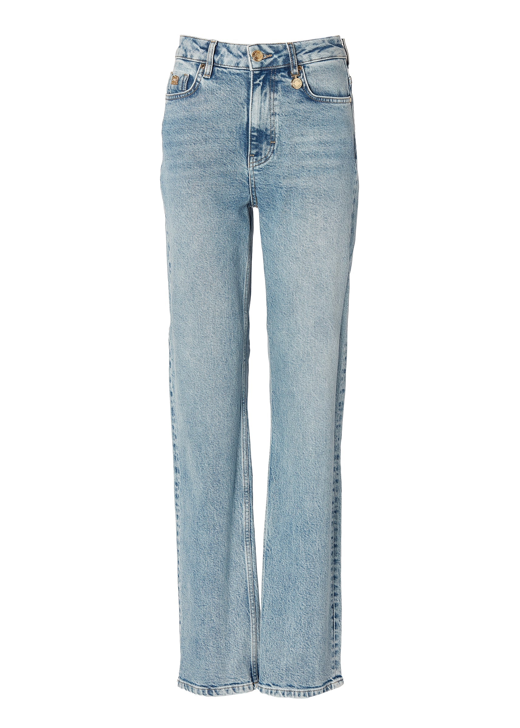 These jeans feature classic five-pocket styling and a single-shank waistband closure. ensuring a secure and comfortable fit. Adorned with signature gold hardware. they boast a high-rise design that accentuates them beautifully. Crafted for elegance. the jeans offer a long. straight leg with an outward seam for a retro-inspired silhouette. The leg width strikes the perfect balance - not too wide. not too slim - delivering a vintage feel with modern comfort. Whether you dress them up or down. these jeans are a versatile staple that exudes effortless style.