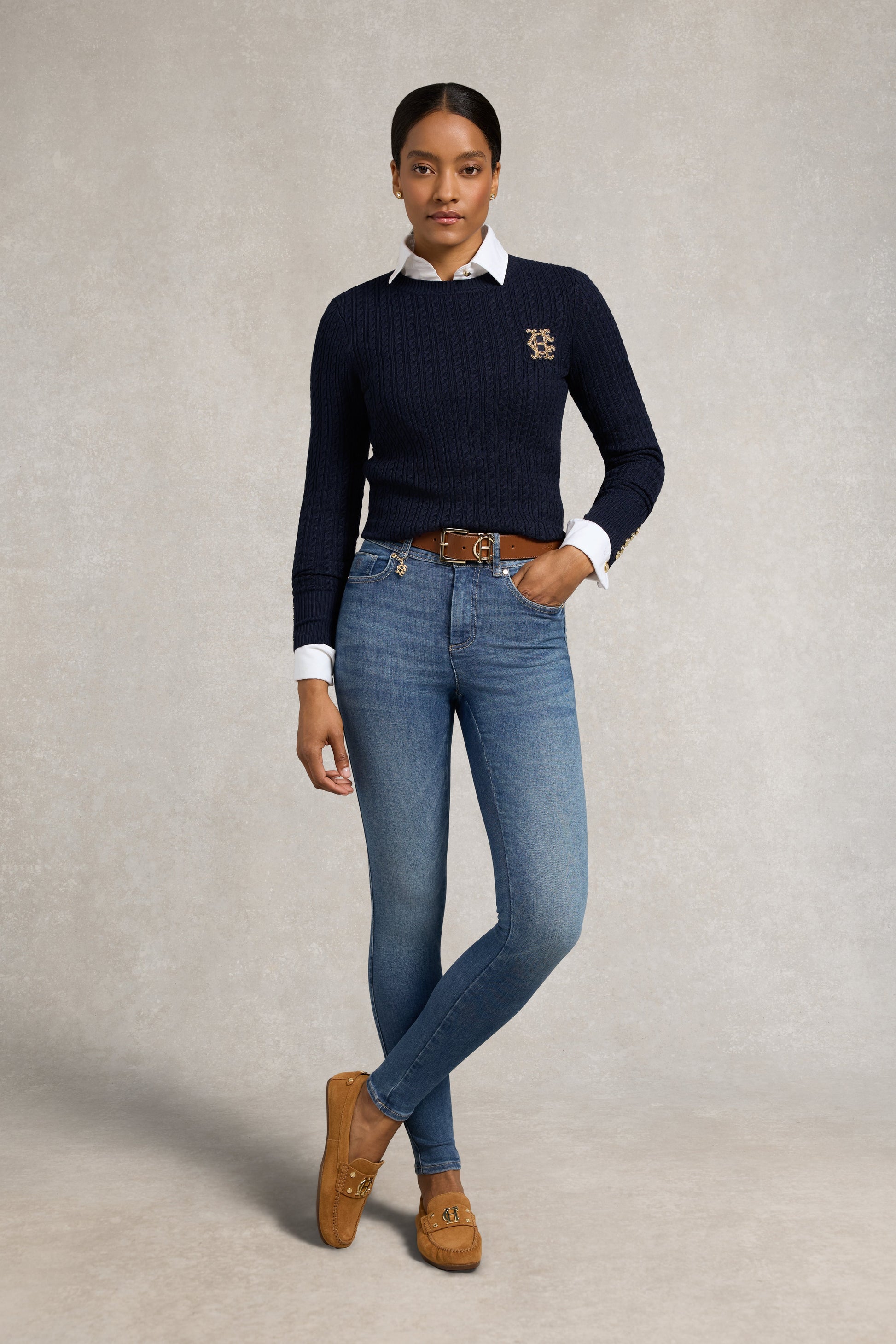 The latest addition to our denim collection. these jeans are expertly crafted to sculpt. flatter. and keep you warm through the colder months. Woven with premium stretch denim for a sleek. contoured fit. they feature innovative Thermolite® polyester yarns designed to trap air and retain heat without added bulk. An internal fleece lining adds exceptional comfort and insulation. while the high-waisted silhouette and back pockets create a timeless. flattering shape. Finished with our signature gold HC hardware. these are the ultimate cold-weather jeans—where style meets performance.