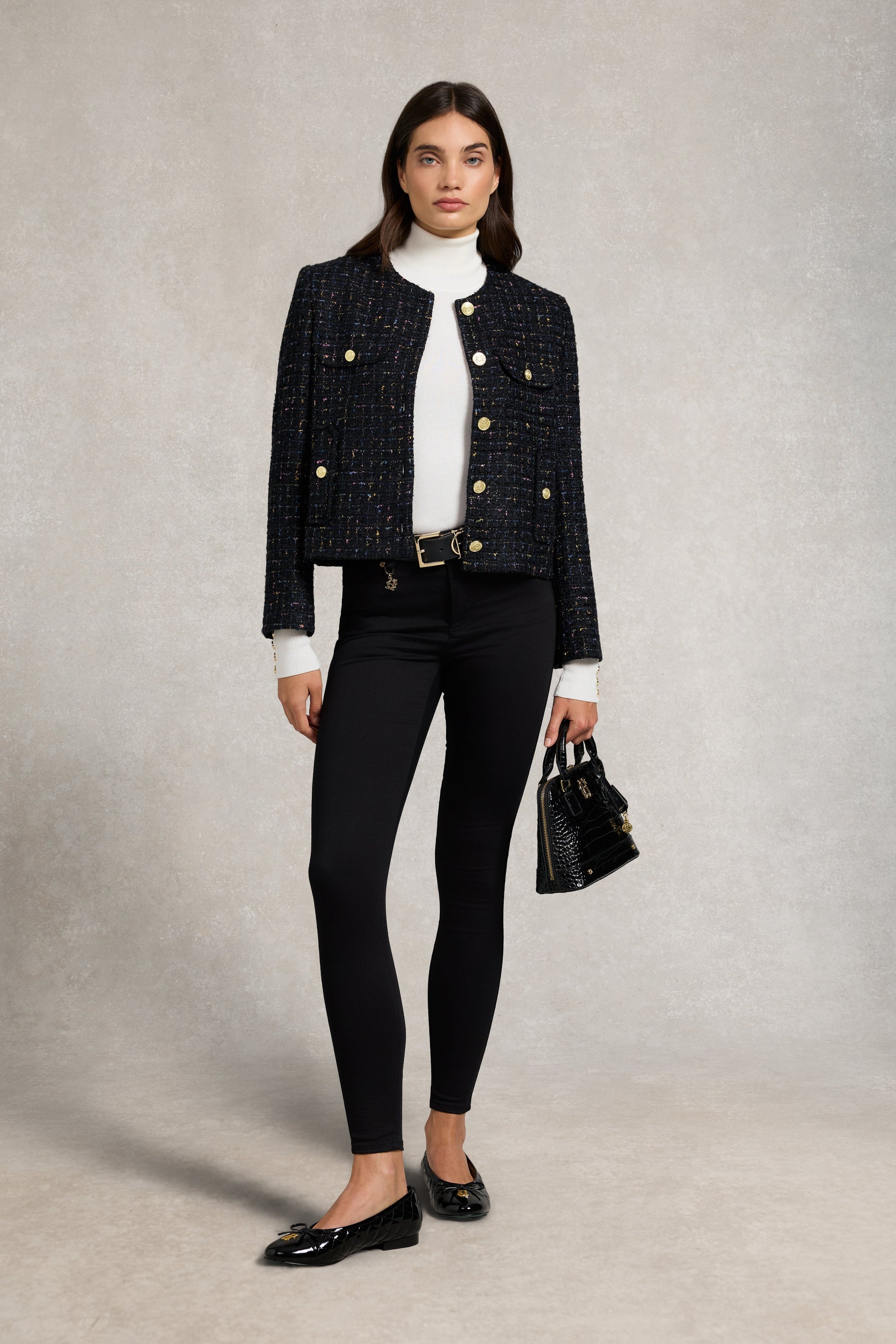 The latest addition to our denim collection. these jeans are expertly crafted to sculpt. flatter. and keep you warm through the colder months. Woven with premium stretch denim for a sleek. contoured fit. they feature innovative Thermolite® polyester yarns designed to trap air and retain heat without added bulk. An internal fleece lining adds exceptional comfort and insulation. while the high-waisted silhouette and back pockets create a timeless. flattering shape. Finished with our signature gold HC hardware. these are the ultimate cold-weather jeans—where style meets performance.