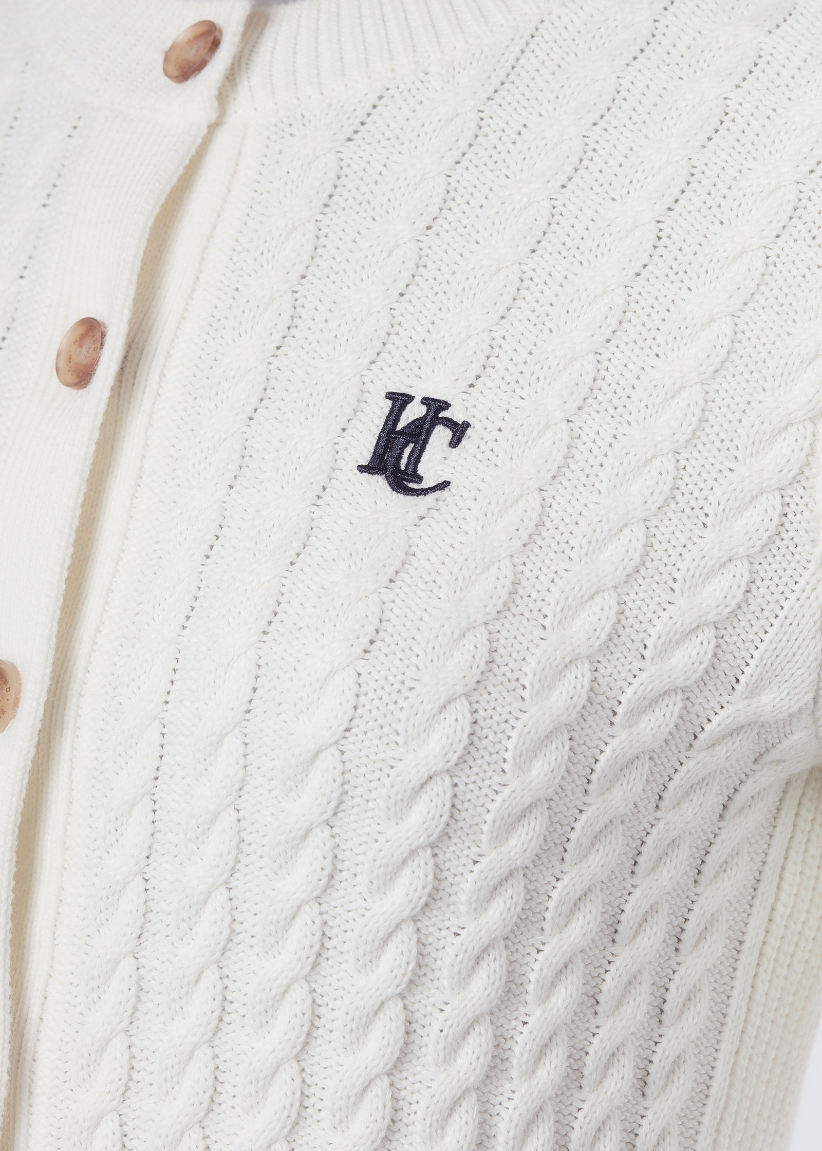 Crafted from the softest cotton. this cardigan features an elegant cable pattern on both the body and sleeves. adding a touch of sophistication to your wardrobe. Embellished with the iconic HC embroidery on the chest and horn button detailing. every element of this cardigan is carefully curated for a timeless and luxurious feel.
