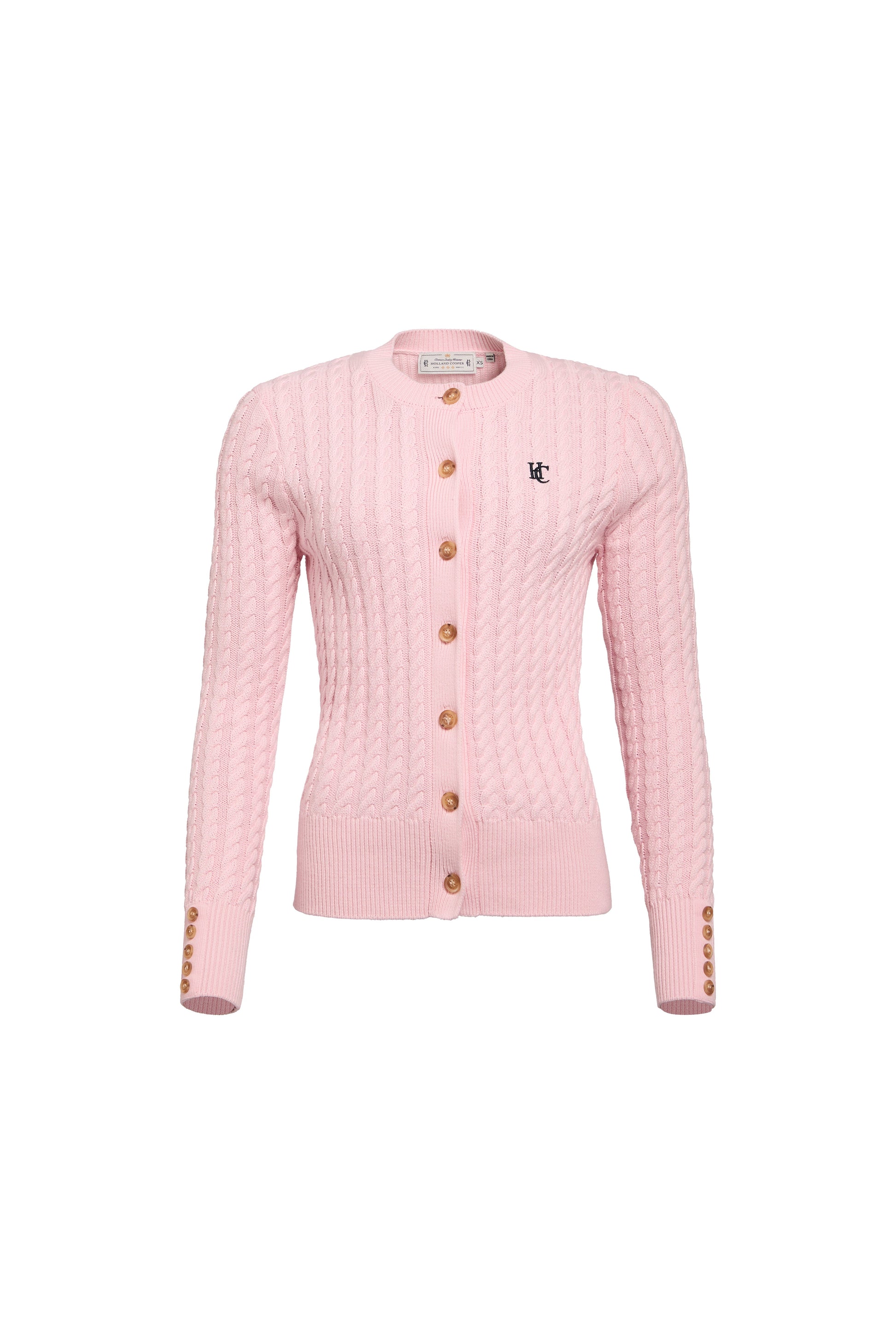 Crafted from the softest cotton. this cardigan features an elegant cable pattern on both the body and sleeves. adding a touch of sophistication to your wardrobe. Embellished with the iconic HC embroidery on the chest and horn button detailing. every element of this cardigan is carefully curated for a timeless and