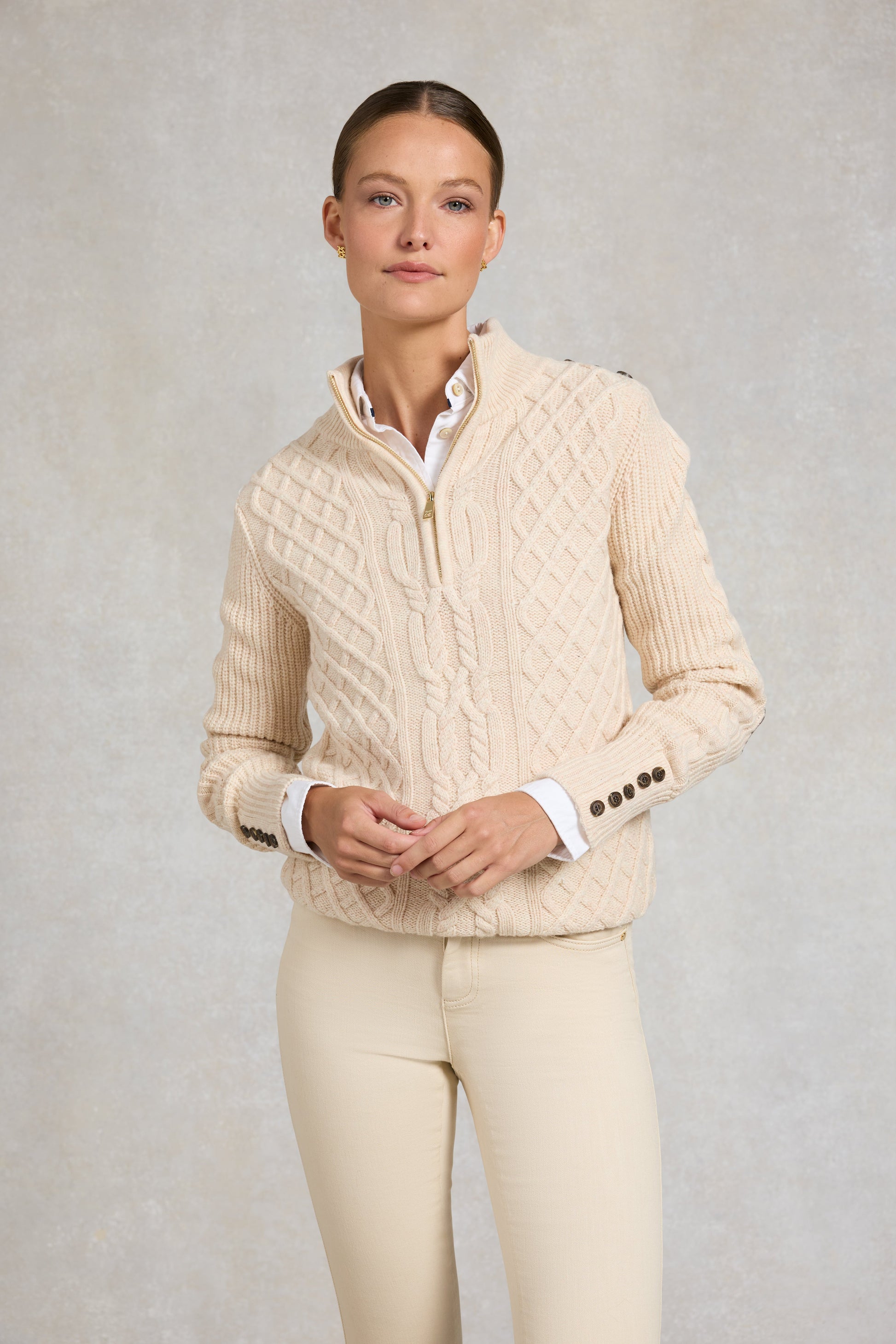The Country Cable Quarter Zip Knit features a ribbed roll neck collar. cuffs. and hem. complimented by a quarter-zip with a branded signature shiny gold zipper. The classic cable knit pattern is enhanced with dark brown elbow patches for a refined touch. while horn effect buttons add a traditional. rustic element to the design. This knit seamlessly blends style and functionality. perfect for a timeless. country-inspired look.
