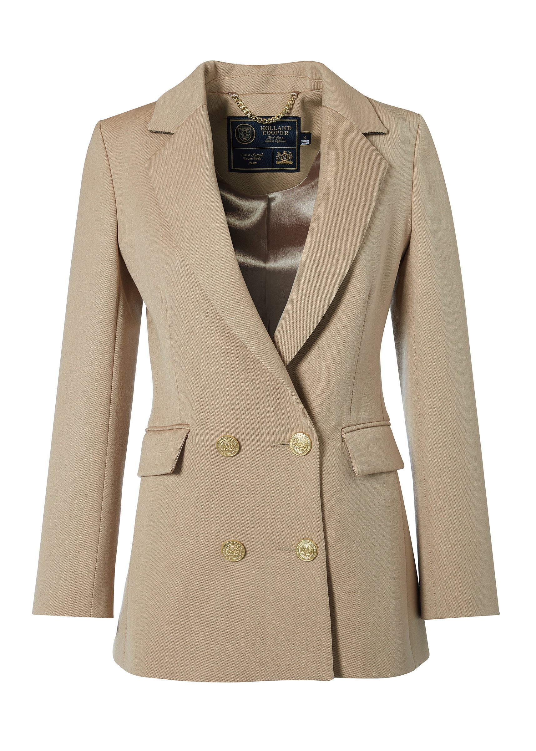 This longline double breasted wool blazer is a chic trans-seasonal forever wardrobe essential. Designed to create a sharp tailored silhouette worn open or closed. Fully lined with a luxury stretch lining for extra comfort and adorned with HC signature gold buttons on the front and cuffs. This blazer has been hand cut and made entirely in England using wools woven in the UK.