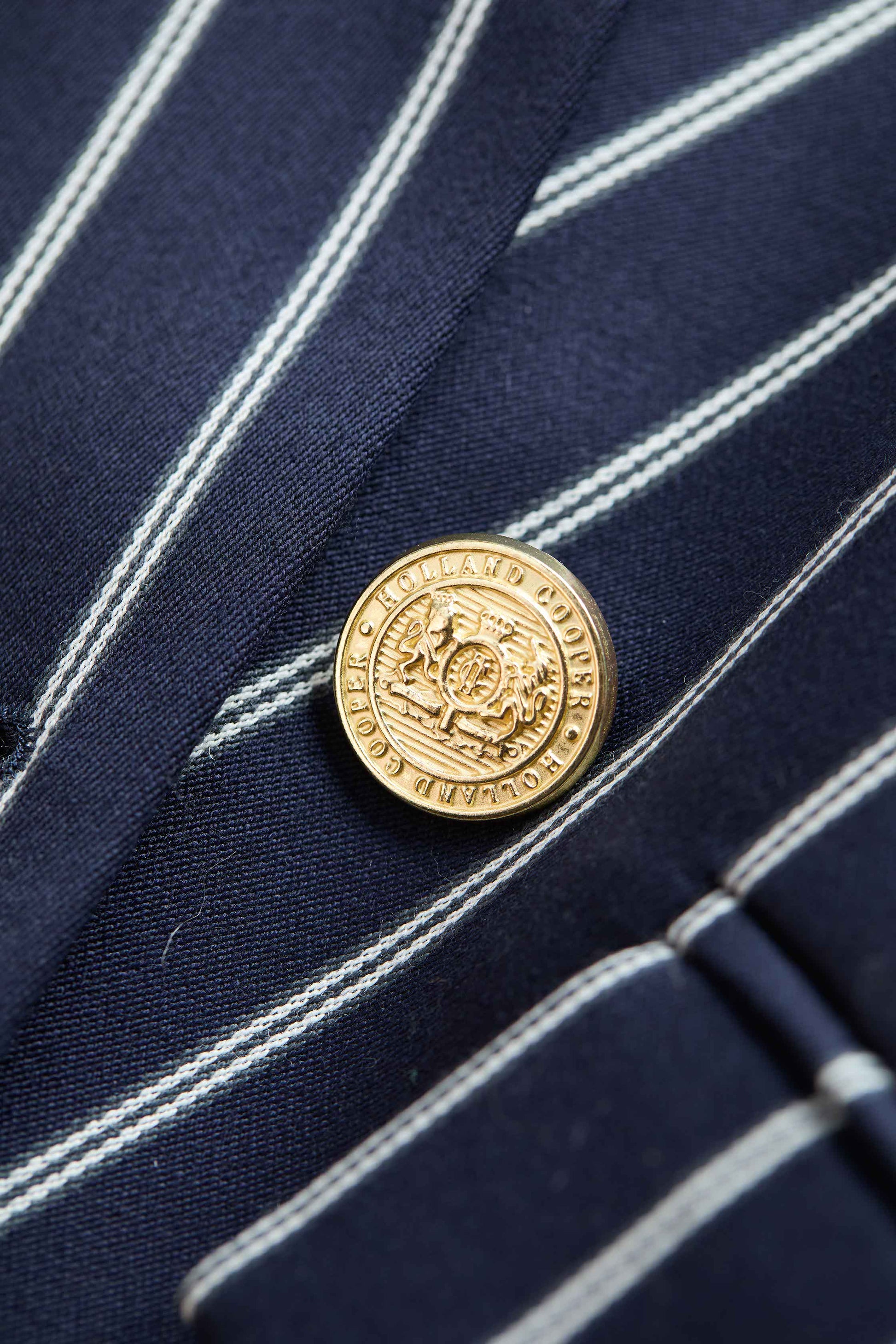 Designed to create a sharp tailored silhouette worn open or closed. the Double Breasted wool Blazer has been handmade in the UK. Crafted from a classic and contemporary pinstripe fabric & fully lined with a luxury stretch lining for extra comfort. this piece is a must-have staple for your wardrobe. With bold lapels & subtle hip pockets. each blazer has been elevated with HC signature gold hardware to the front and cuffs.