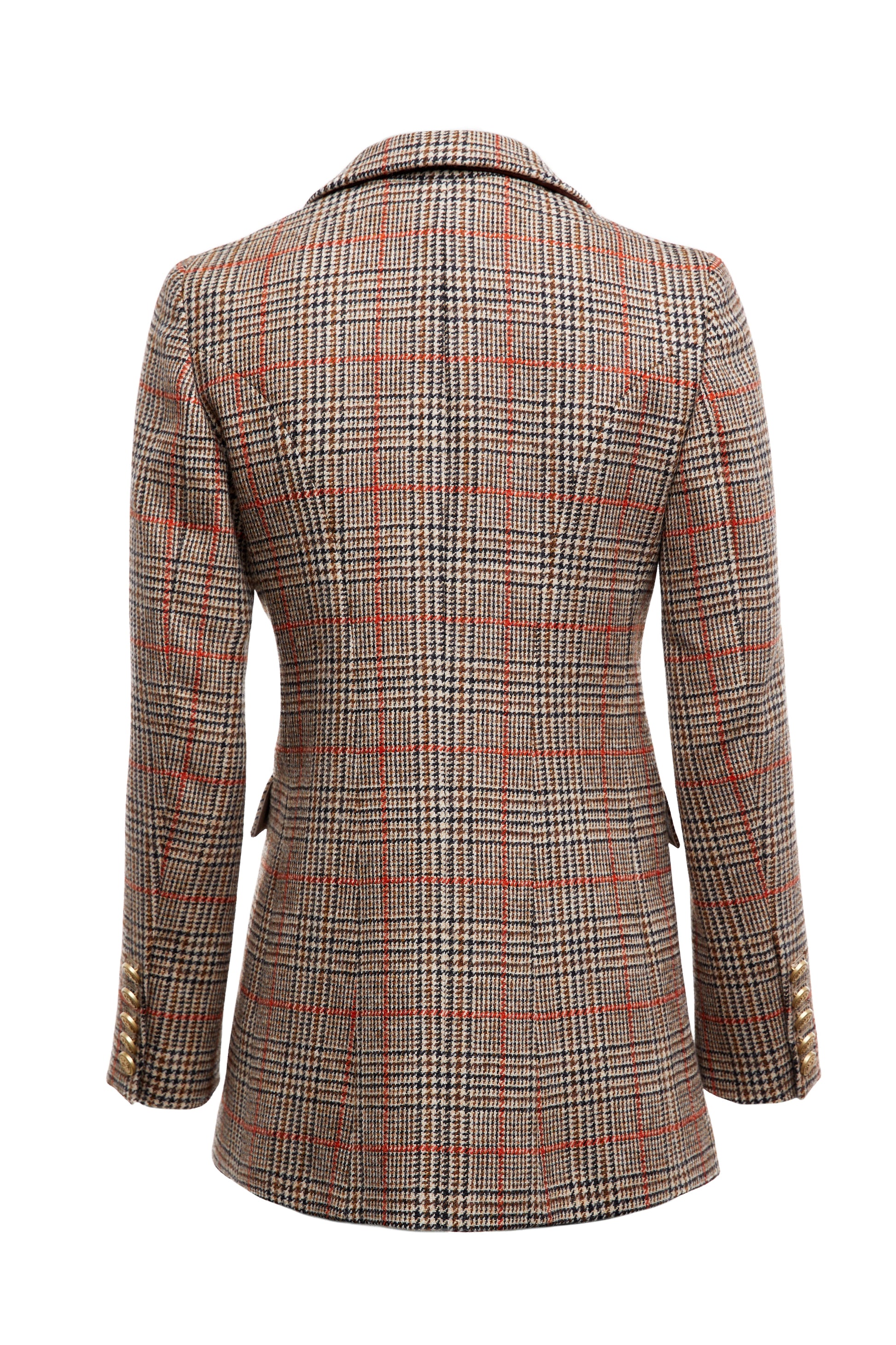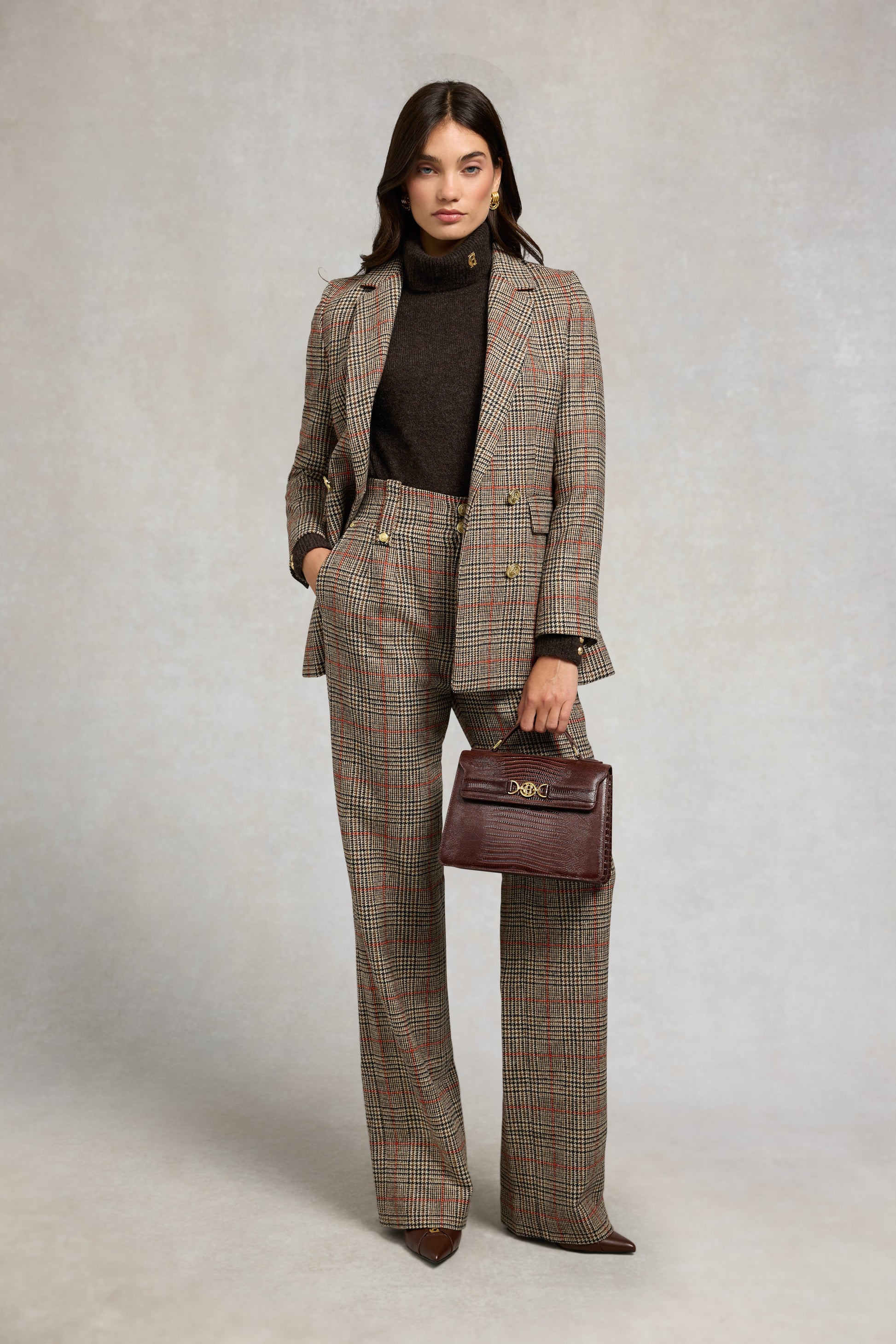 Designed to create a sharp tailored silhouette worn open or closed. the Double Breasted wool Blazer has been handmade in the UK. Crafted from our iconic tweed fabric & fully lined with a luxury stretch lining for extra comfort. this piece is a must-have staple for your wardrobe. With bold lapels & subtle hip pockets. each blazer has been elevated with HC signature gold hardware to the front and cuffs.