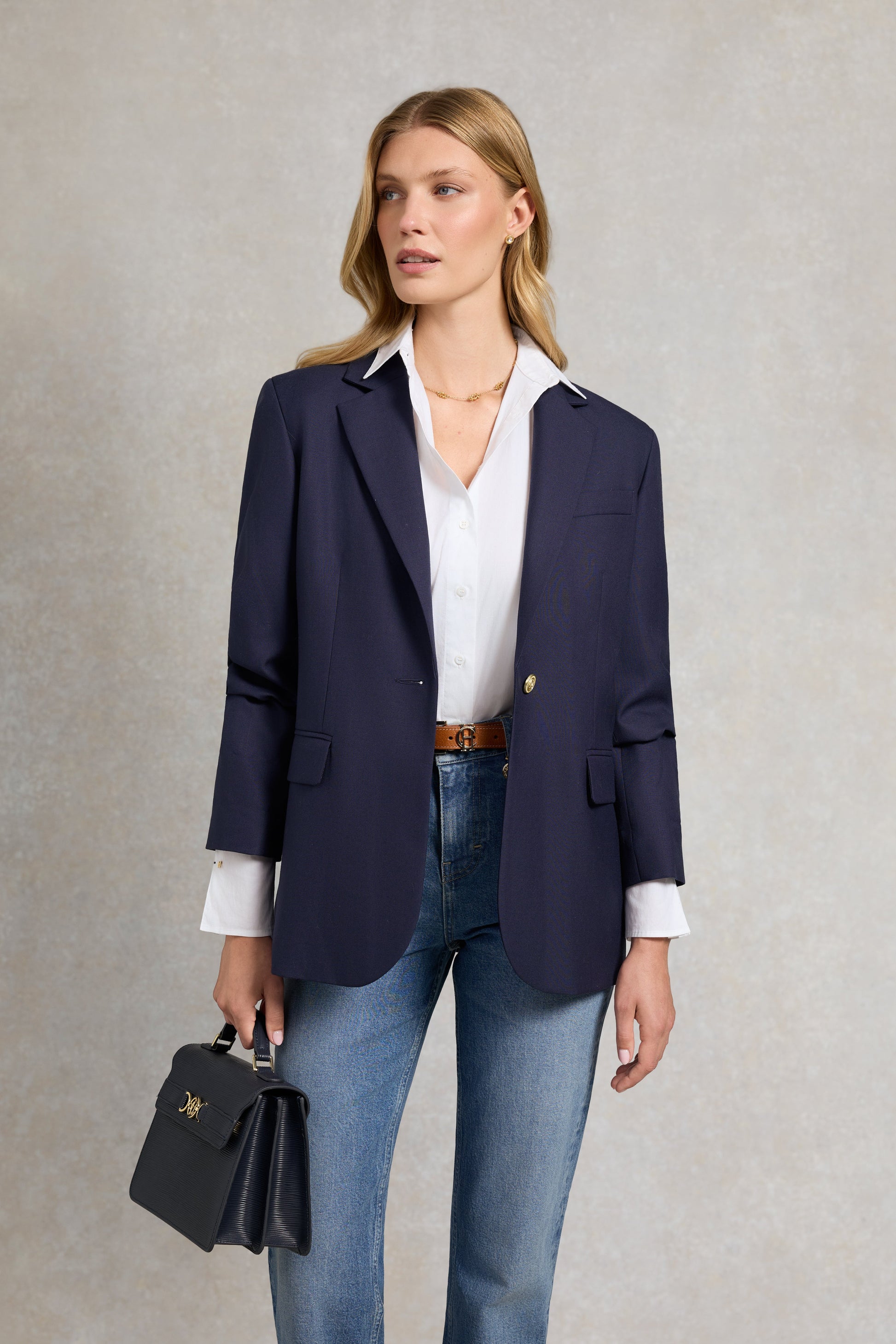 A fresh take on a wardrobe staple. this Classic White Button Down Shirt blends timeless tailoring with feminine detail. It features a relaxed boxy fit and a crisp button-down front with a classic collar. Decorative pleated sleeves add a subtle statement. while a box pleat at the back enhances the silhouette with ease of movement. Finished with signature HC embroidery on the body and gold branded hardware at the cuffs and back yoke. this elevated essential brings refined charm to everyday dressing.