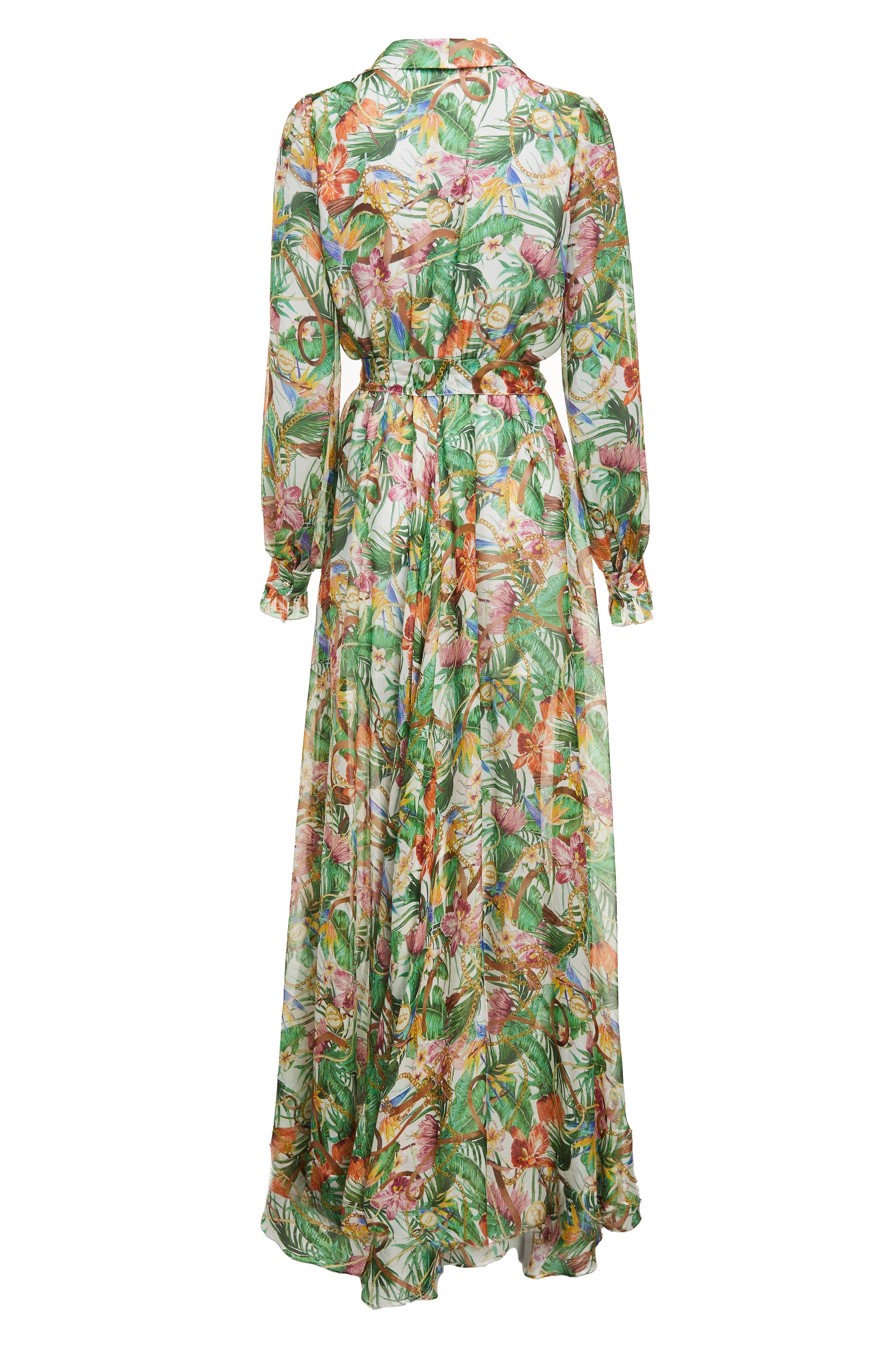 This stunning full length maxi dress is made from sumptuously soft pure silk with a meticulously hand drawn design inspired by tropical paradises. This wrap dress is made of billowy long sleeves accompanied by a subtle HC button closure with ruffled edging along the hem and cuff.