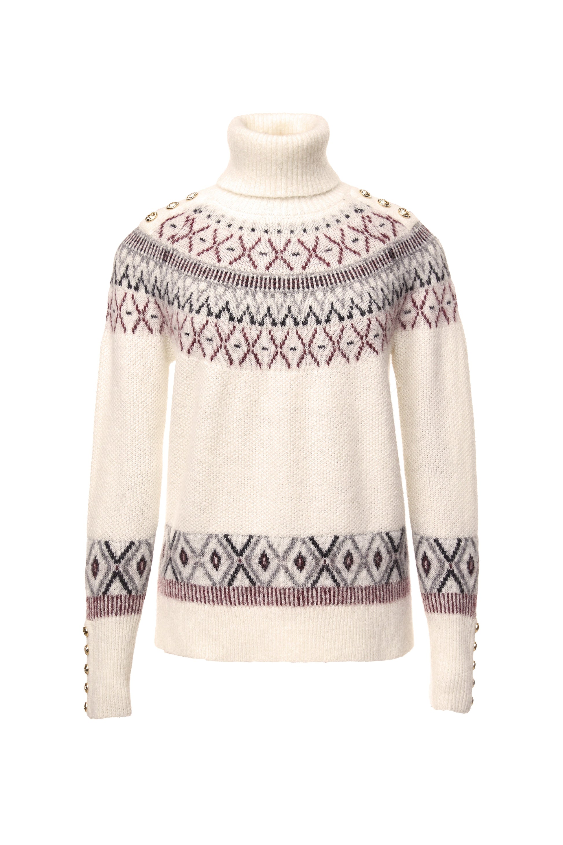 Designed with a longer length and super high roll neck. the Fairisle Knit's relaxed look and feel is perfect for pairing with jeans for an elevated everyday outfit.Created from an extra soft yarn with a traditional 'Fairisle' design. this knit is a timeless piece for your wardrobe.Detailed with our iconic gold hardware on both the cuff and shoulders.