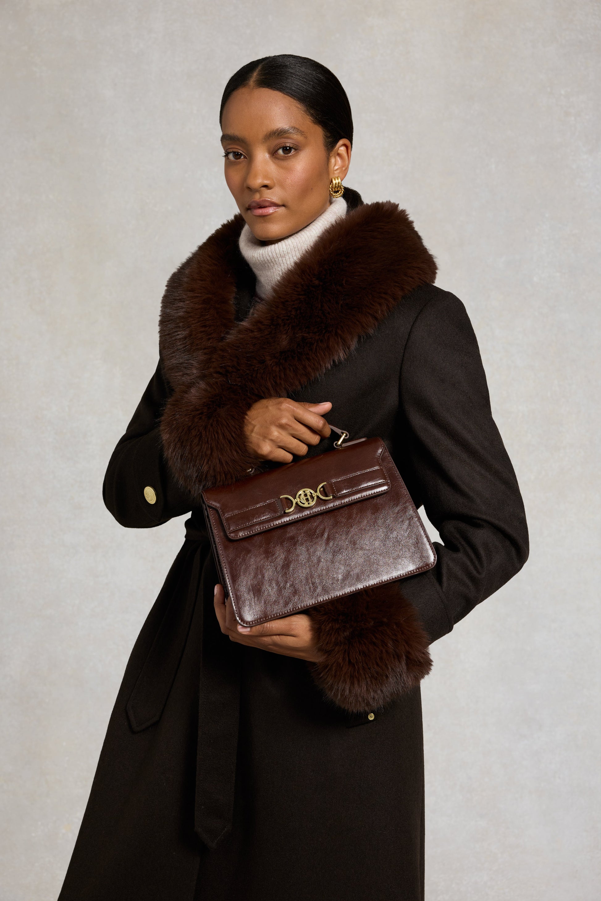 Wrap yourself in timeless elegance with our premium faux fur shawl. crafted from beautifully long. plush faux fur in a rich autumnal palette. Designed with a hidden hook-and-eye fastening for a seamless drape. it can be styled open or secured for extra warmth. Finished with a delicate gold HC charm. this versatile piece is the perfect way to add a touch of luxury to both day and evening looks.