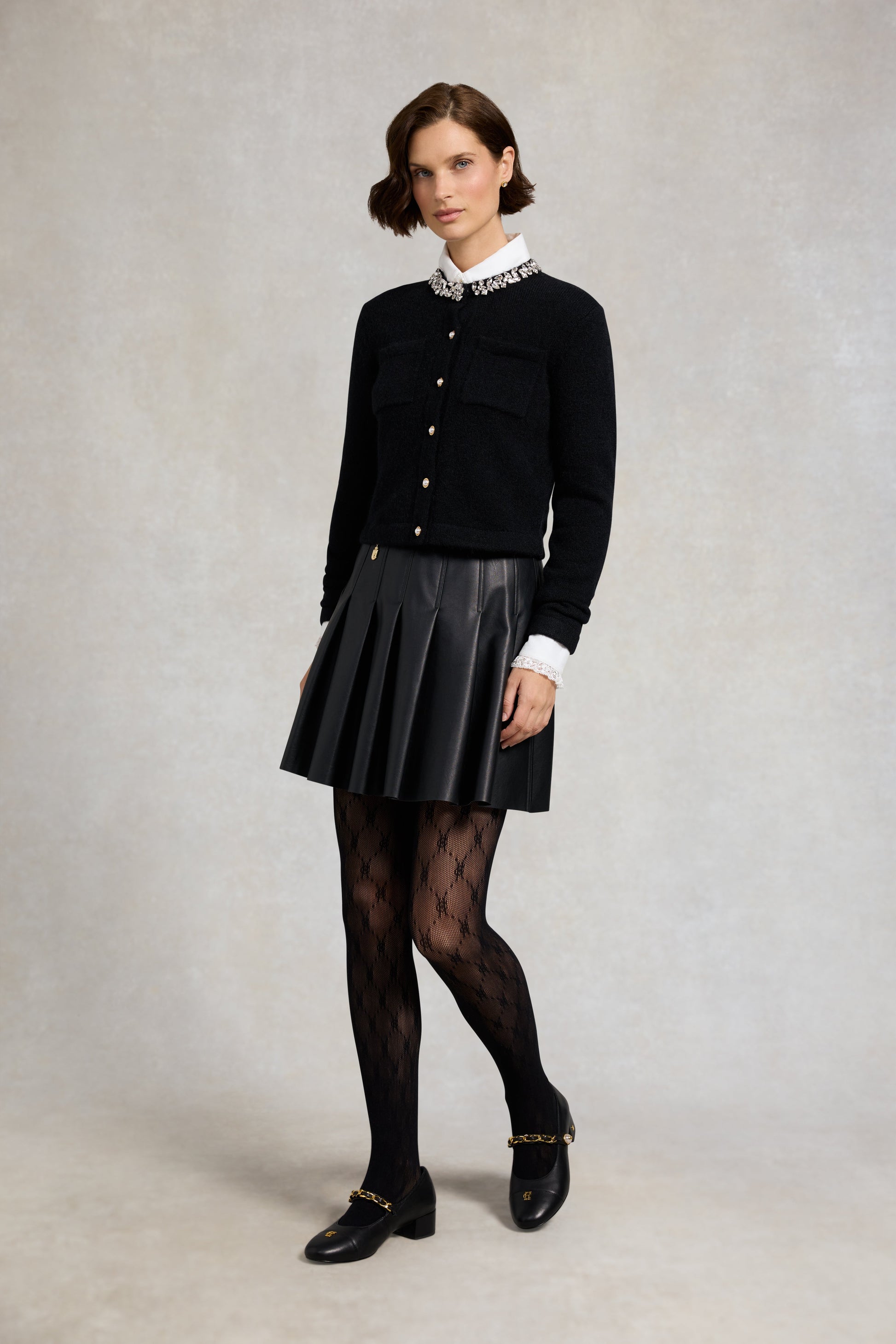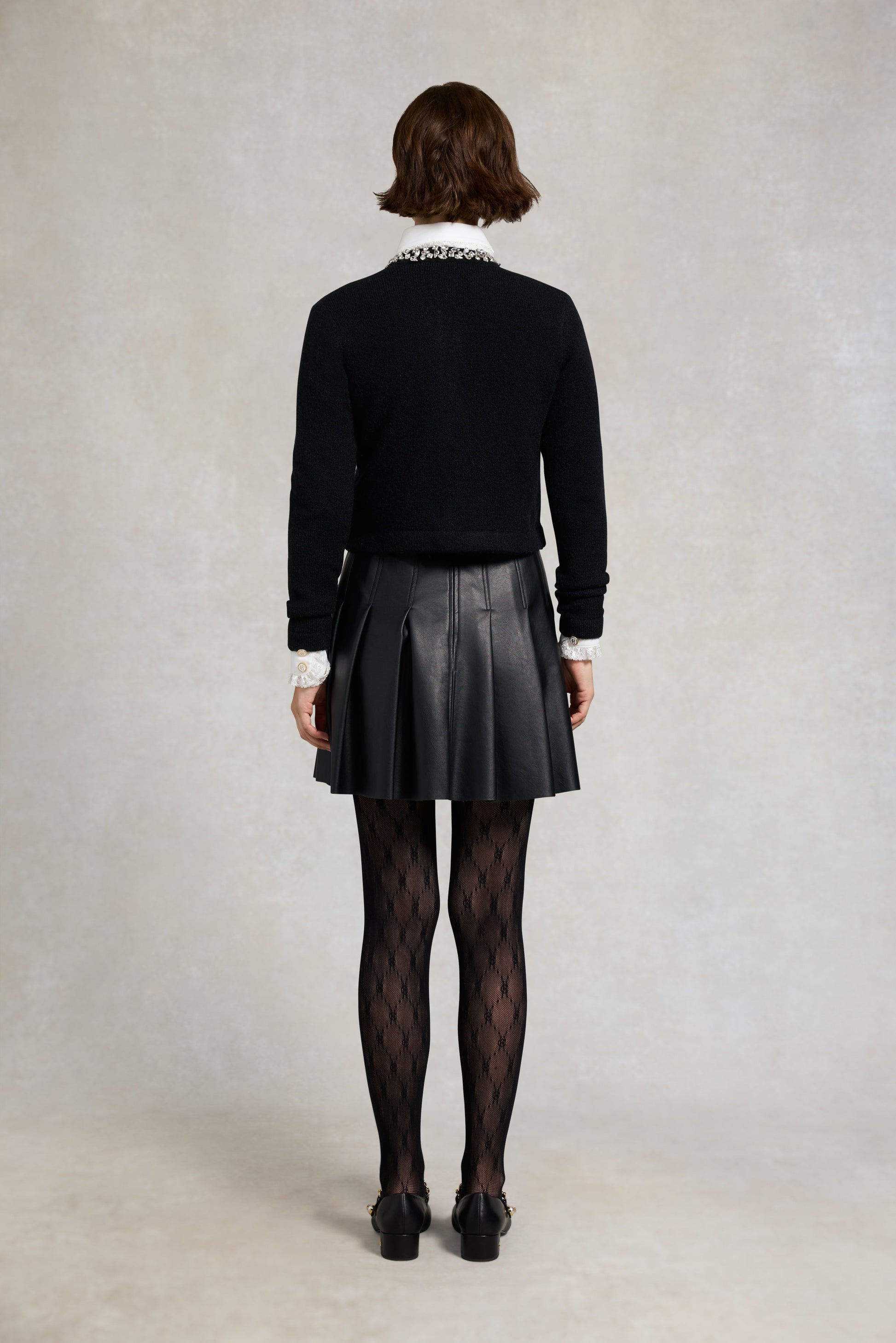 Introducing our vintage-inspired pleated mini skirt. a chic and modern twist on a timeless classic. This mini skirt features elegant knife pleats all around. offering a playful yet sophisticated silhouette. Crafted from super supple and soft faux leather fabric with a refined grain effect. it provides luxurious comfort and style. The extra thick leather topstitching adds durability and a touch of boldness. while the signature gold metal hardware elevates the overall design. Perfect for making a statement. this skirt is a versatile piece that seamlessly blends vintage charm with a modern edge.