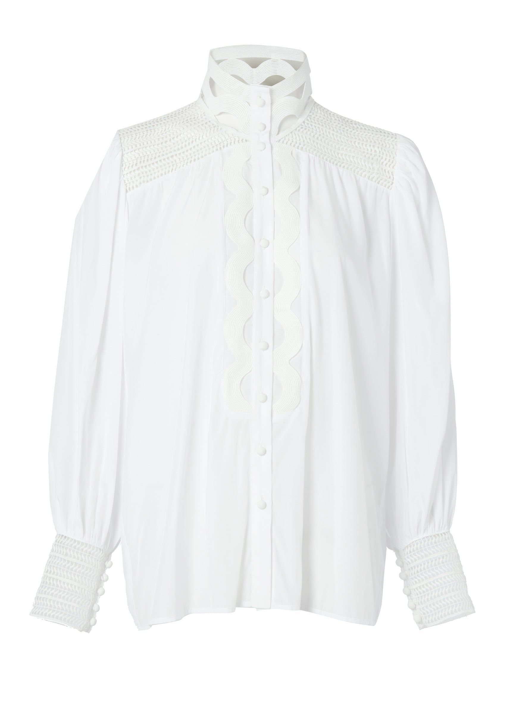Designed with a beautiful floaty and relaxed fit. this shirt is both classic and elegant. Created from a delicately sheer fabric with gorgeous ricrac style inserts. the lace patterns create a couture look & feel. With a statement high neck and slim fitting cuffs. this shirt is ideal for adding to your holiday wardrobe.