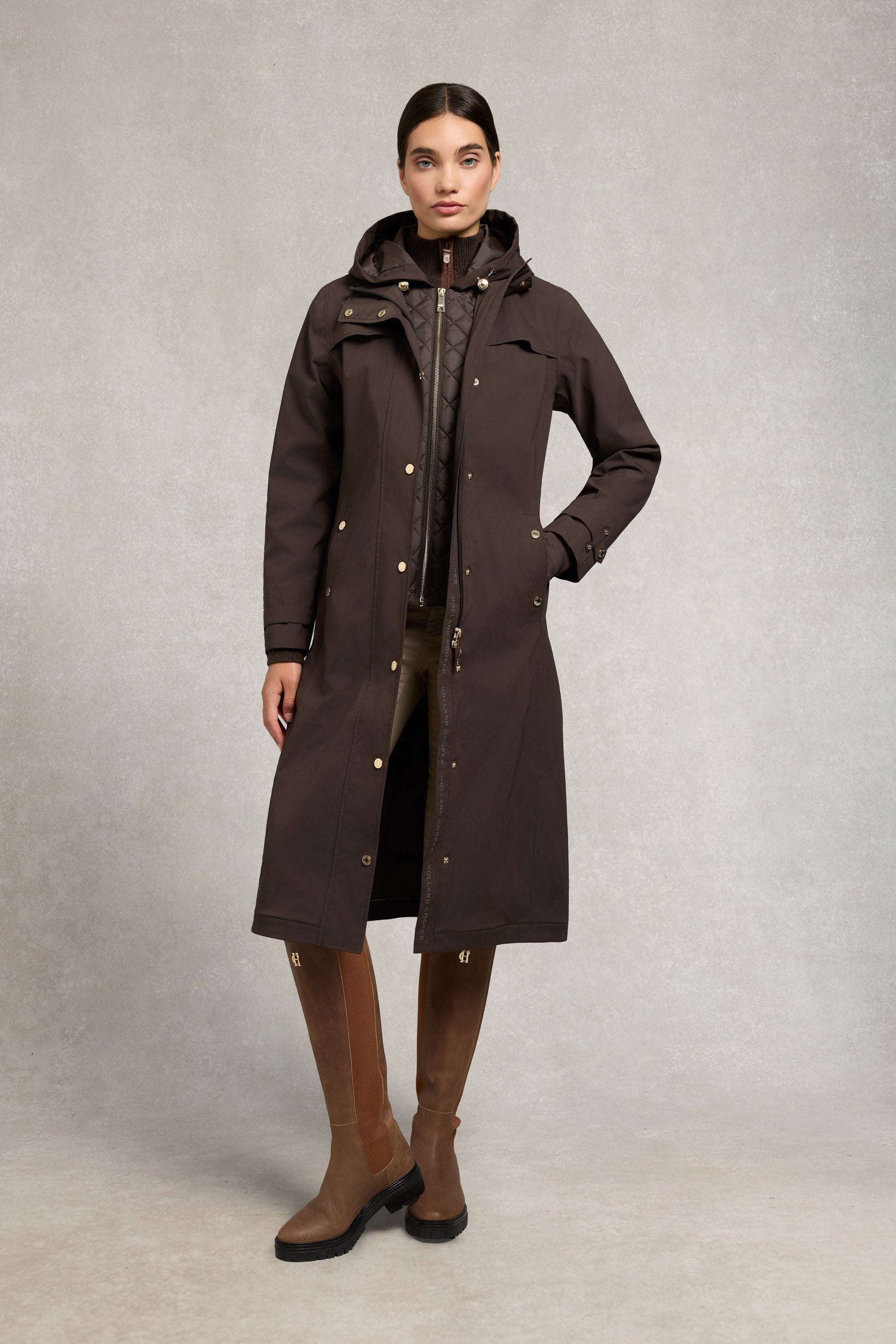 Elegant and streamlined. this long-length rain coat is a sophisticated solution for wet-weather dressing. Expertly crafted from fully waterproof materials with taped and sealed seams. it offers reliable protection with a refined. technical edge. A built-in padded vest adds discreet warmth without bulk. making it ideal for layering through the seasons. Designed with practicality in mind. it features spacious lower welt pockets and is finished with signature gold HC hardware—bringing a polished touch to this modern outerwear essential.
