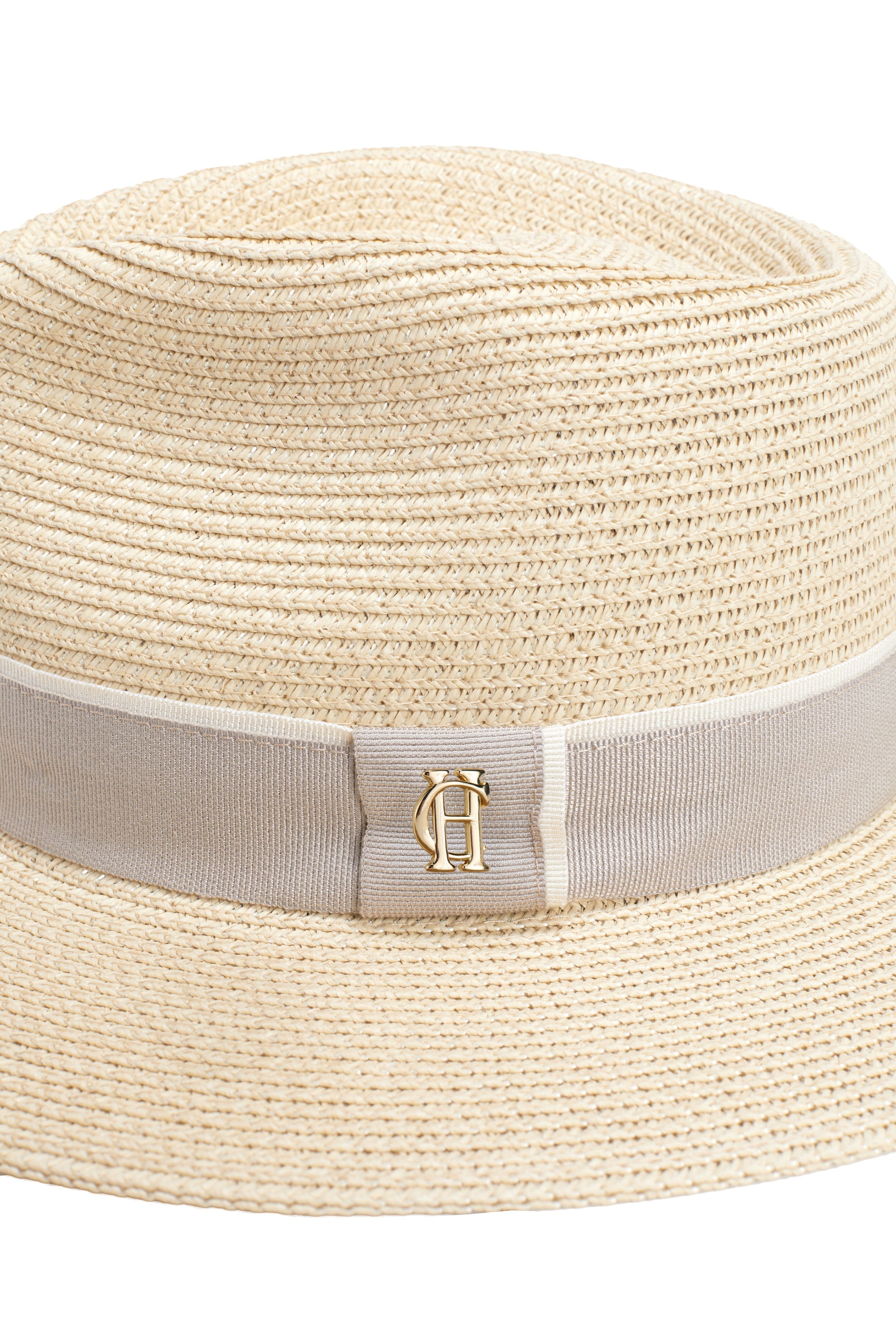 Endlessly versatile. our new sunhat effortlessly complements all your favourite summer ensembles. Hand crafted from the finest beige straw. the shorter brim ensures a contemporary look. Detailed with cotton trim and gold. HC rivet.