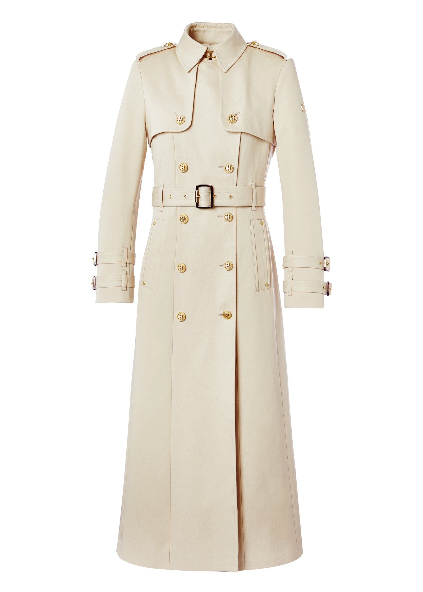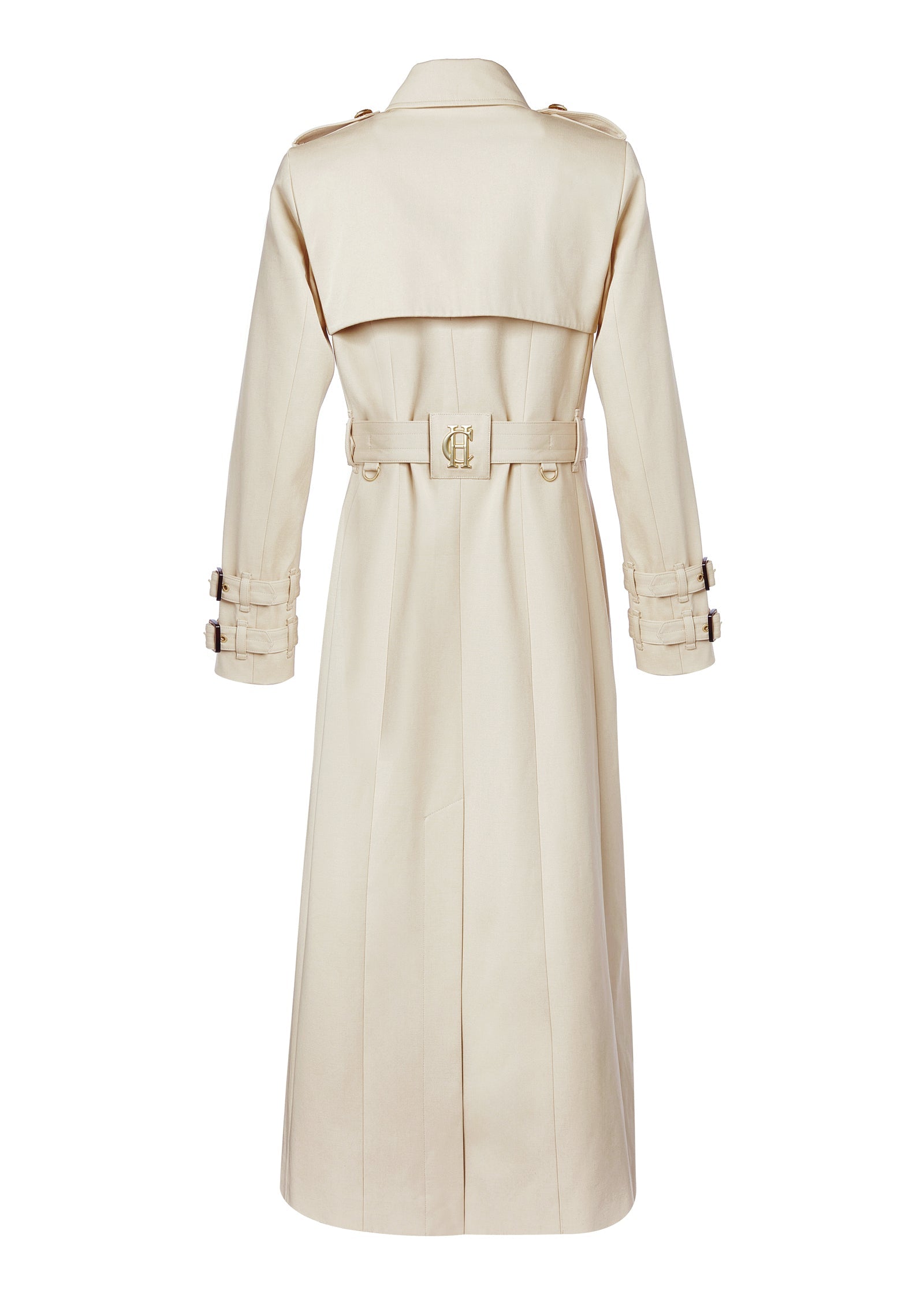 The detachable belt features traditional D-rings and multi-row topstitch detailing allowing you to customise your look. Adorned with matte gold hardware. extra thick topstitching and a fully embroidered back label. every detail of this trench coat reflects our commitment to quality and sophistication.