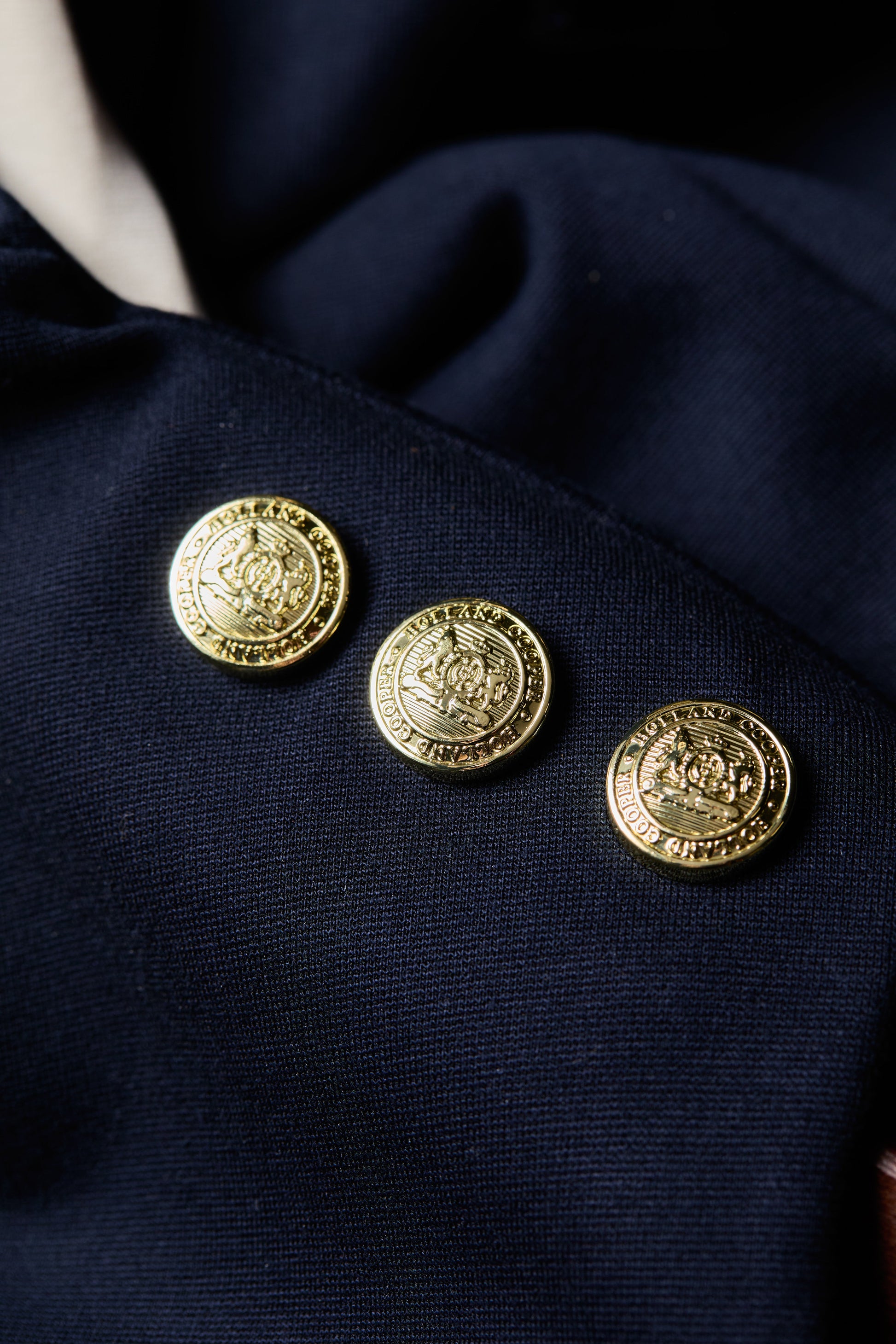 Crafted from our luxuriously soft interlock fabric. this all-in-one silhouette features our signature architectural shoulders and is adorned with refined HC gold hardware detailing.