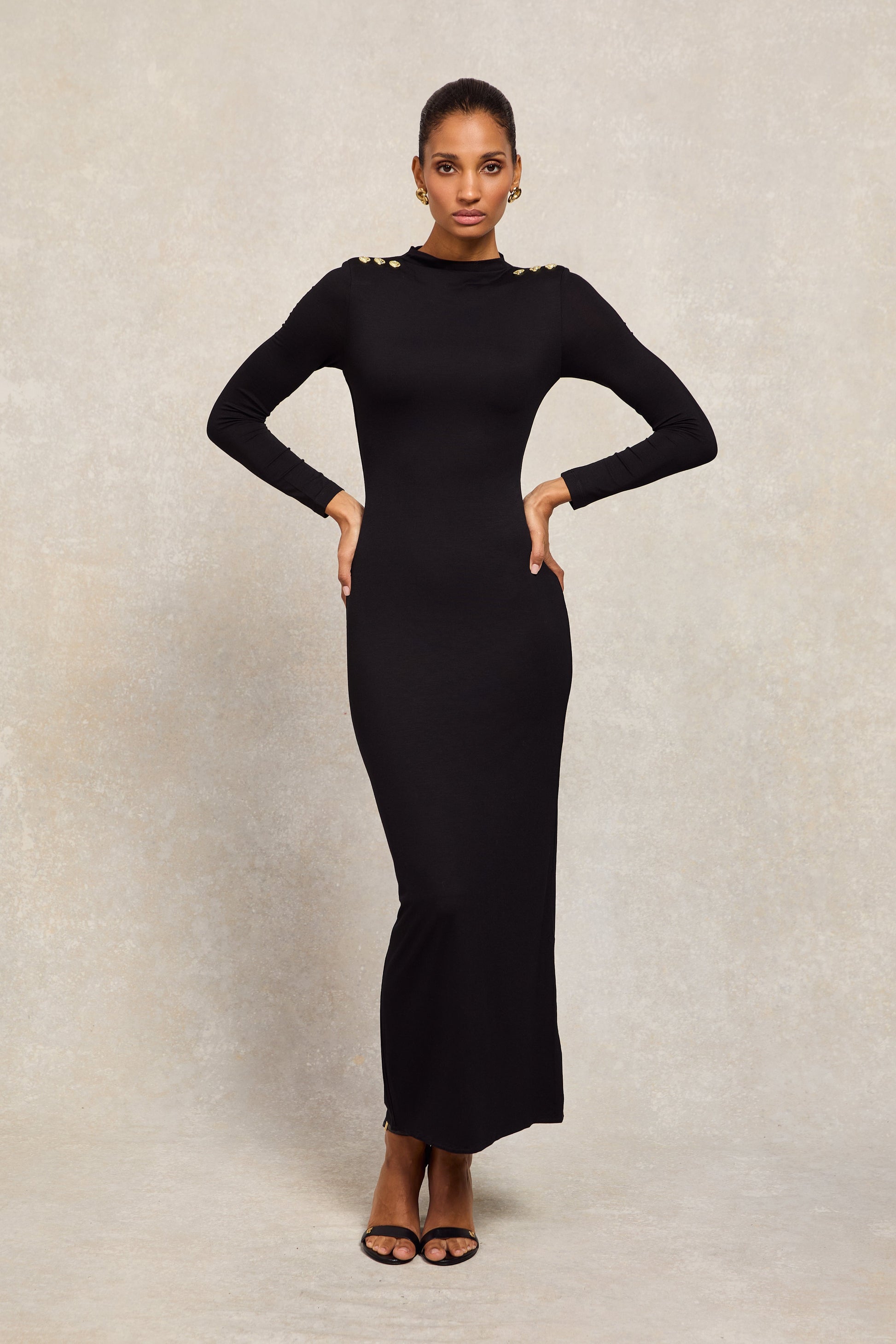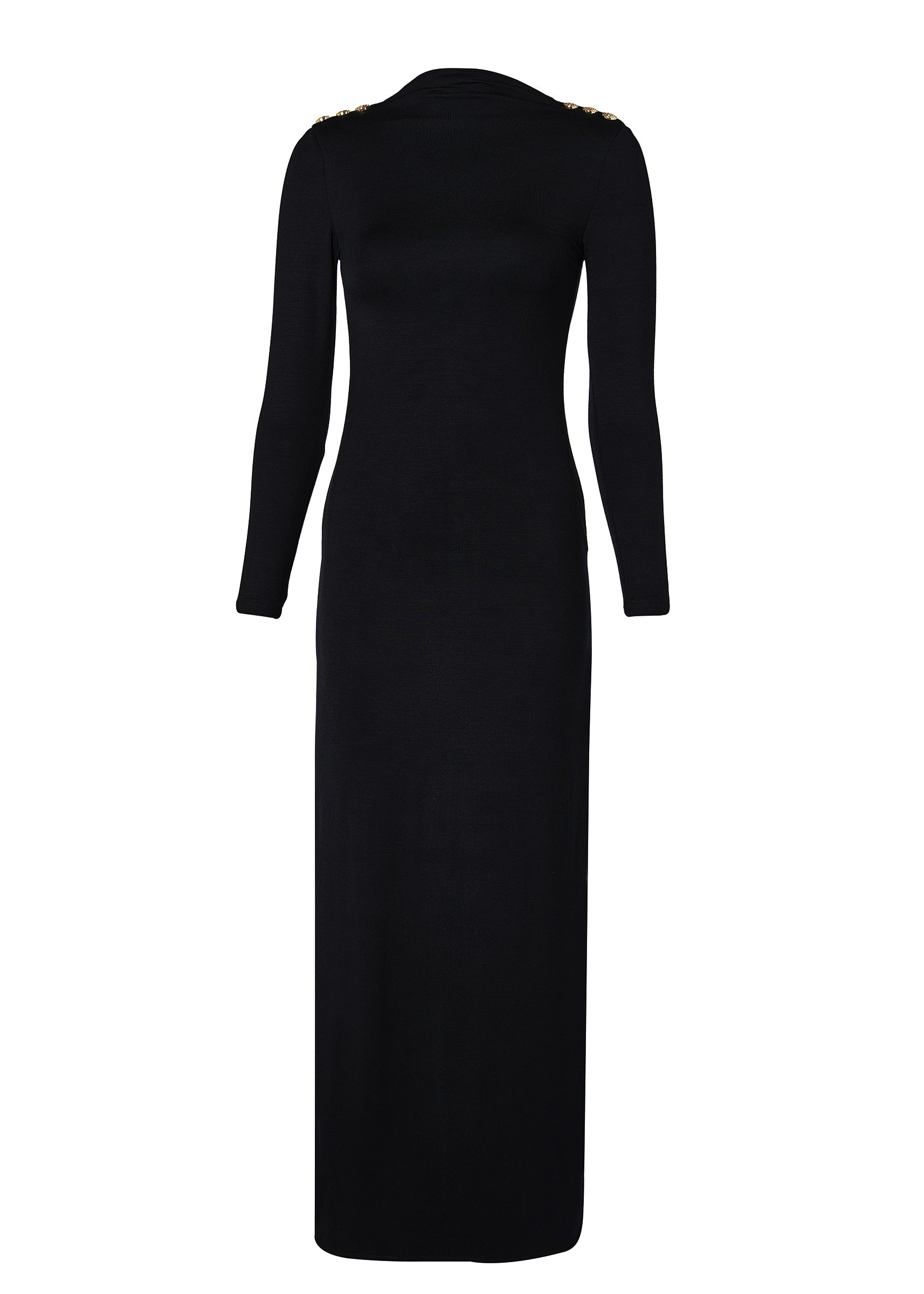 Designed with an elegant maxi length. this dress has been crafted from a sumptuously soft fabric. With a double-layered composition to ensure a flattering silhouette. the detachable shoulder pads adds an elevated touch. Detailed with a high neck and long sleeves with our signature hardware. this dress is truly elegant and understated.