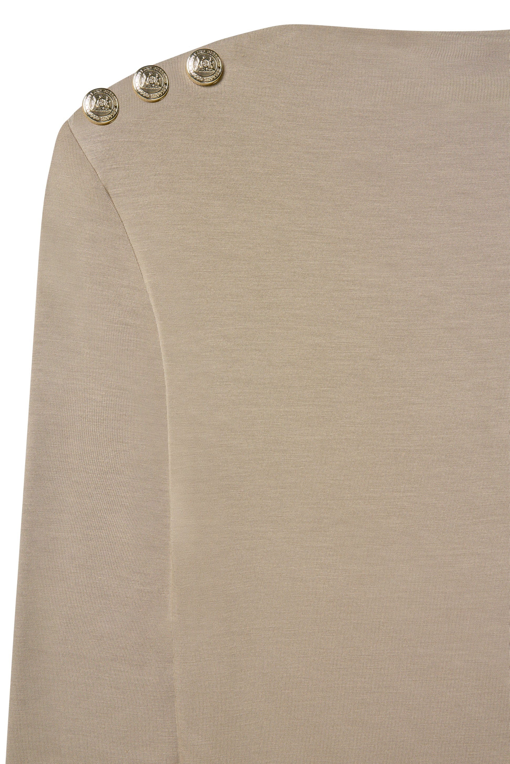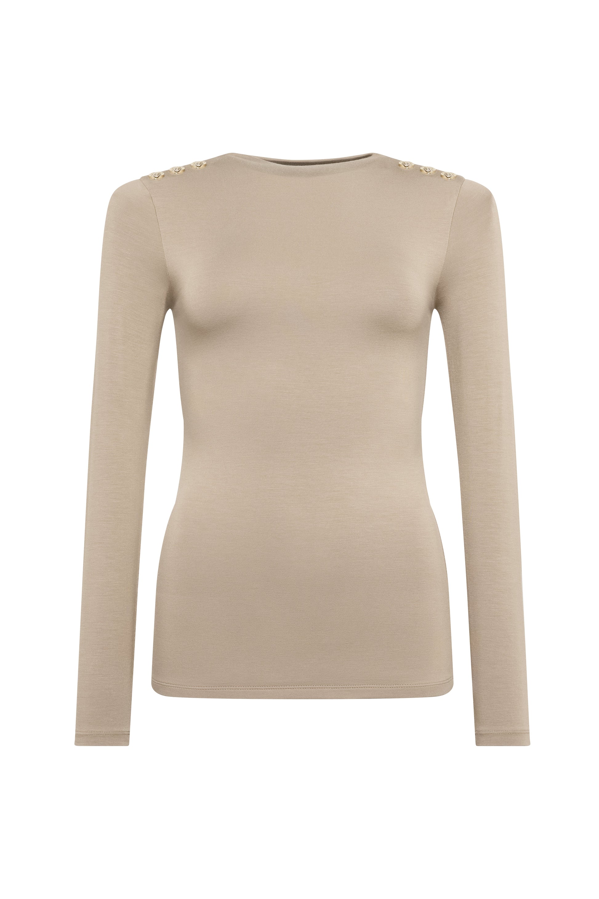 Exuding effortless sophistication. the Harper Long Sleeve Top in natural combines luxurious comfort with refined detailing. This double-layered piece offers elegant draping and exceptional wearability. Distinguished by signature crested rivets at the shoulders. it's an elevated essential that seamlessly transitions from day to evening.