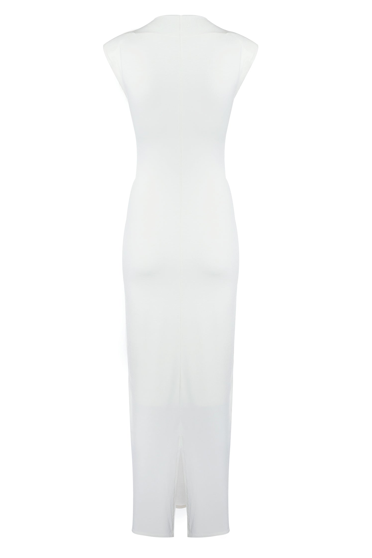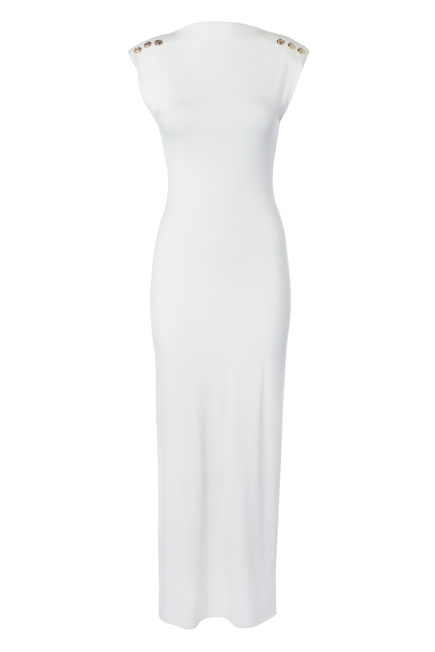 The slim fit maxi dress is made from luxuriously soft fabric with lightly padded shoulders. giving it a beautiful feel and elegant silhouette. The fabric is double layered to not only contour the body but to ensure the fabric isn't transparent. Detailed with our HC signature gold hardware on the shoulders.