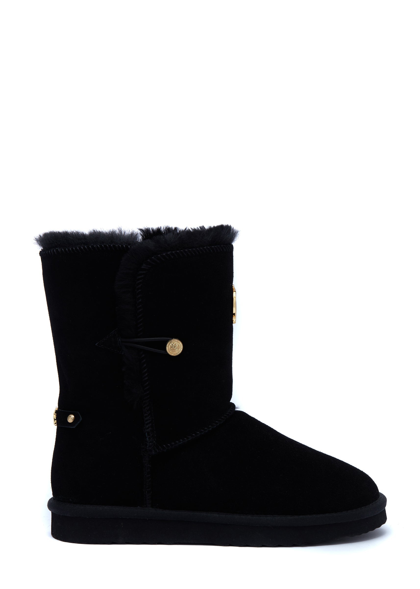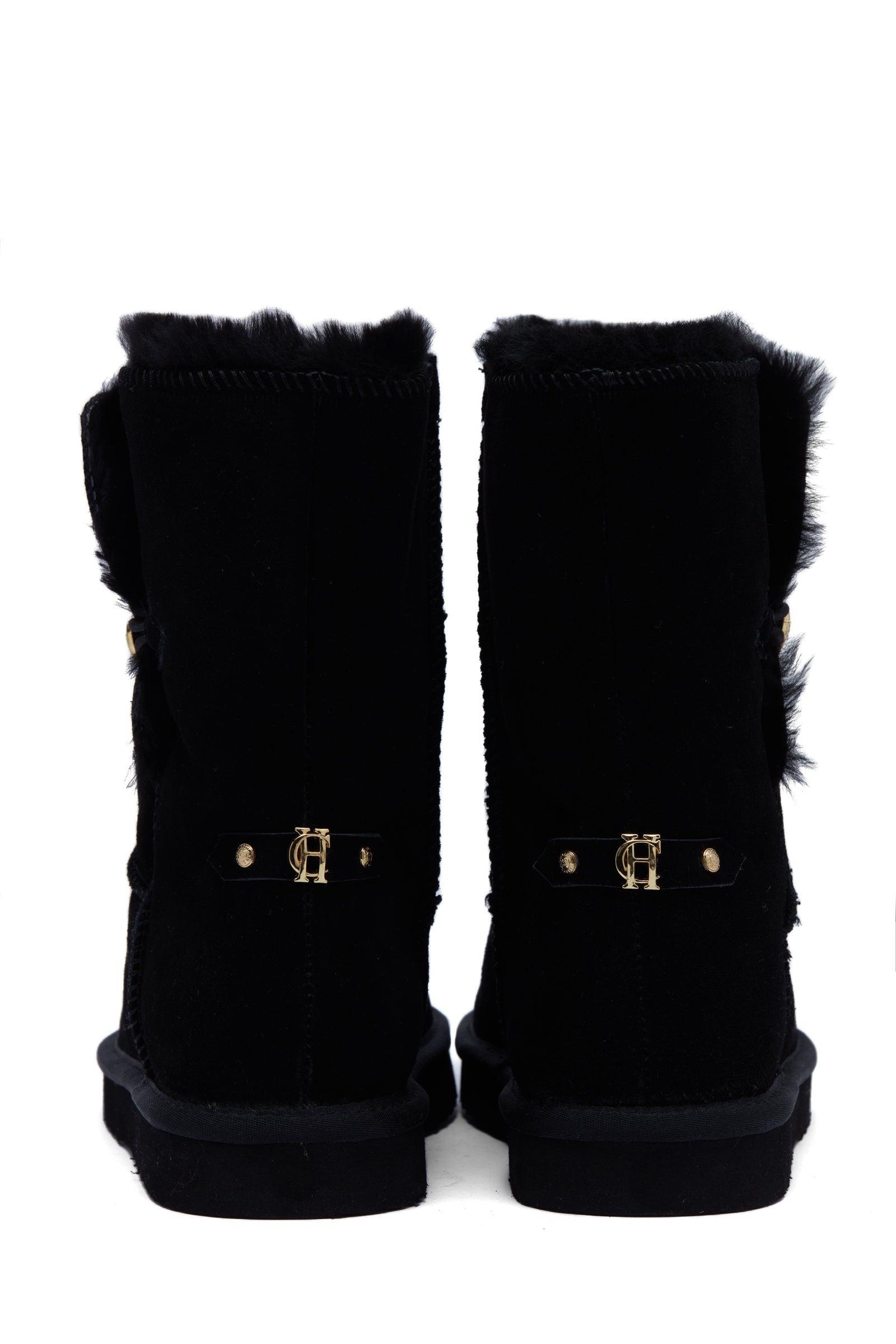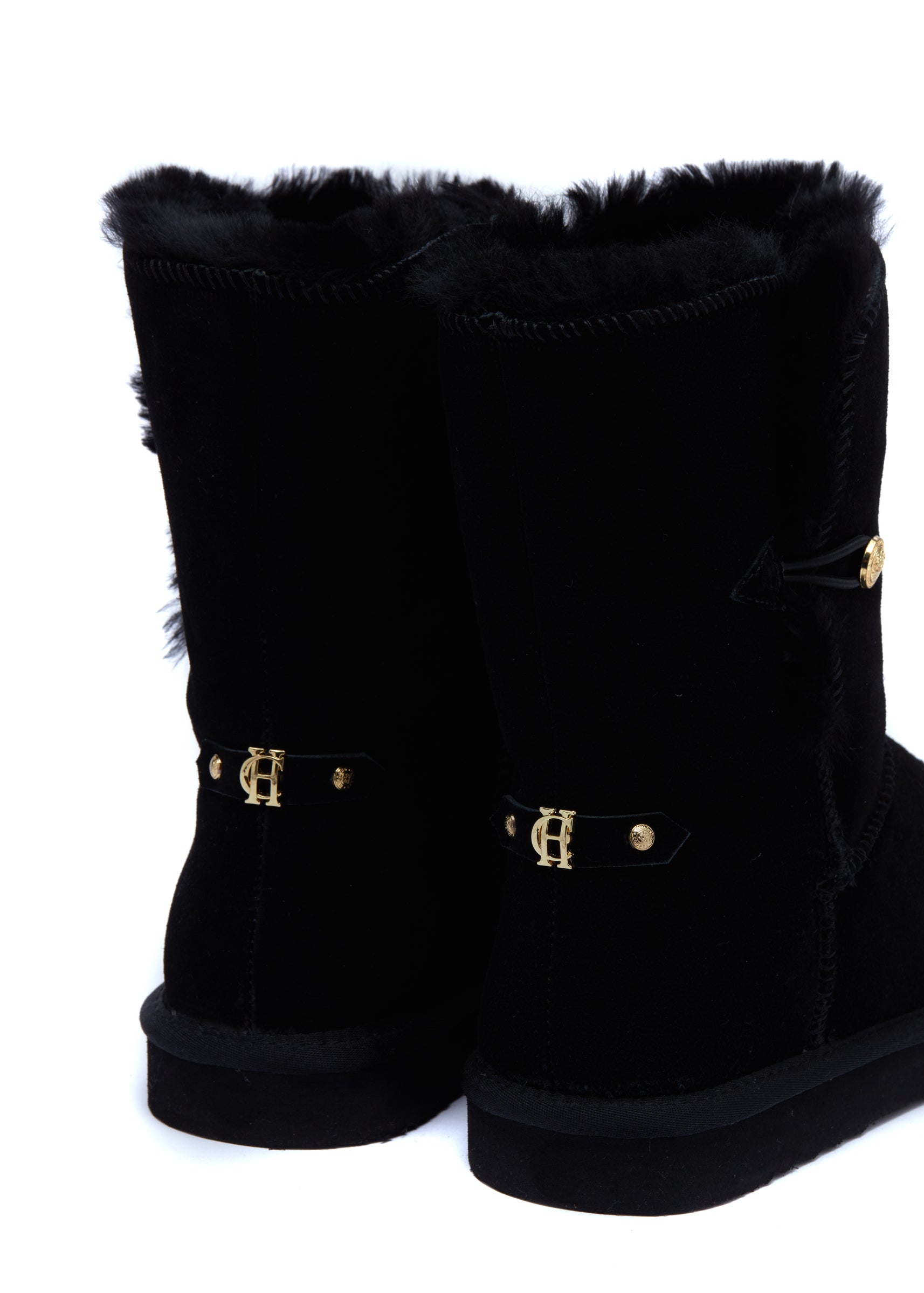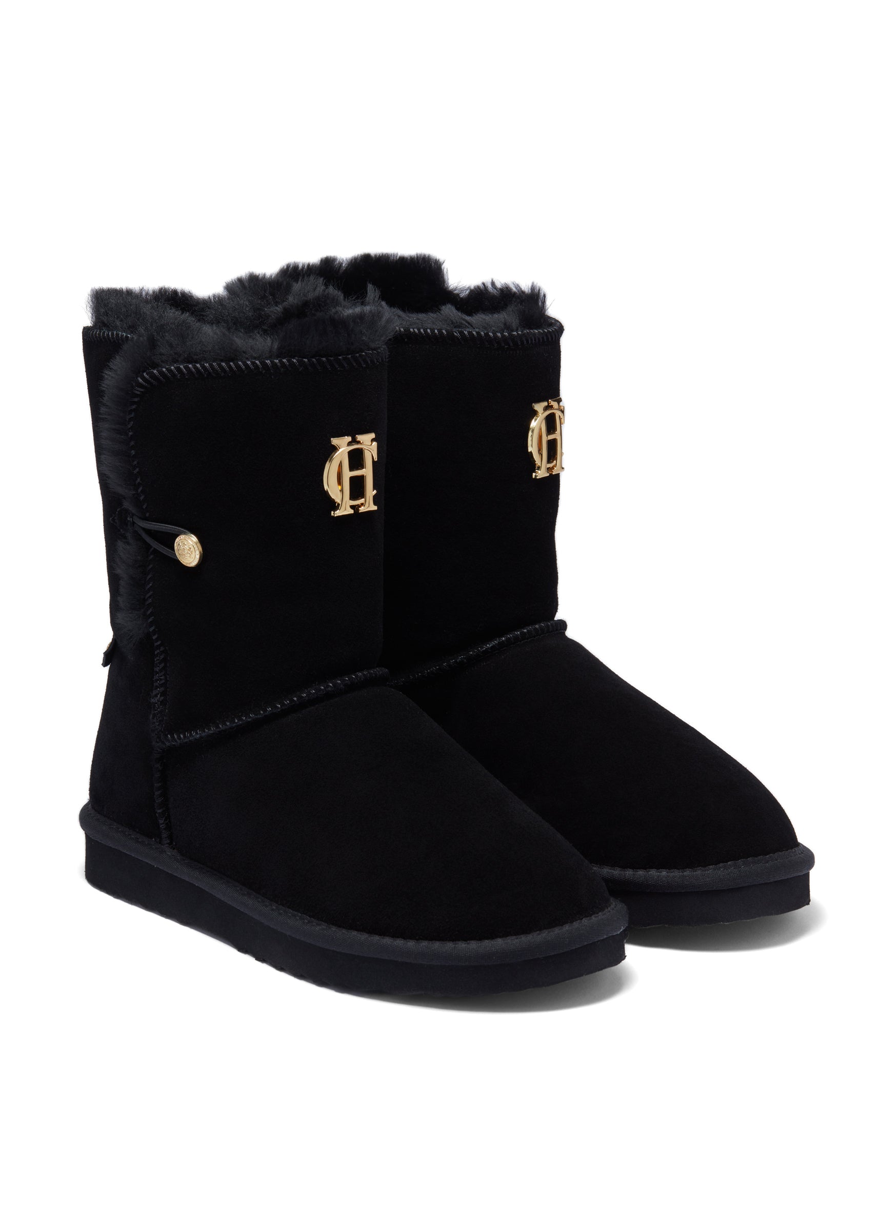 Embellished with a HC button closure. these slipper boots have been created from soft and supple suede. With a full shearling lining and branded sole with thick tread for grip. these boots are both comfortable and cosy. Fully branded with our HC hardware and pin.