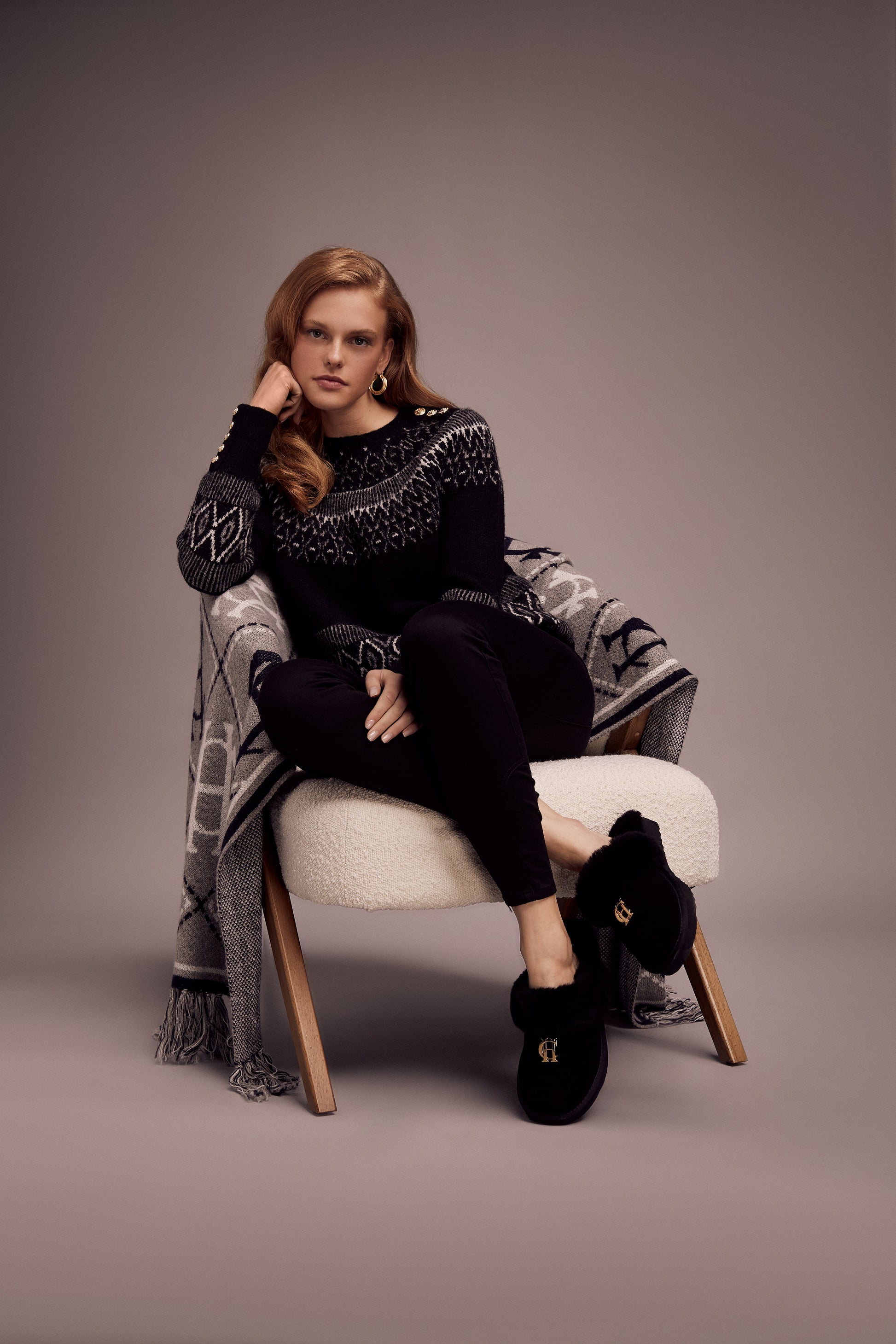 Designed with a classic mule shape. these slippers have been crafted from soft suede with a fixed cuffed collar. With an internal shearling lining and a rubber sole. they have been beautifully detailed with our HC pin.