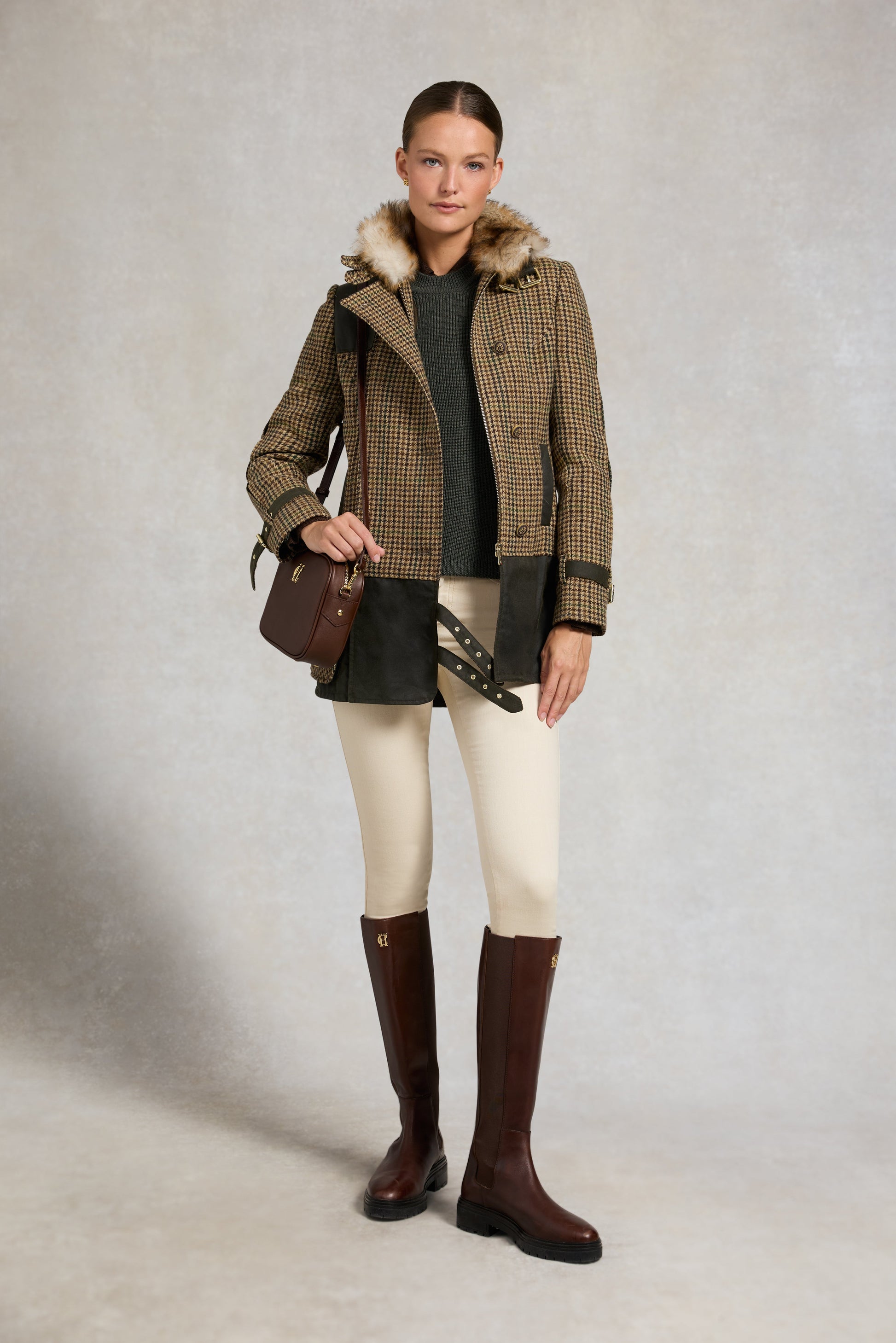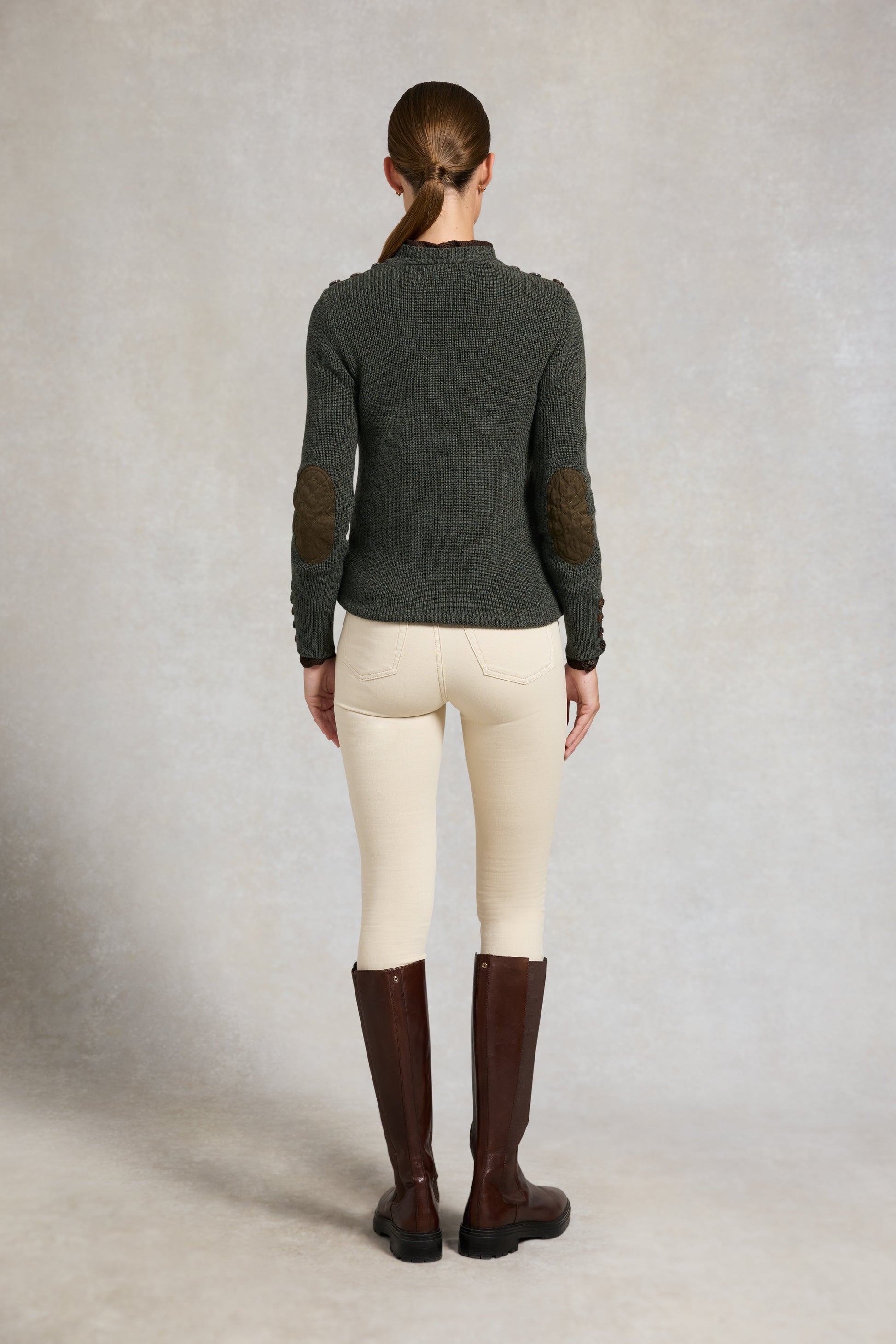 This country-style slim-fit jumper has faux suede trims that give it a distinct heritage style. Trimmed with horn-style buttons for added country chic and finished with a luxury suede gunpatch on the shoulder. Perfect paired with our field blazer or field vest and silk scarf.