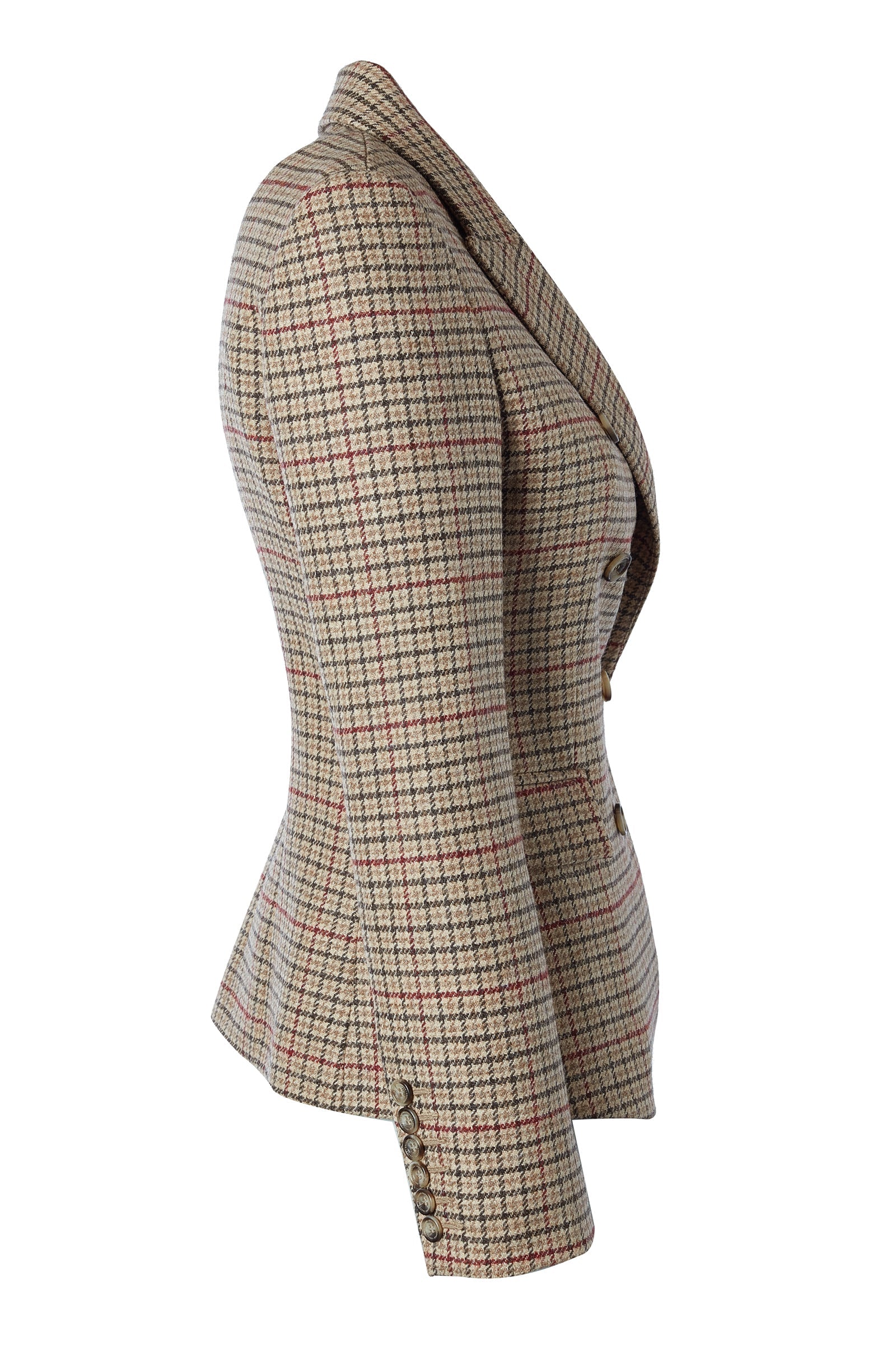 This double breasted blazer is a chic trans-seasonal wardrobe essential. Designed to create a sharp tailored silhouette worn open or closed. Fully lined with a luxury stretch lining for extra comfort and adorned with HC faux horn buttons on the front and cuffs. This blazer has been hand cut and made entirely in England using wools woven in the UK.